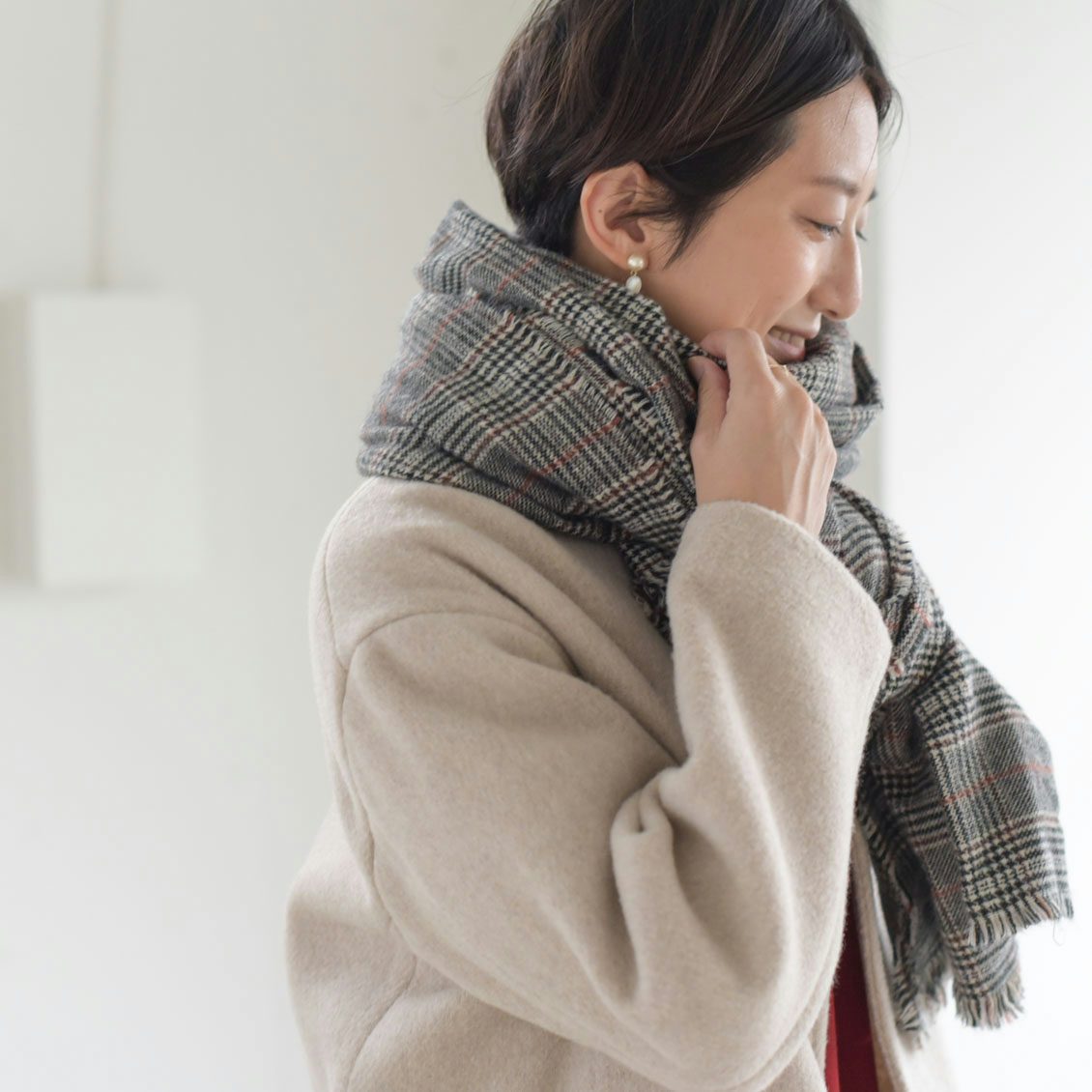 「着心地が軽くて、でもちゃんとあたたかくて、いいなぁと思いました。このミルクティーみたいな色合いも普段は買わないタイプの色なのですが、着てみたら素敵で、意外と合わせやすいですね。