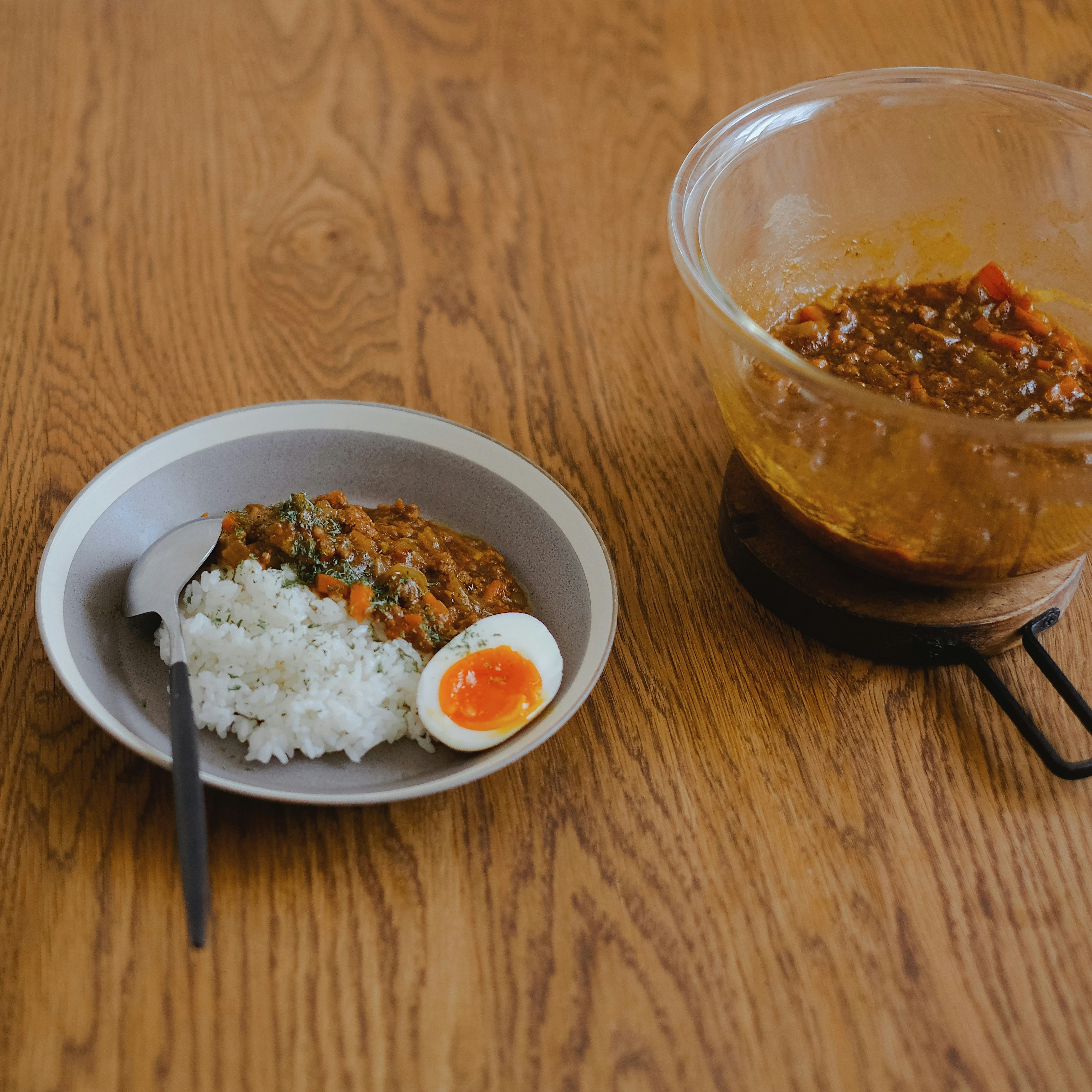 ▲ ランチのキーマカレー。電子レンジだけで調理できるレシピを検索してみるのも楽しいです◎