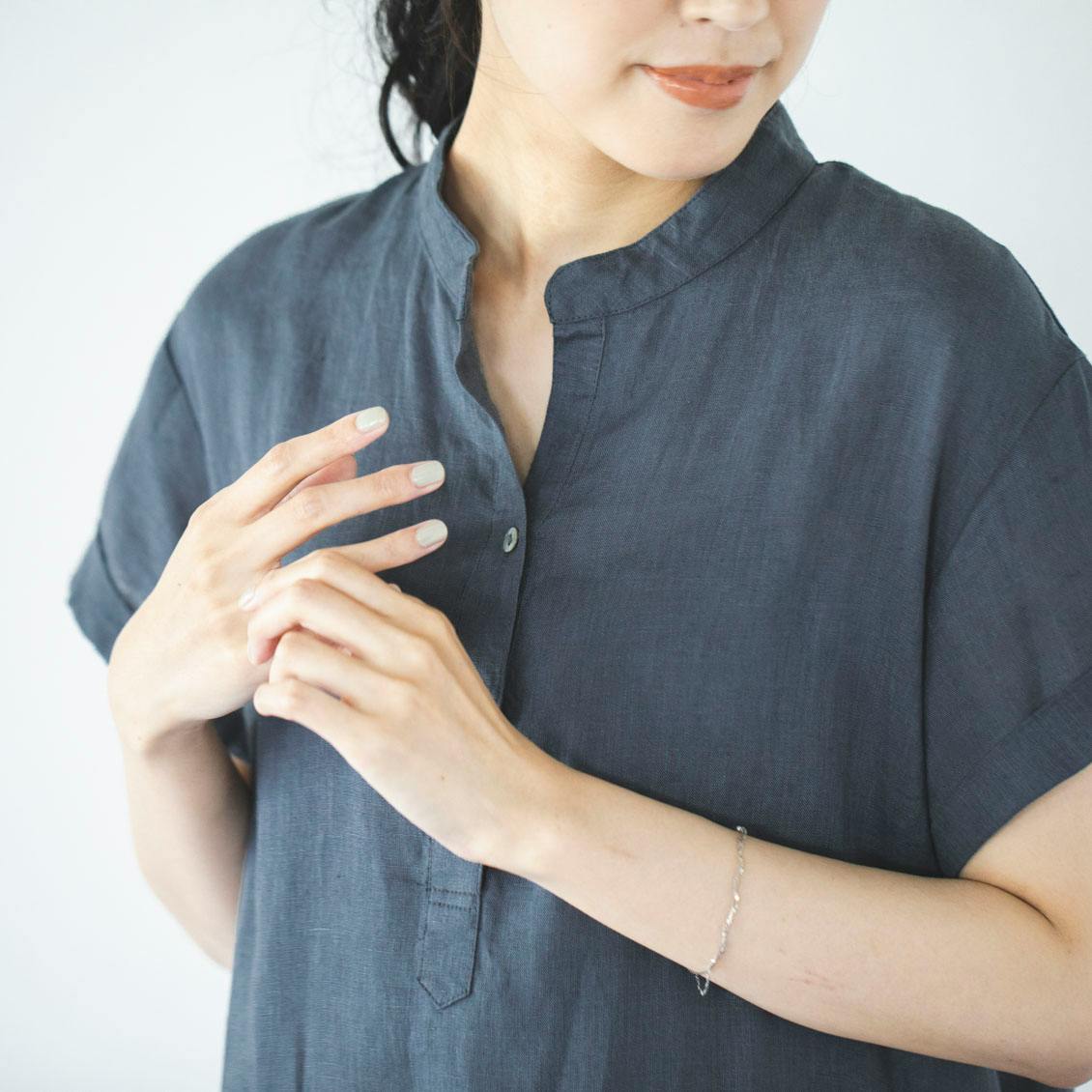 首元もよく汗をかく部分なので、風を通せるように、ボタンの数を減らし、涼やかさとぬけ感を出しました。