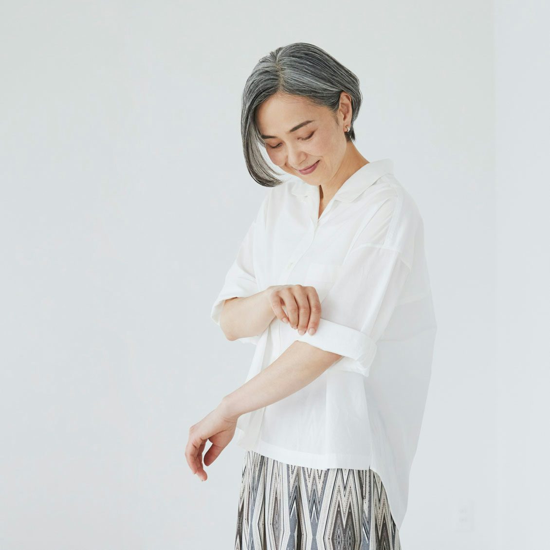 ワンピースの上に日差しよけとして羽織ったり、襟を第一ボタンまで閉めてきちんとしたり。その時の気分に合わせられる万能な大人のシャツができました。