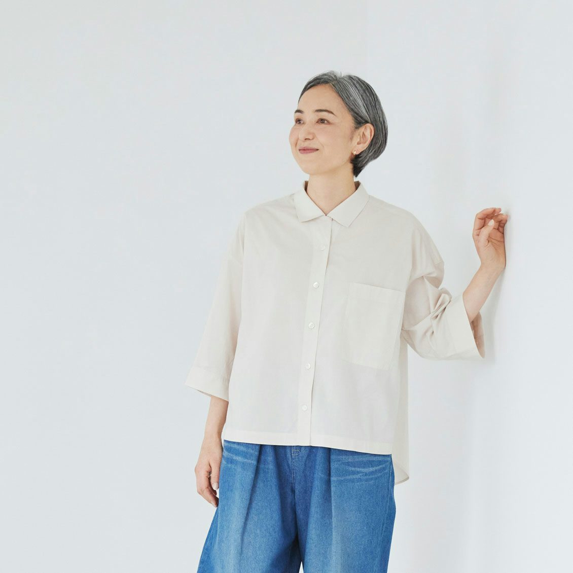 半袖のシャツは涼しげでいいけど、少し大人っぽくさせたくて8部丈の長めに設定しました。