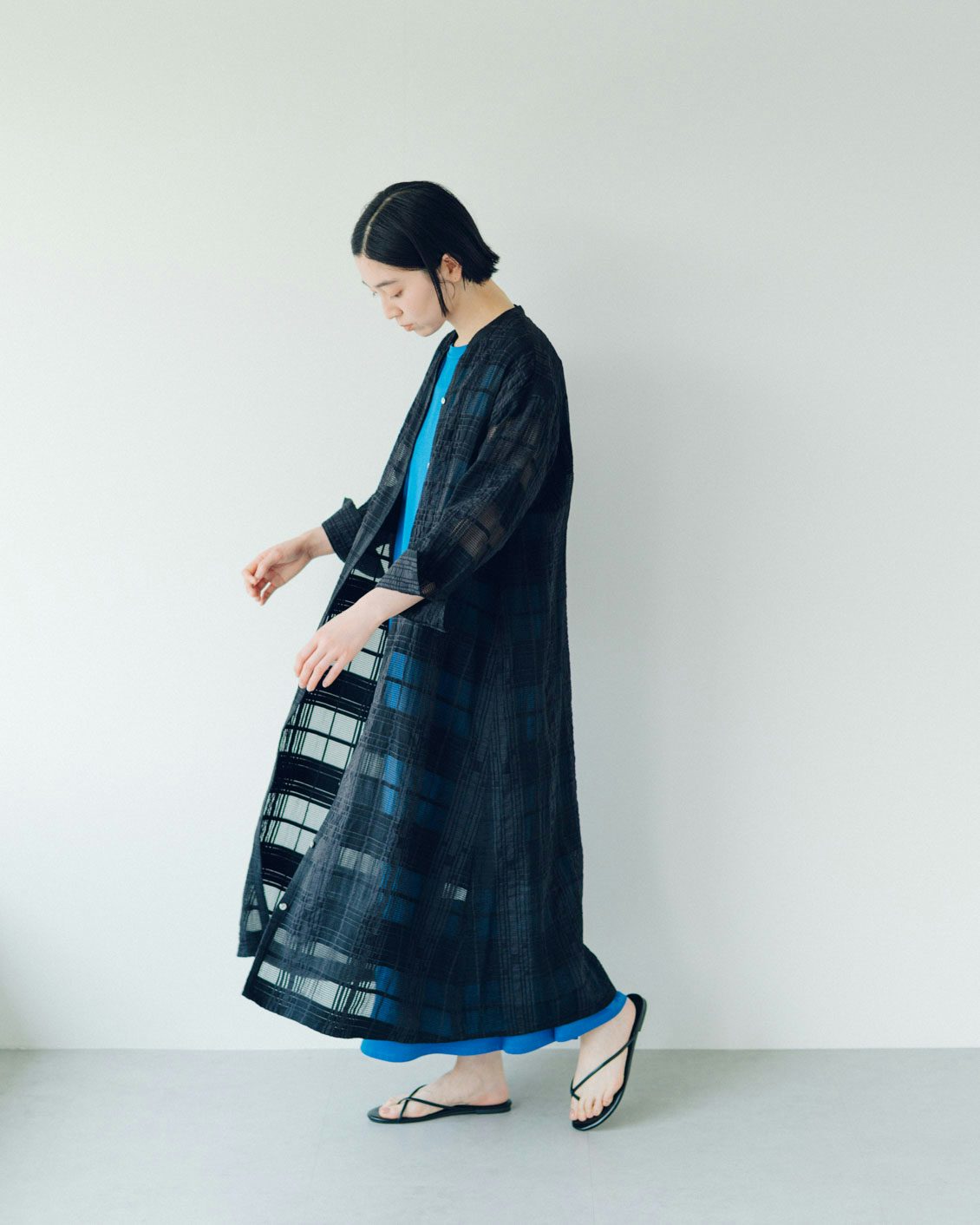 総柄だけれど、単色なので無地のような感覚でコーディネートを考えやすい。そして、チェックがランダムに走ってオーガンジーの面積が大きすぎないから、透け感が上品な印象なんです。