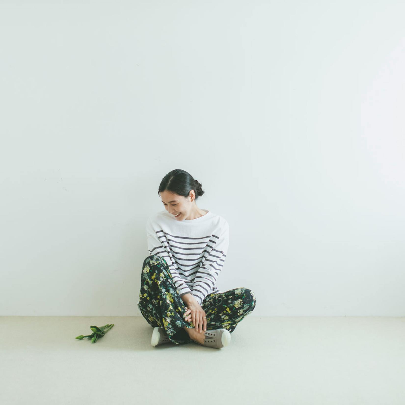 こだわりは、顔まわりが明るくみえる、パネル柄のボーダー。柄が全面ではなく余白があることで、抜け感があってどこか上品なんです。