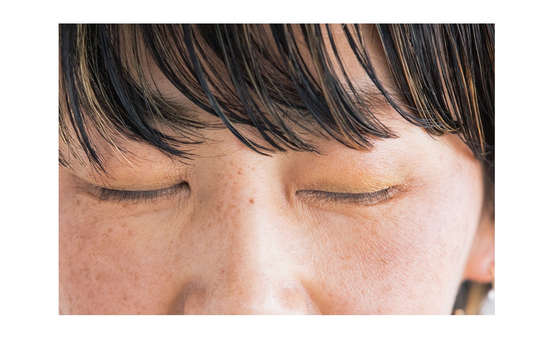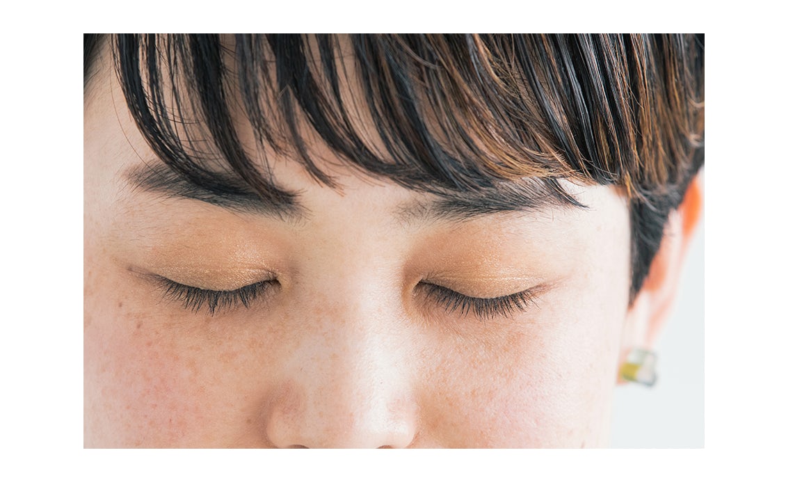 くすみがちな目元には、シンプルに「ミモザ」の単色使いがおすすめ。奥二重の幅より少し太めに、指でのせると、自然な明るさがプラスされます。