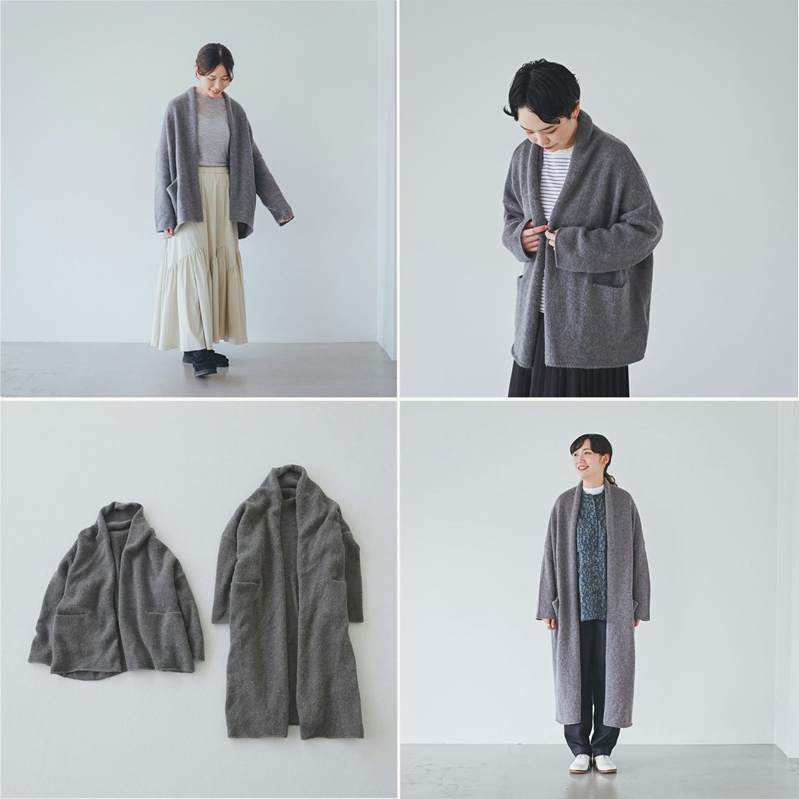 カラーは、あたたかみがあり、顔映りのいいチャコールグレー。好みやコーデに合わせて選べるよう、ショート丈とロング丈の2種類をご用意しましたよ。