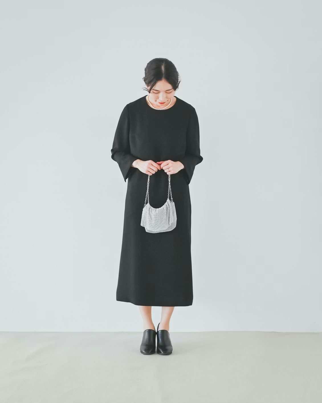 「ブラックフォーマルのワンピースを、食事会や舞台鑑賞などに行くときのイメージで着用してみました。年に数回ですがバレエやクラシックの鑑賞に行くのが好きで、ドレスアップして行く方も多いので、そんな場にもぴったりだなと思いました。