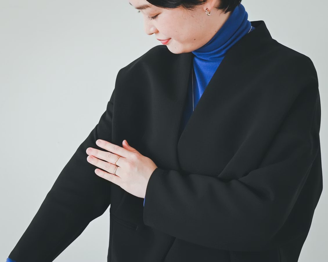 「袖がたっぷりのドルマンスリーブになっているので、ジャケットを着たままでも、すごく動きやすいんです。とはいえ、幅のわりには見た目が広がらず、すっきりと着られます」