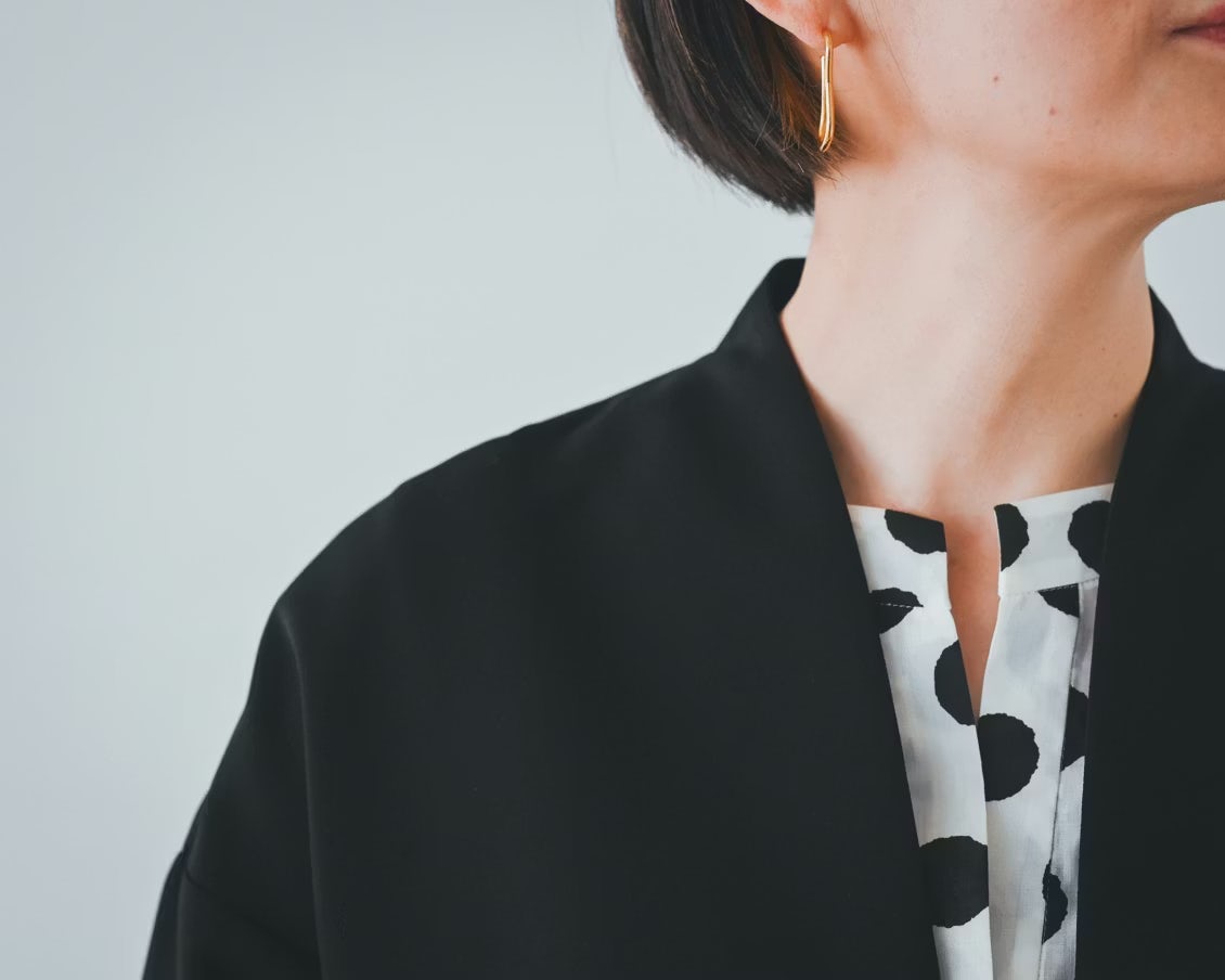 「襟元のデザインがすっきりしているので、デザインのあるブラウスを合わせてもうるさくなりすぎず、相性がいいです」