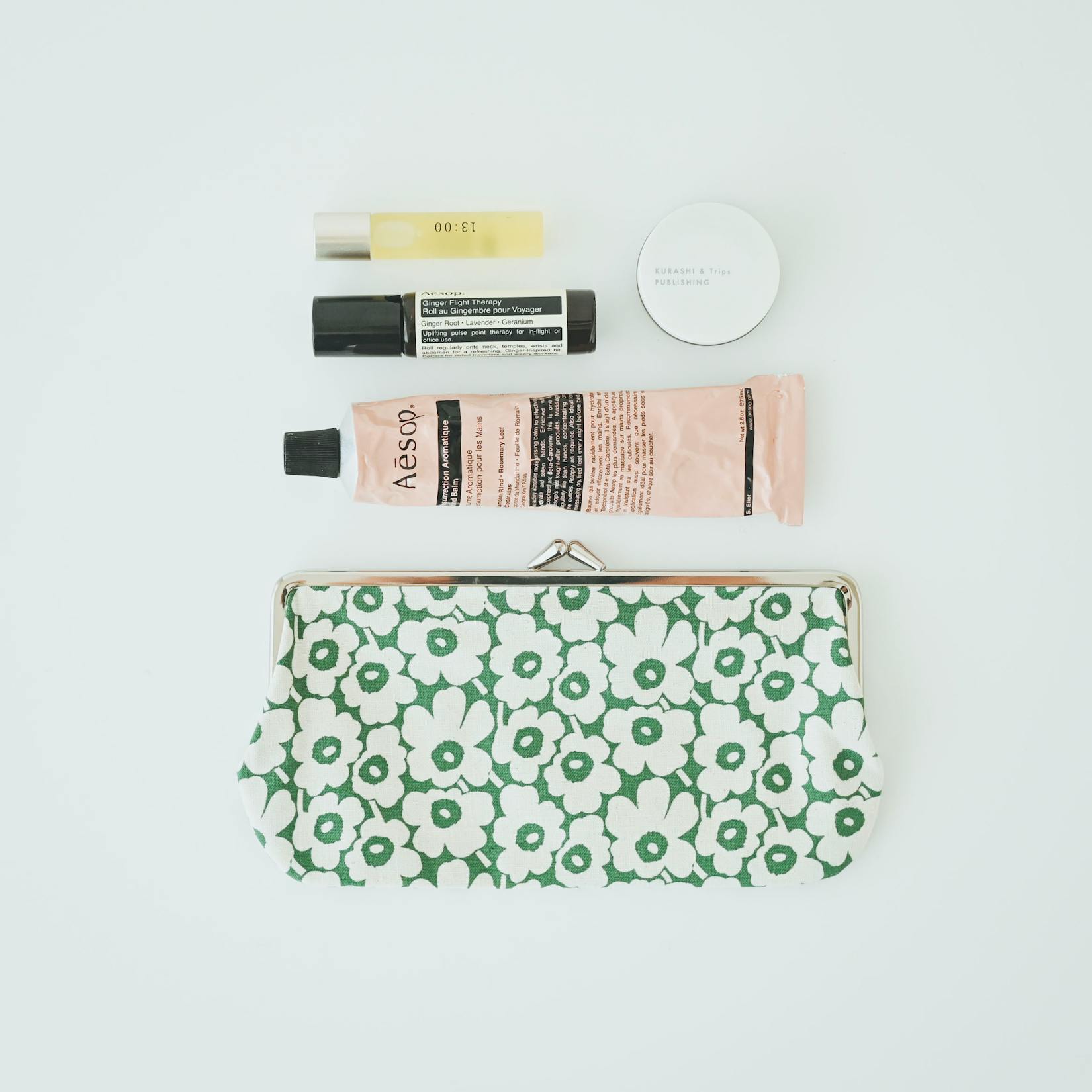 マチの薄いつくりですが、柔らかなコットン素材と大きく開くがま口のおかげで、収納力は見た目以上◎ 今回は3つのサイズをご用意しました。