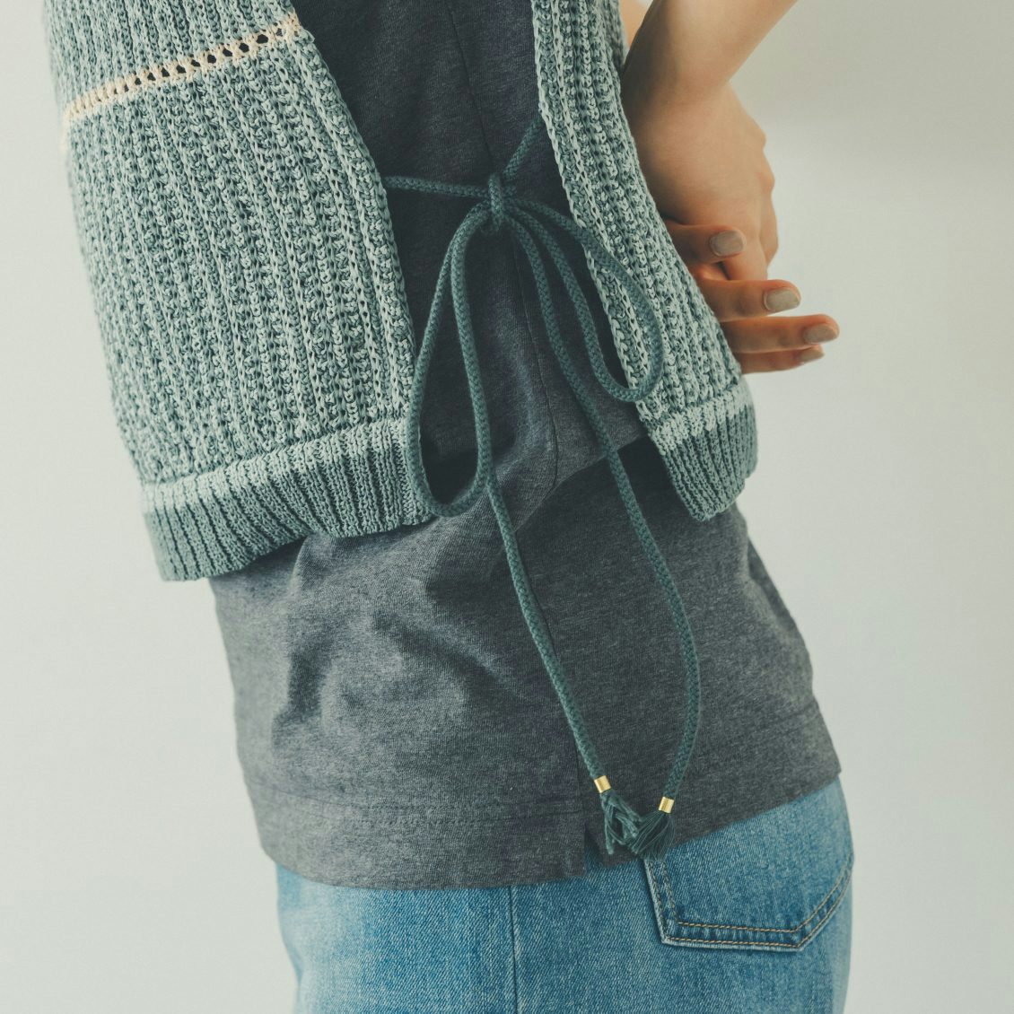 シンプルコーデのアクセントになるだけでなく、好きな長さで結べるので合わせるものによってフィット感を調整できるんです。ゆったり結べば、中のシルエットに干渉せず着用できますよ。