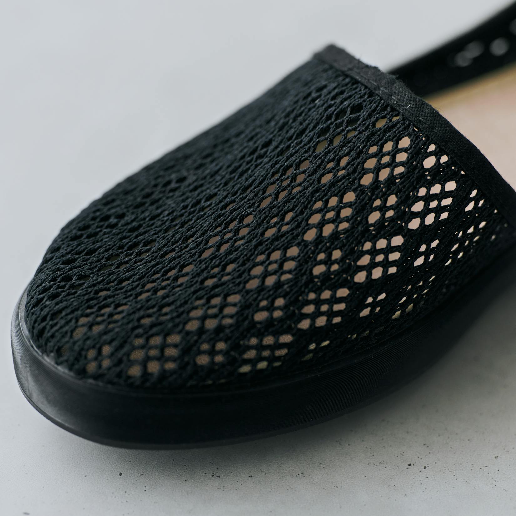 秋冬に人気のベロアスリッポンのかたちに、涼しい見た目で夏にぴったりのレース素材の組み合わせを別注しました。