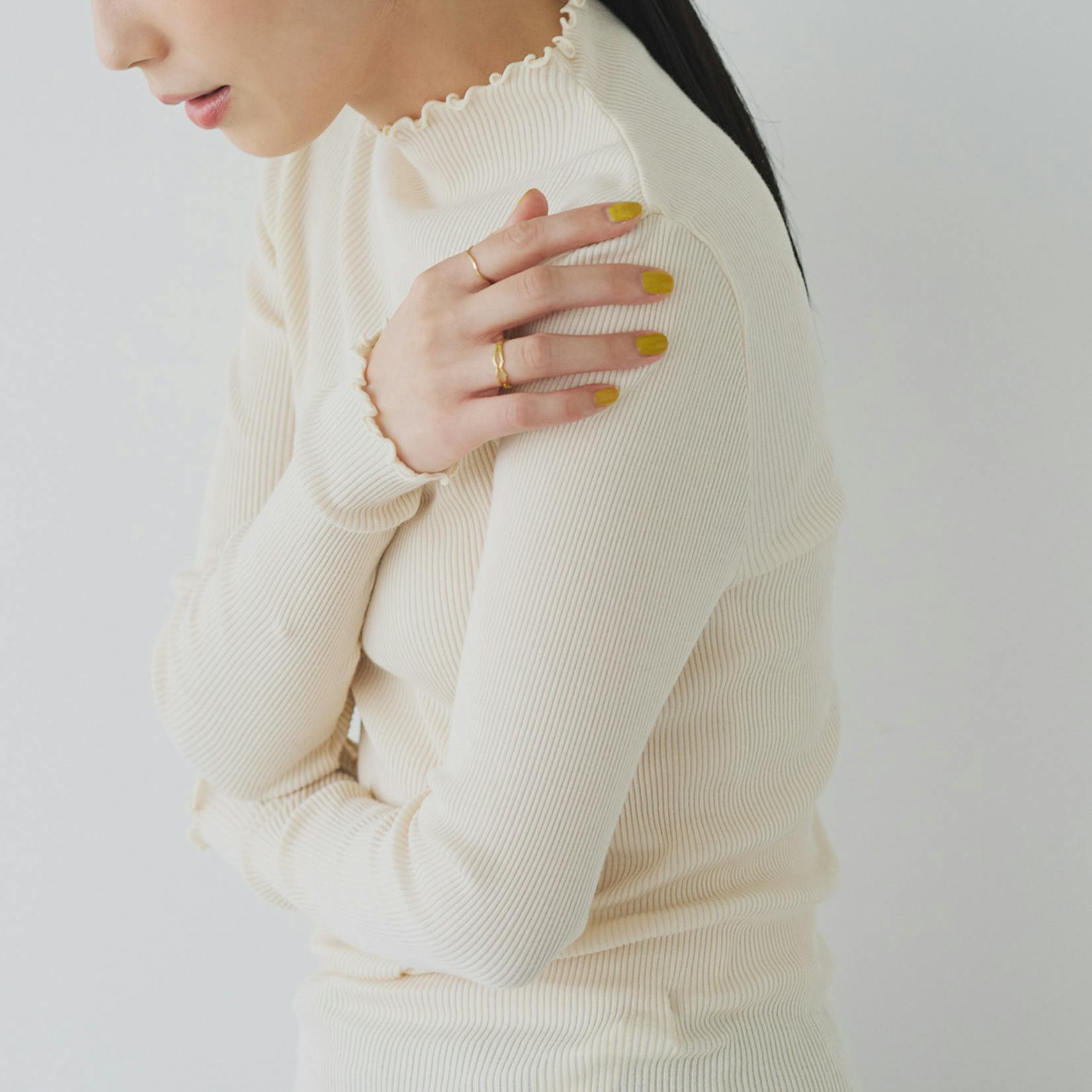 ニットやシャツと重ねたときに、首元や袖口からちらりとのぞくのがとても可愛く、アクセサリーがなくても品よくおしゃれに見えるんです。