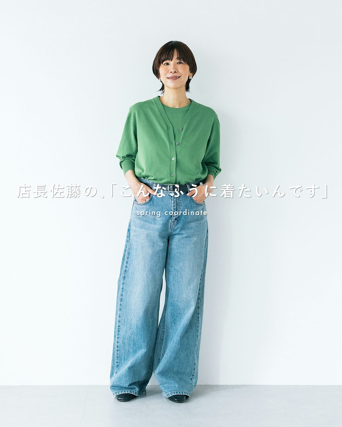 次に佐藤が着用したのは、半袖ニットとカーディガンをセットにした「アンサンブルニット」。4色展開ですが、今回佐藤が選んだのはパッと目を惹く綺麗なグリーンで、ラフなワイドデニムと合わせました。