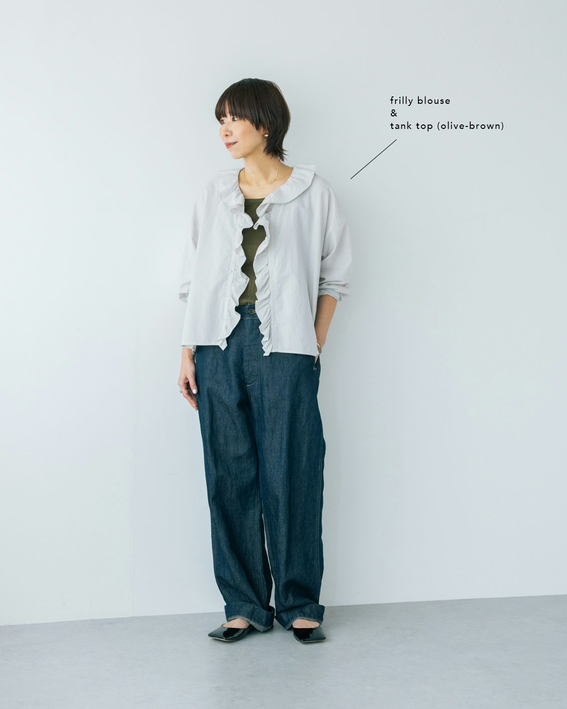 最後にご紹介するのは、「フリルブラウス」をあえてシャツのようにラフに羽織ったコーデ。中にはオリーブブラウンのタンクトップ、ボトムスはワイドめのインディゴデニムを合わせました。