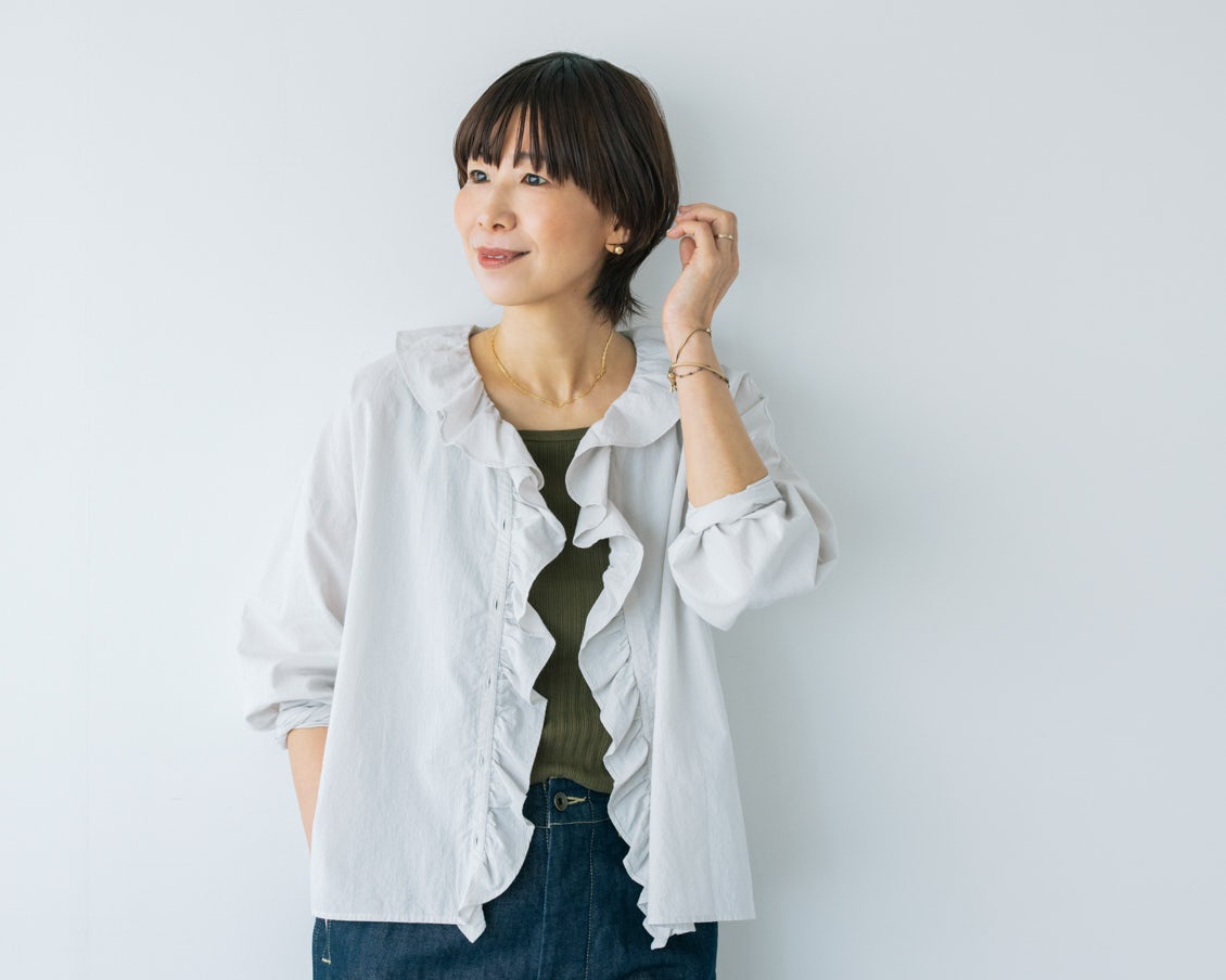 「ここ最近、ロマンチックなテイストのものが似合わなくなってきたかも……と感じていたんですが、このブラウスは絶妙な甘さ加減で、華やかなフリルがありながらも、洗いざらしのような素材感とラフなシルエットのおかげで、ほどよく肩の力が抜けた感じで着られるのがいいなと思っています。