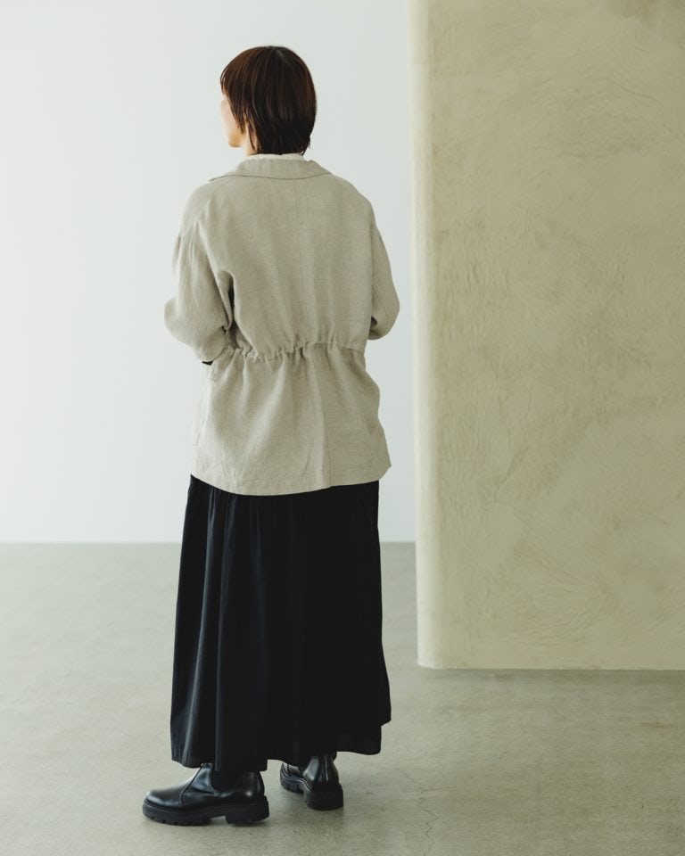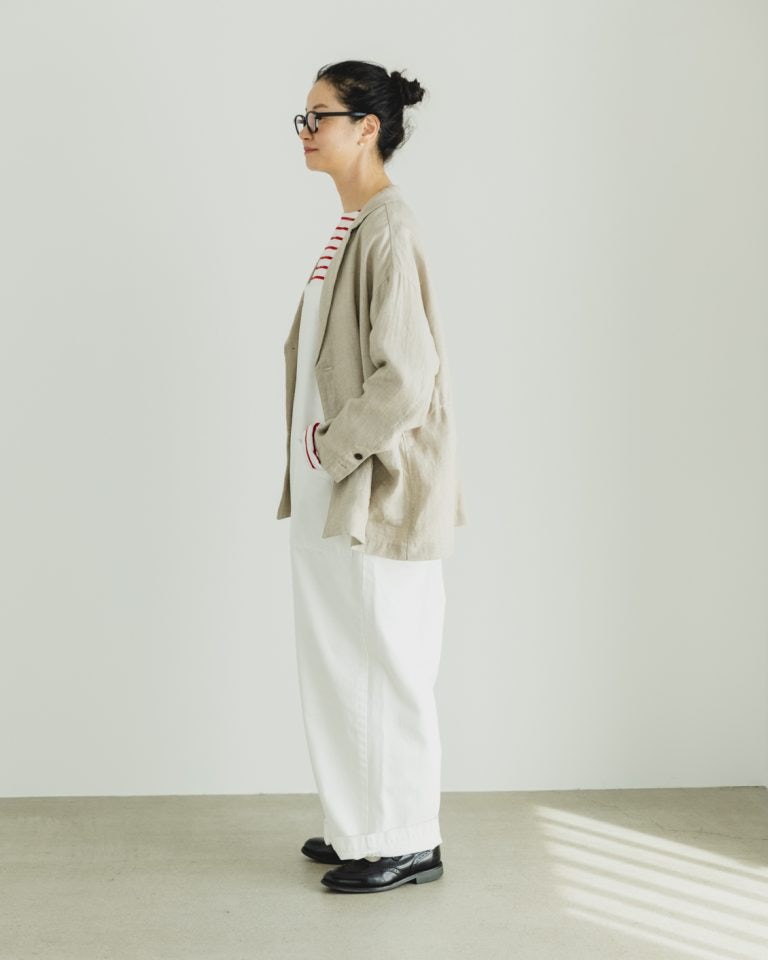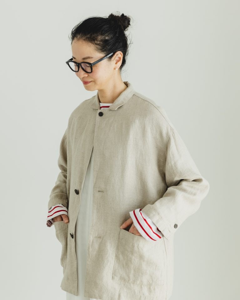 かぐれのブランドの中でも、ジャケットは長年ご好評いただいているアイテムのひとつ。特にカチッとしすぎず、カジュアルなテイストにも合わせやすいリネン生地のものは、いろんな場面で着回しやすく、カーディガンのように気負わず着ていただけます。今回のコラボ企画では、フレンチリネン100%の素材を選びました」