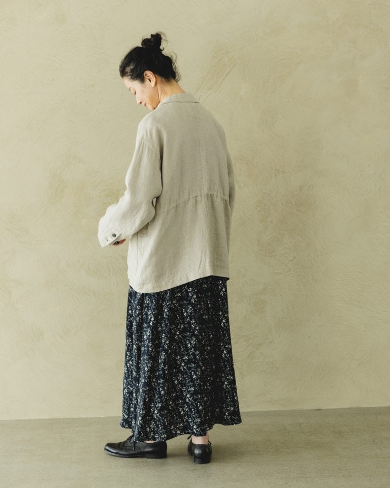 「リネン特有のリラックスした風合いがありつつ、基本はベーシックなかたちなので、きちんとした装いをしたい日にももちろん活躍します。たとえばこんなふうに、クラシックな花柄ワンピース(かぐれ / キュプラレーヨンプリントワンピース)やレザーシューズと合わせて。