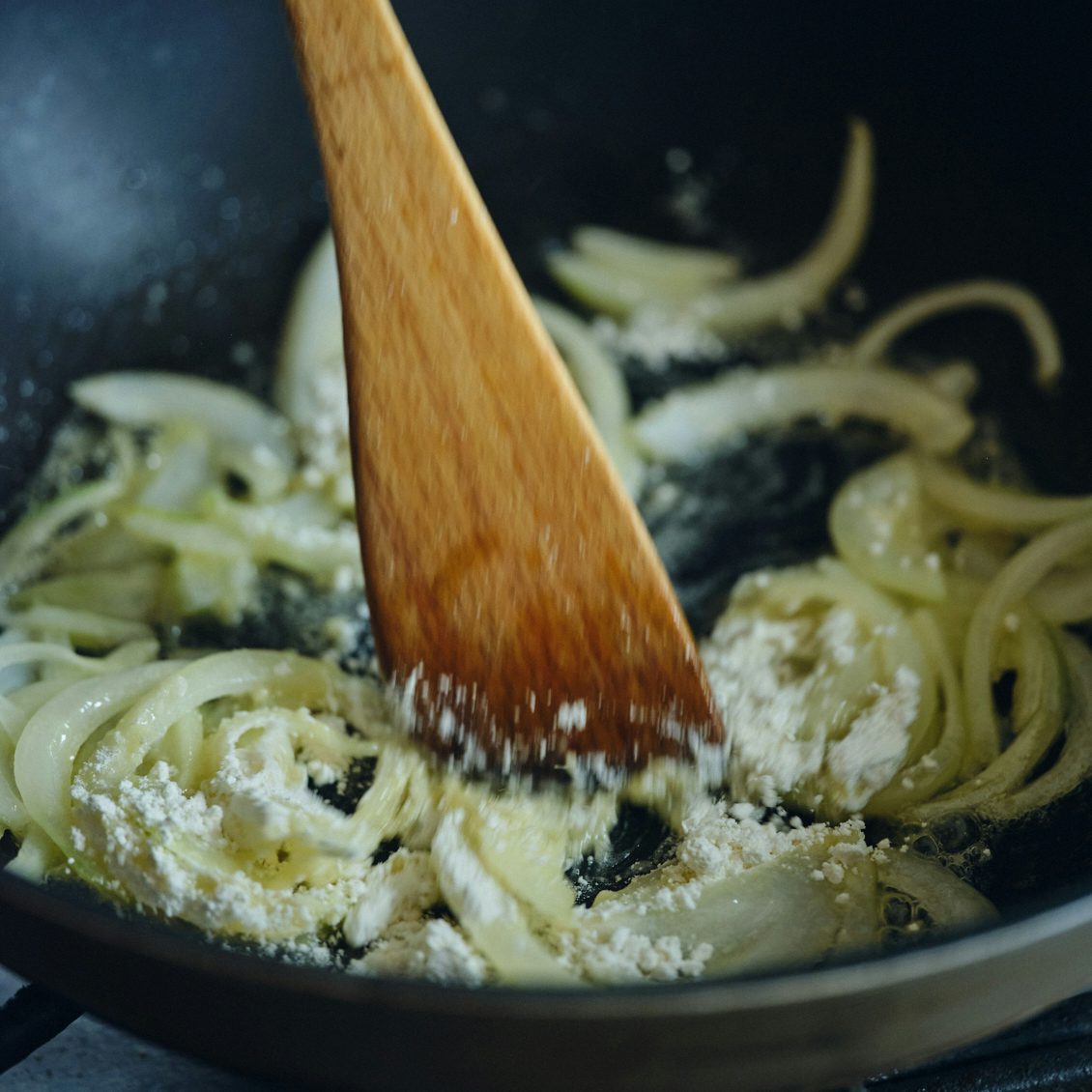 3.2のフライパンをキッチンペーパーで拭き、バターを入れて中弱火にかける。溶けたら玉ねぎを加えて炒め、透明になってきたら薄力粉を加え、粉気がなくなるまで炒める。