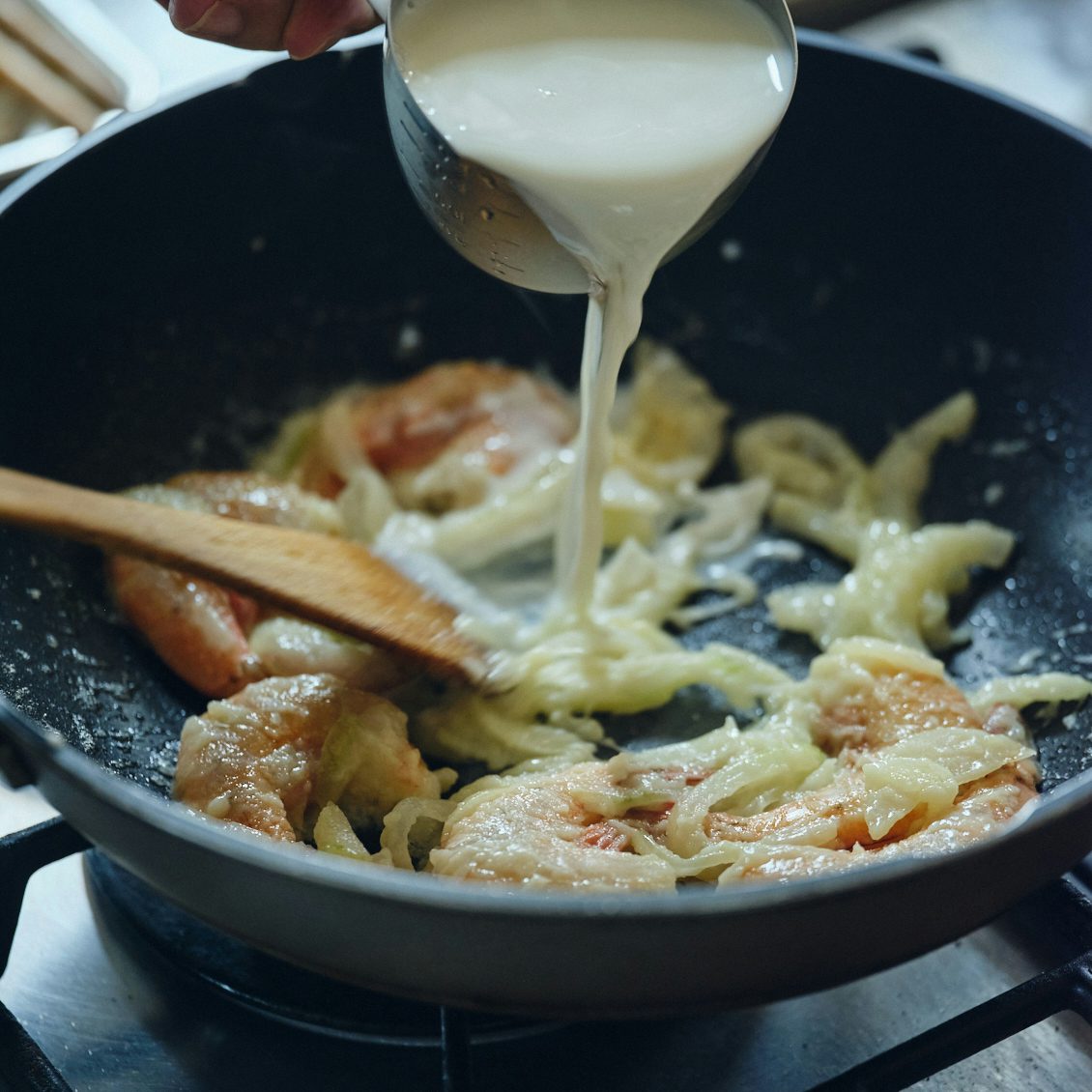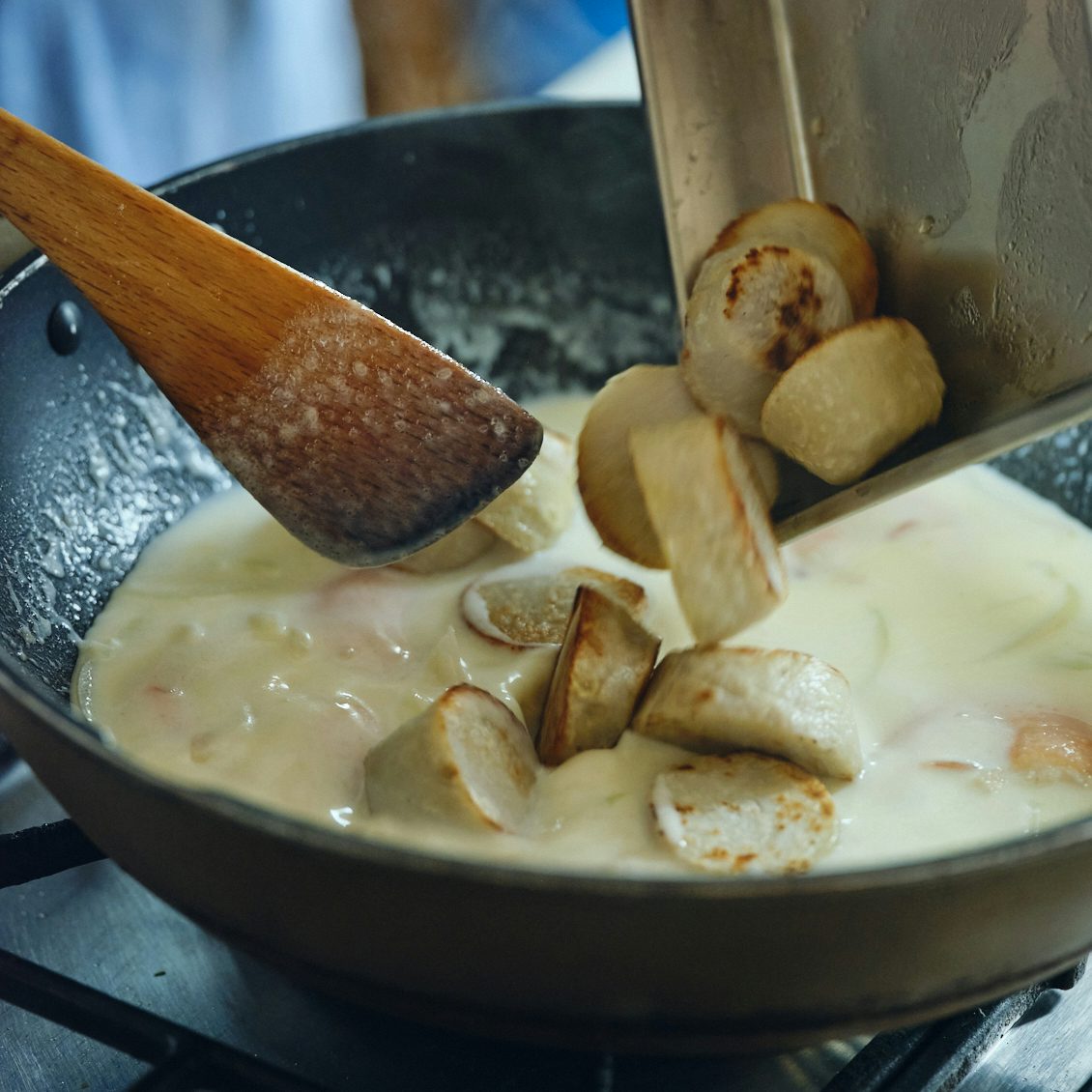 フライパンひとつで煮込みながら作れる手軽なホワイトソースはさらりと軽やか。やさしい里芋の風味を消さず、あっさりしているのでスープのように食べられます。