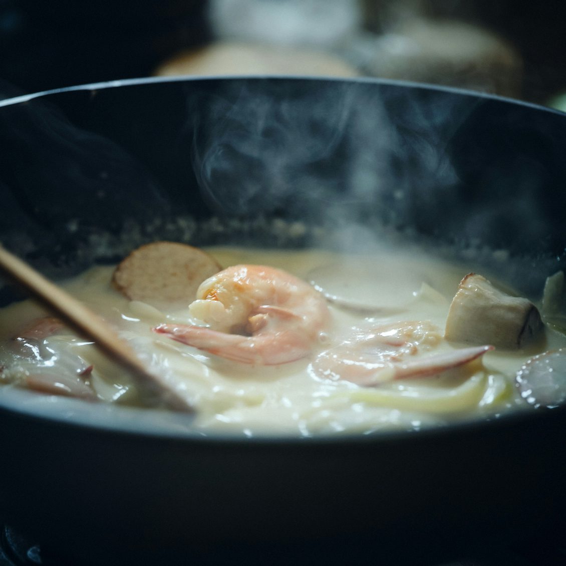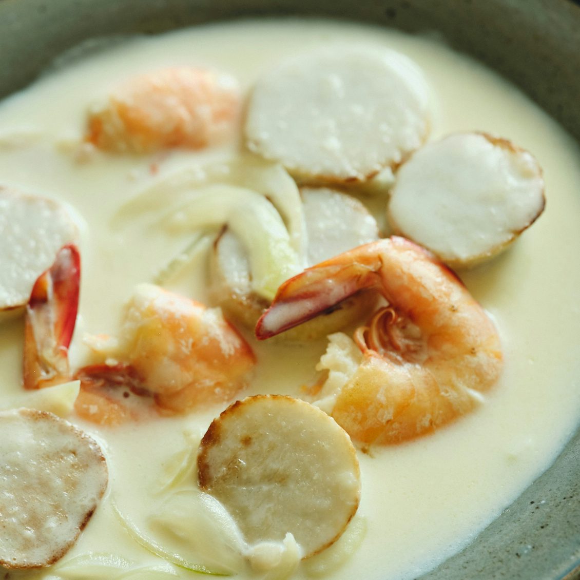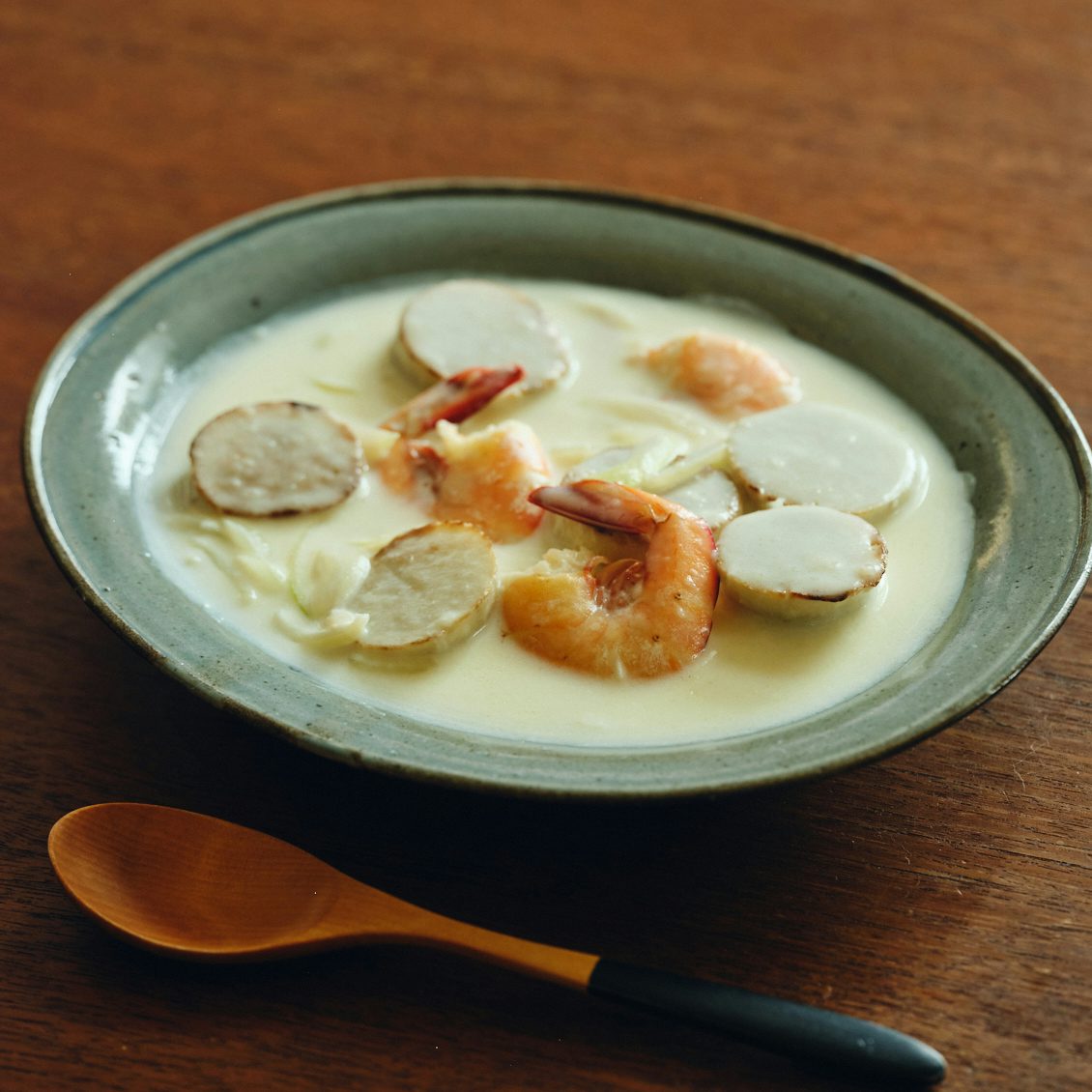 ほくほくした里芋が食べごたえ抜群。シンプルな味つけに、里芋の焦げ目とえびの香ばしさが映えるシチューは、ごはんにもパンにもよく合います。