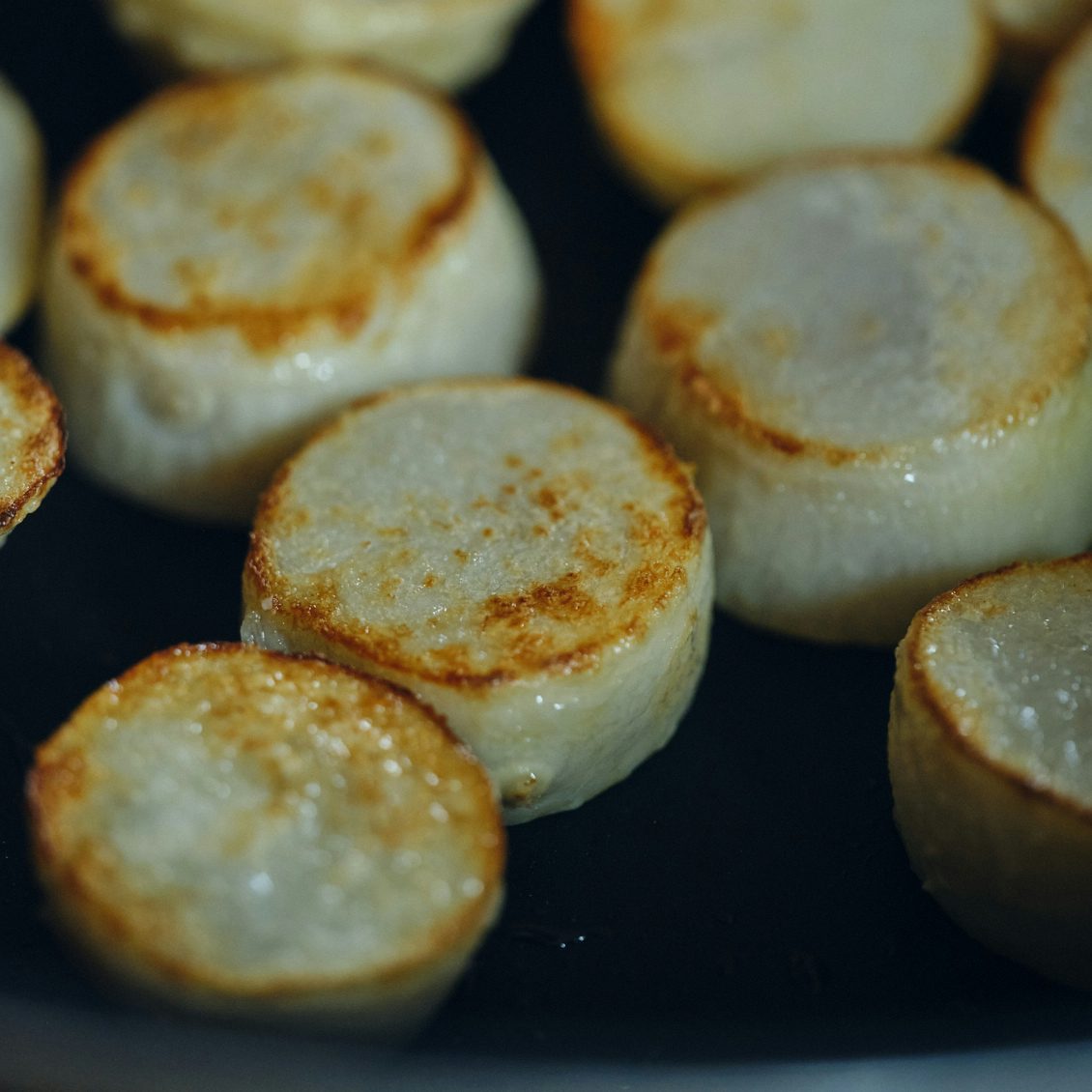 2.フライパンに油を中火で熱し、里芋を並べて両面に焼き目がつくまで焼きつけたら取り出しておく。