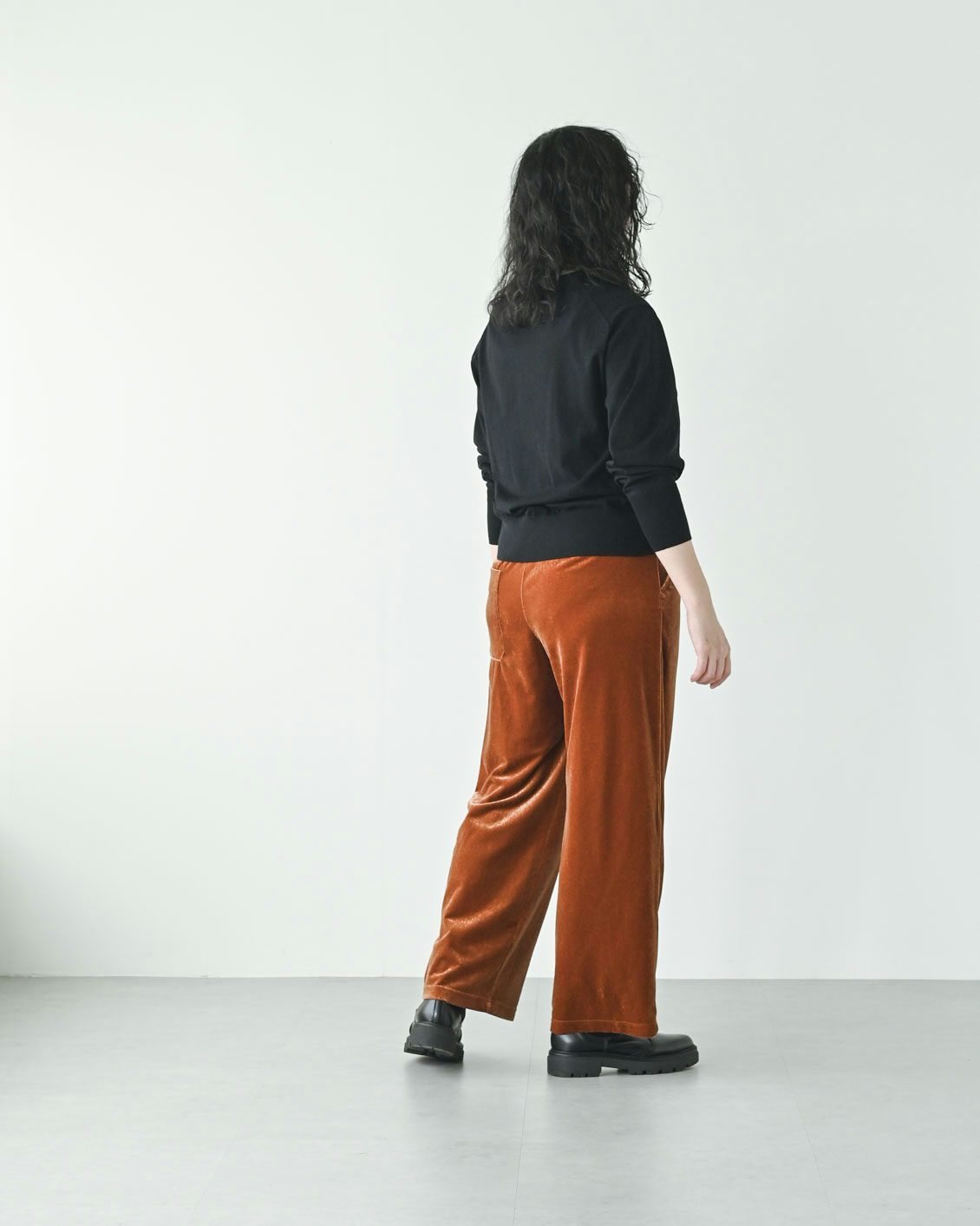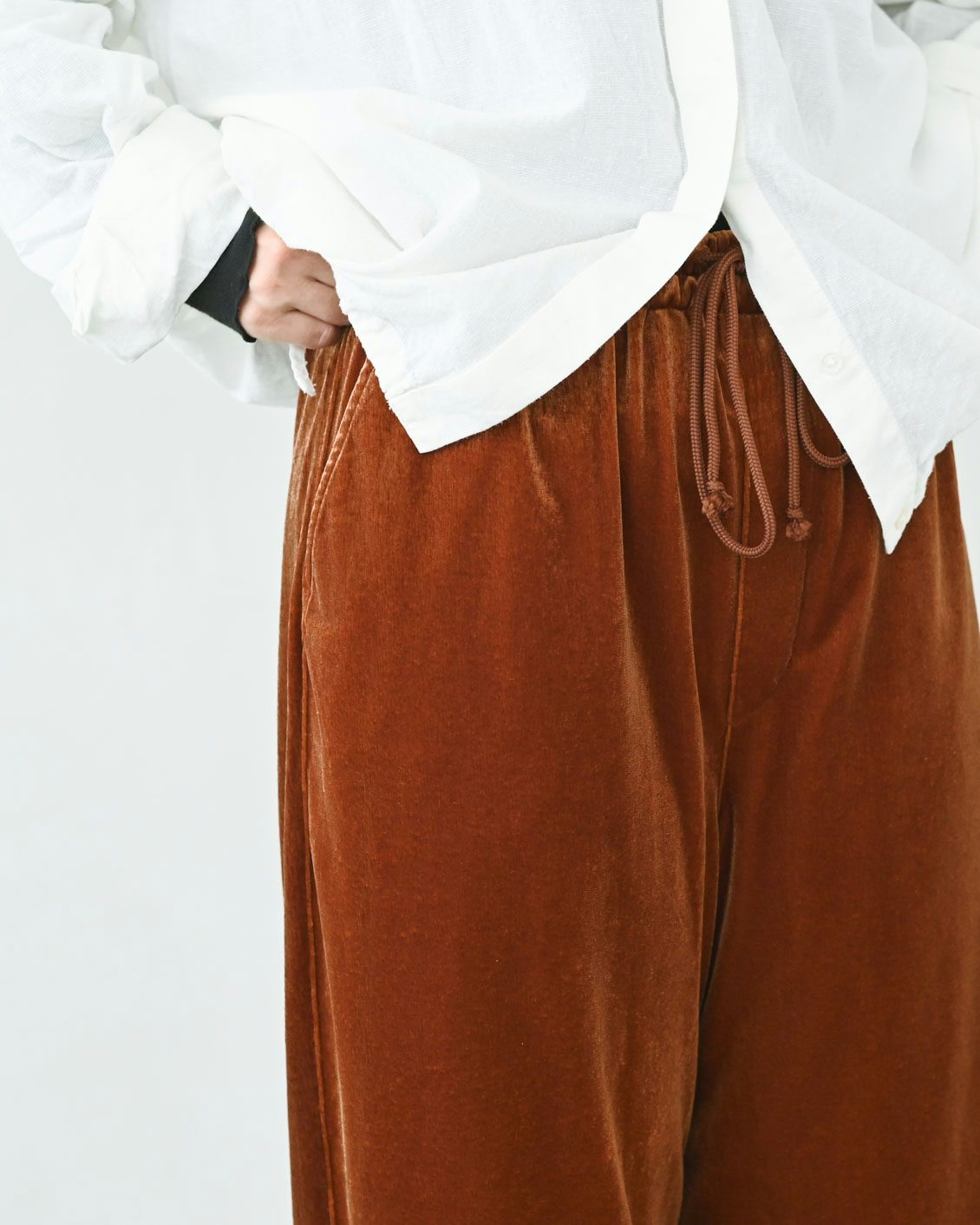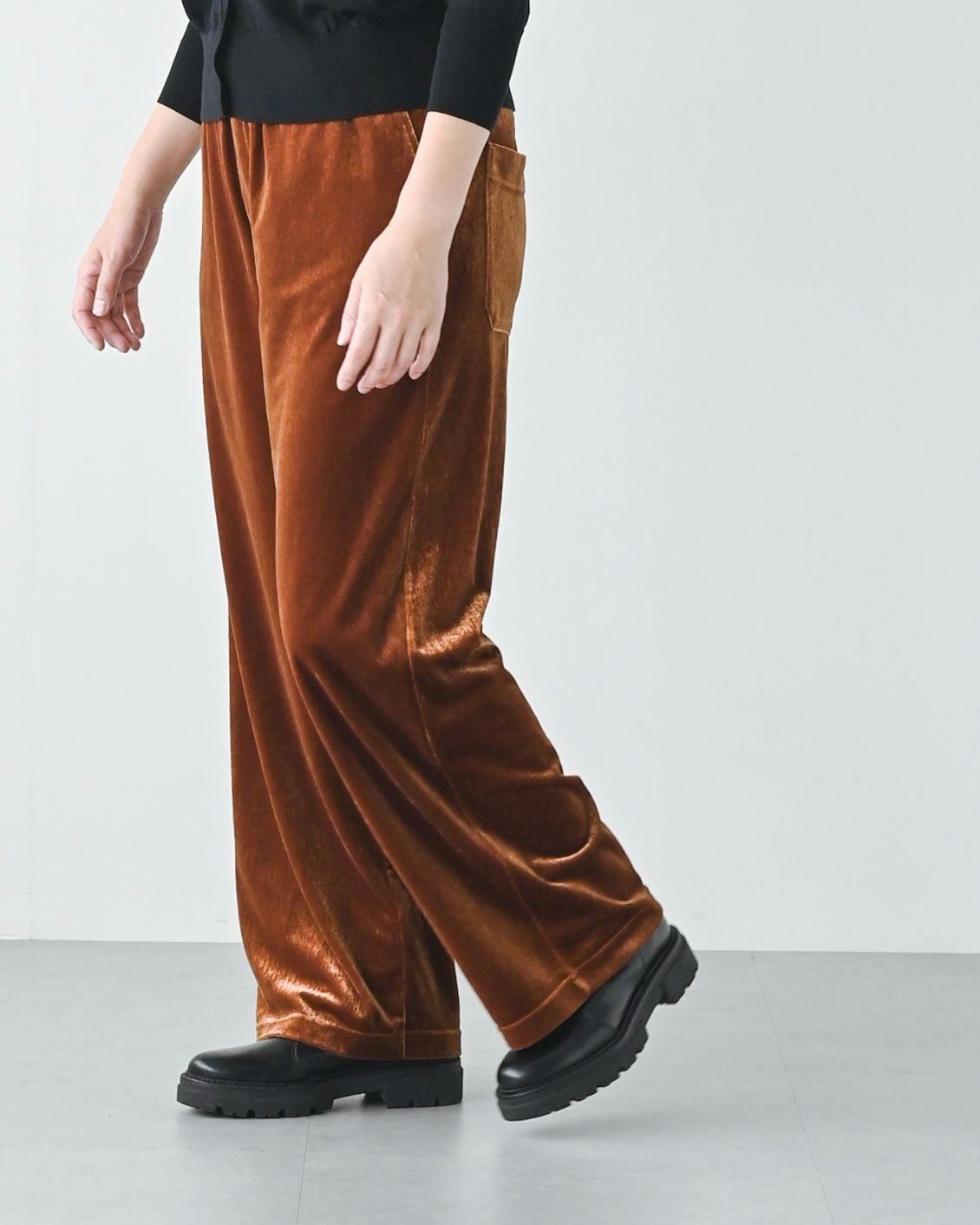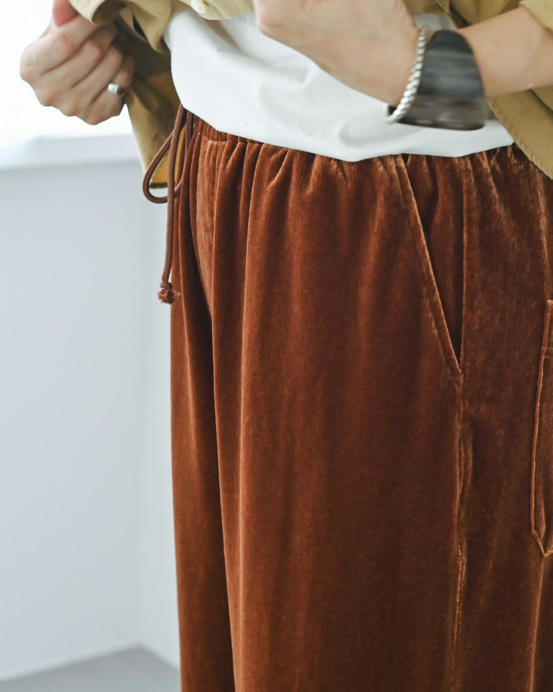 とろみのある生地の揺れが素敵ですし、動いたときに上品にツヤめくのも大人っぽく、ベロア素材ならではですね。