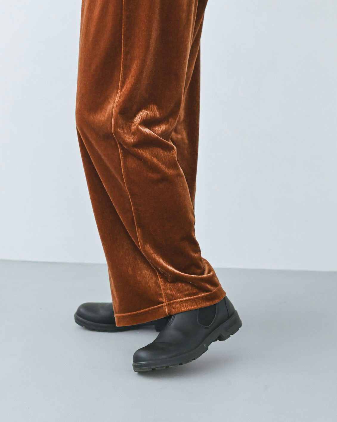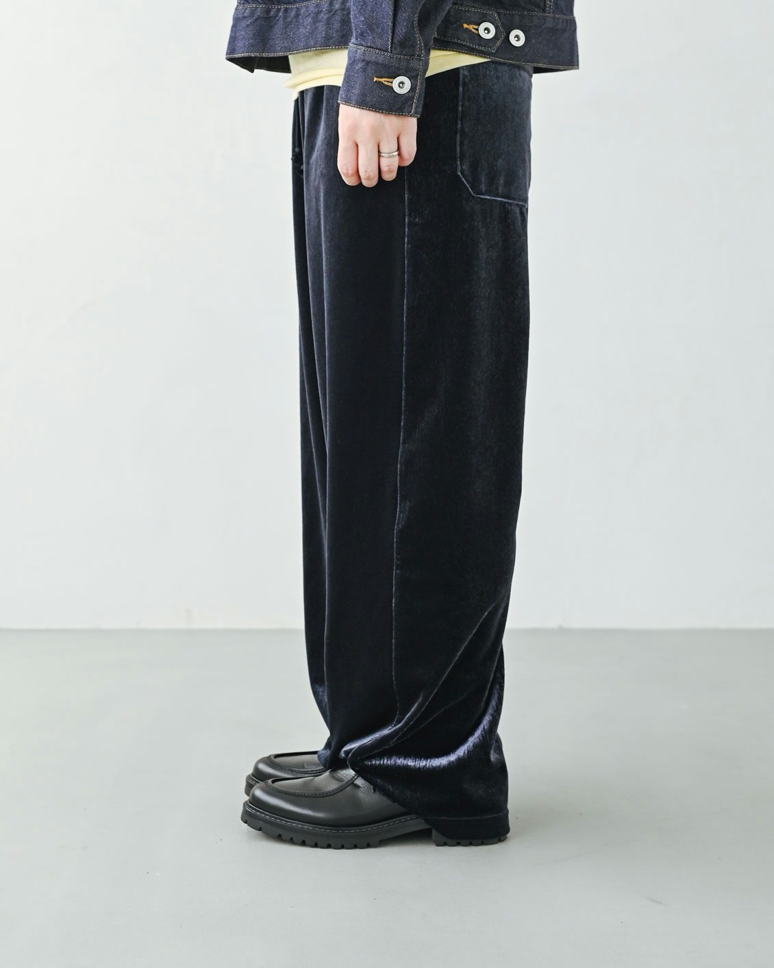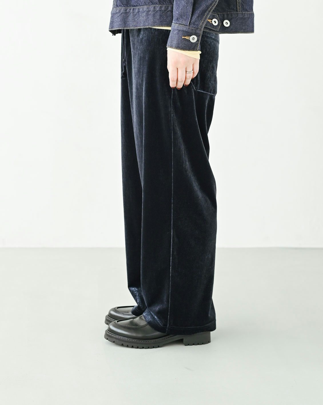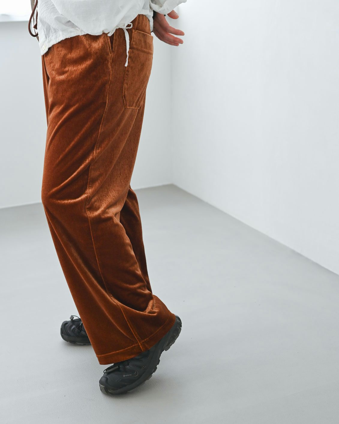 ベロアのアイテムはハードルが高いイメージがあっのですが、この落ち感のあるシルエットに普段からなじみがあるからか、このパンツにははきやすさを感じました。