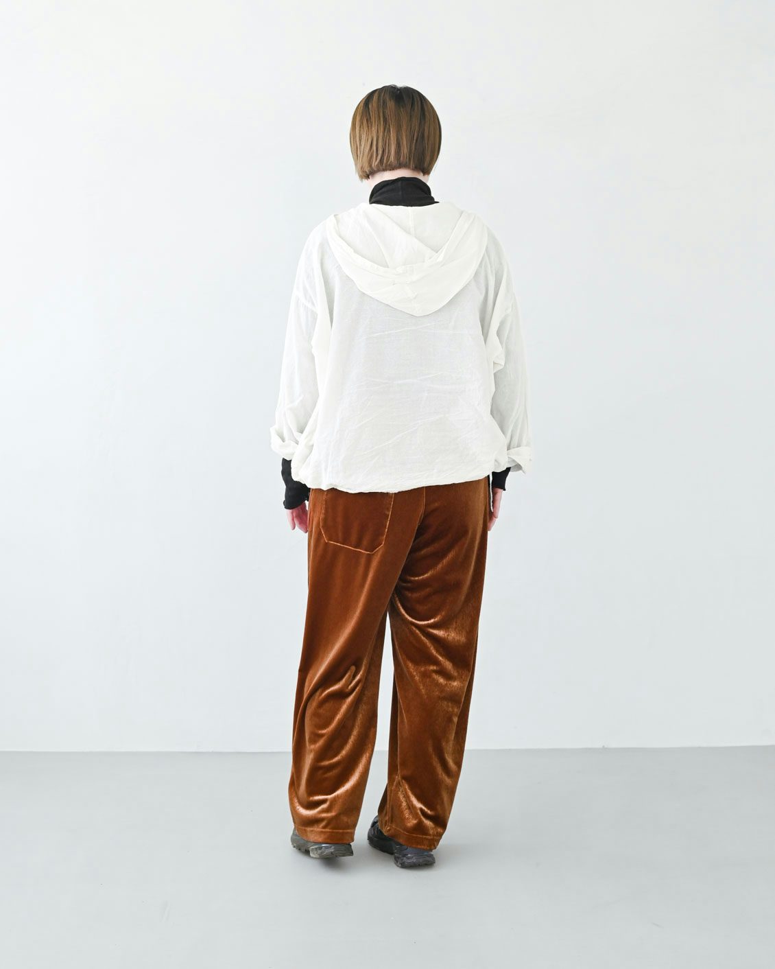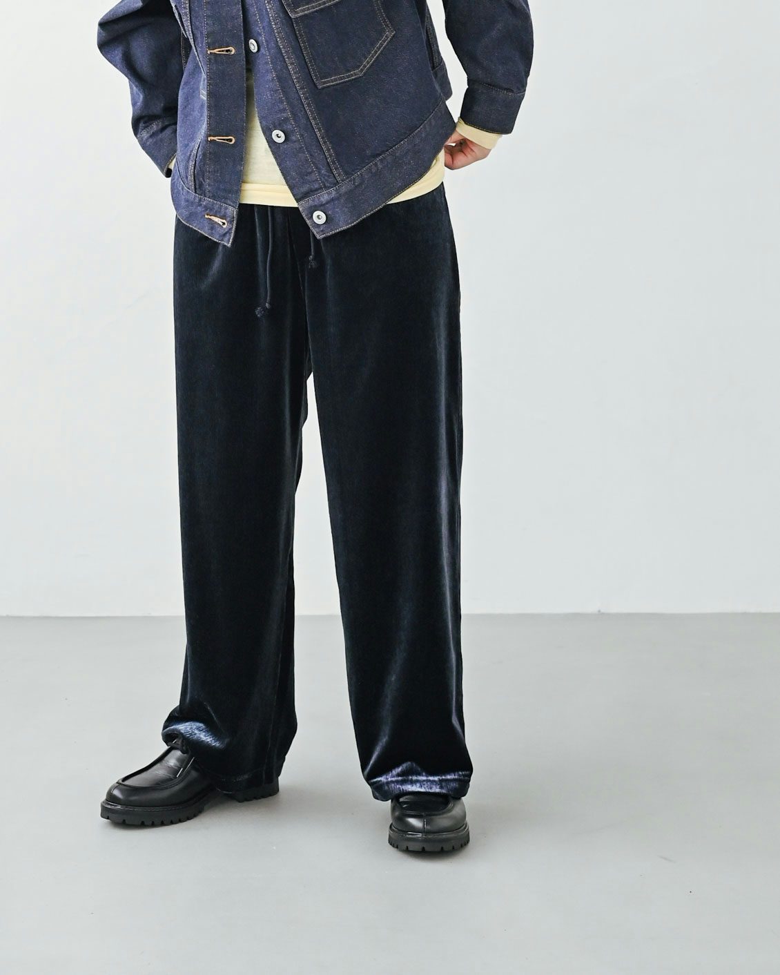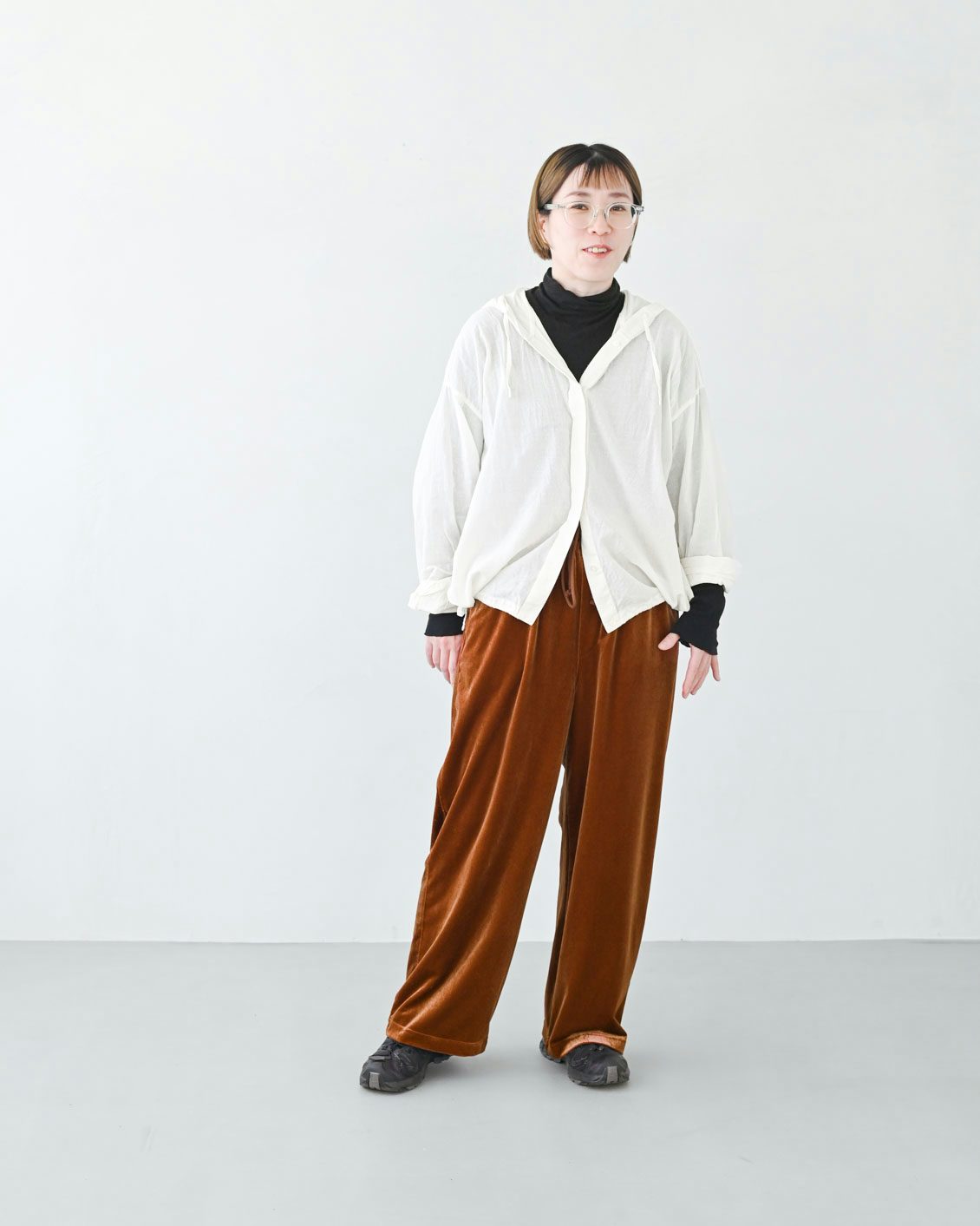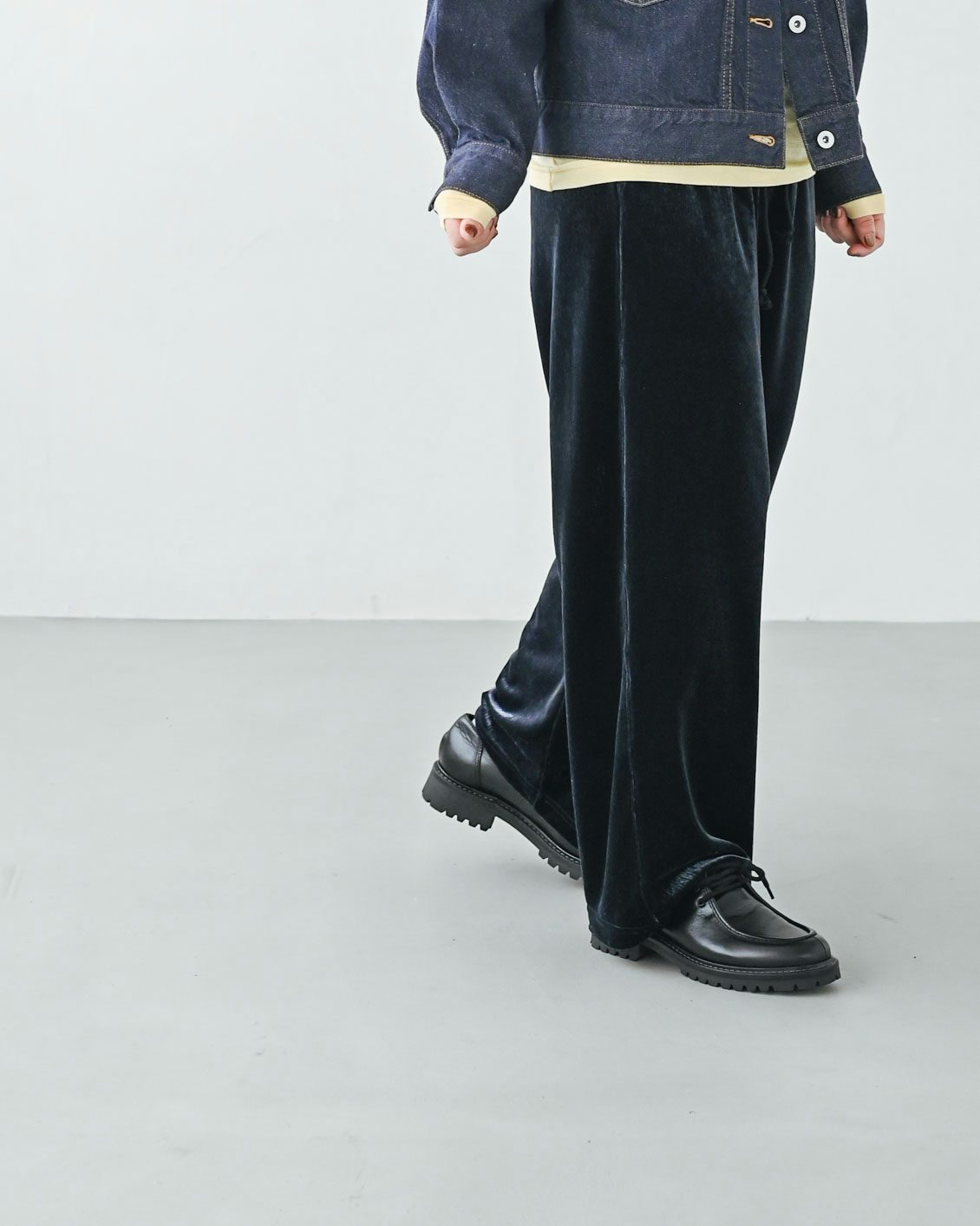 ベロアのアイテムはハードルが高いイメージがあっのですが、この落ち感のあるシルエットに普段からなじみがあるからか、このパンツにははきやすさを感じました。