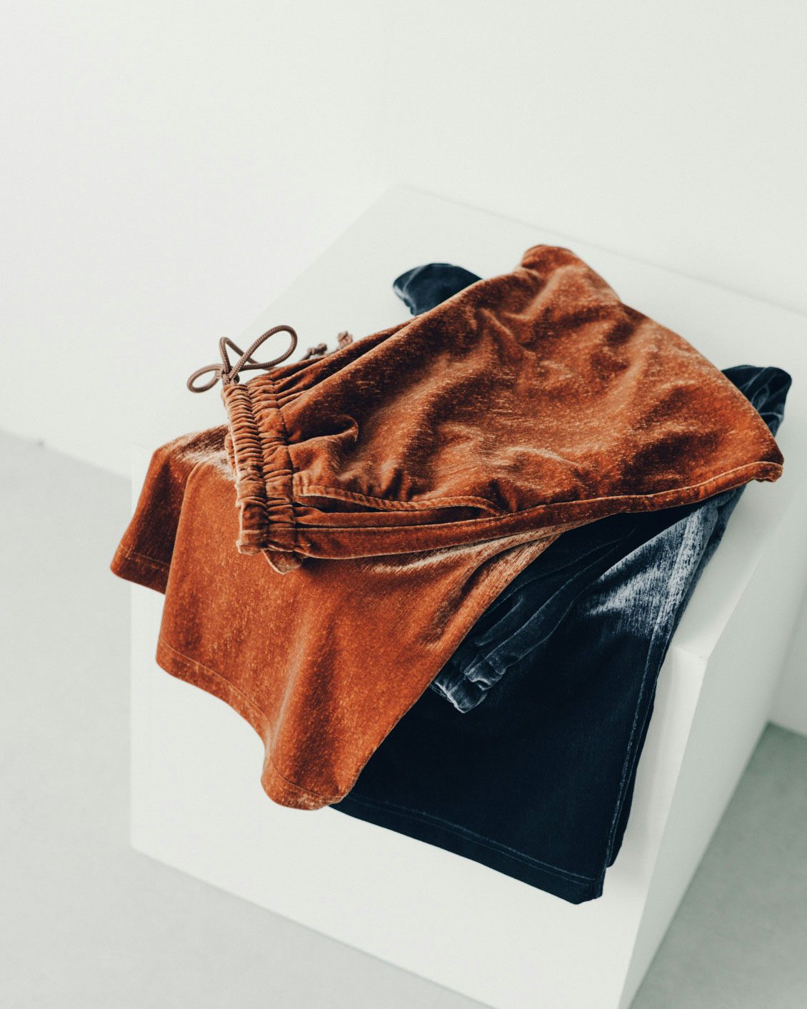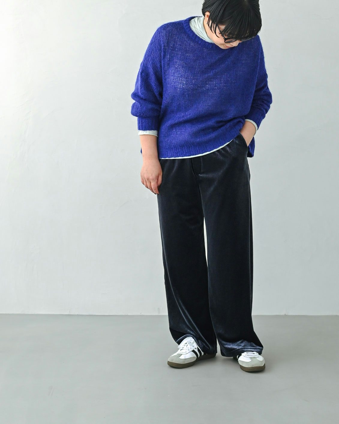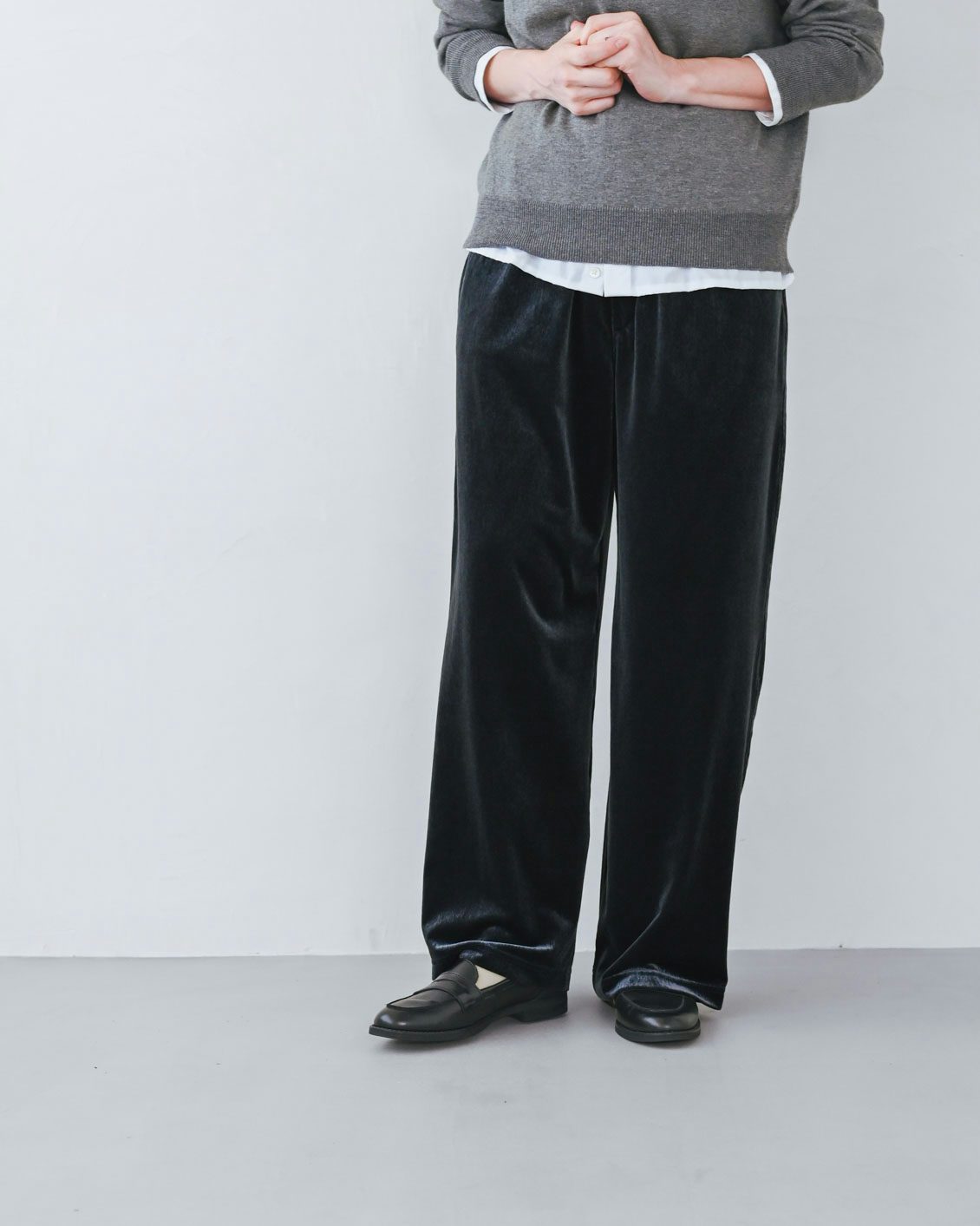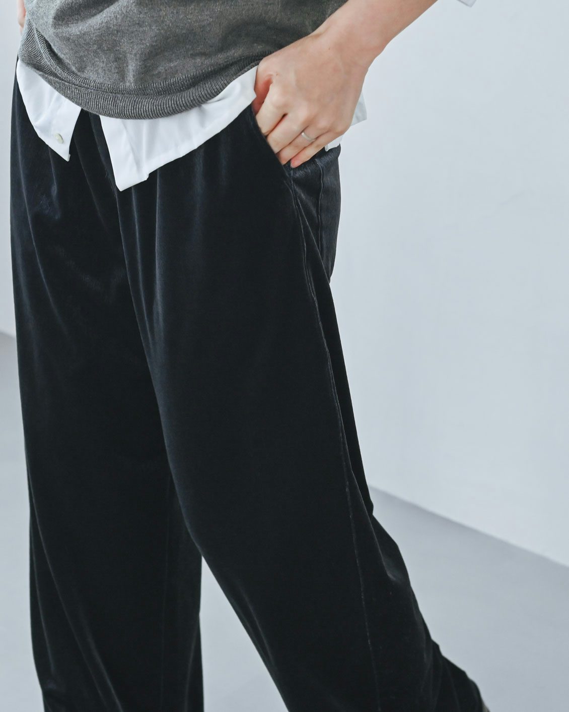 「リラックス感のあるイージーパンツは、普段からよく手に取るアイテム。それを、最近気になっていたベロア素材で楽しめるというのが嬉しい一本です。