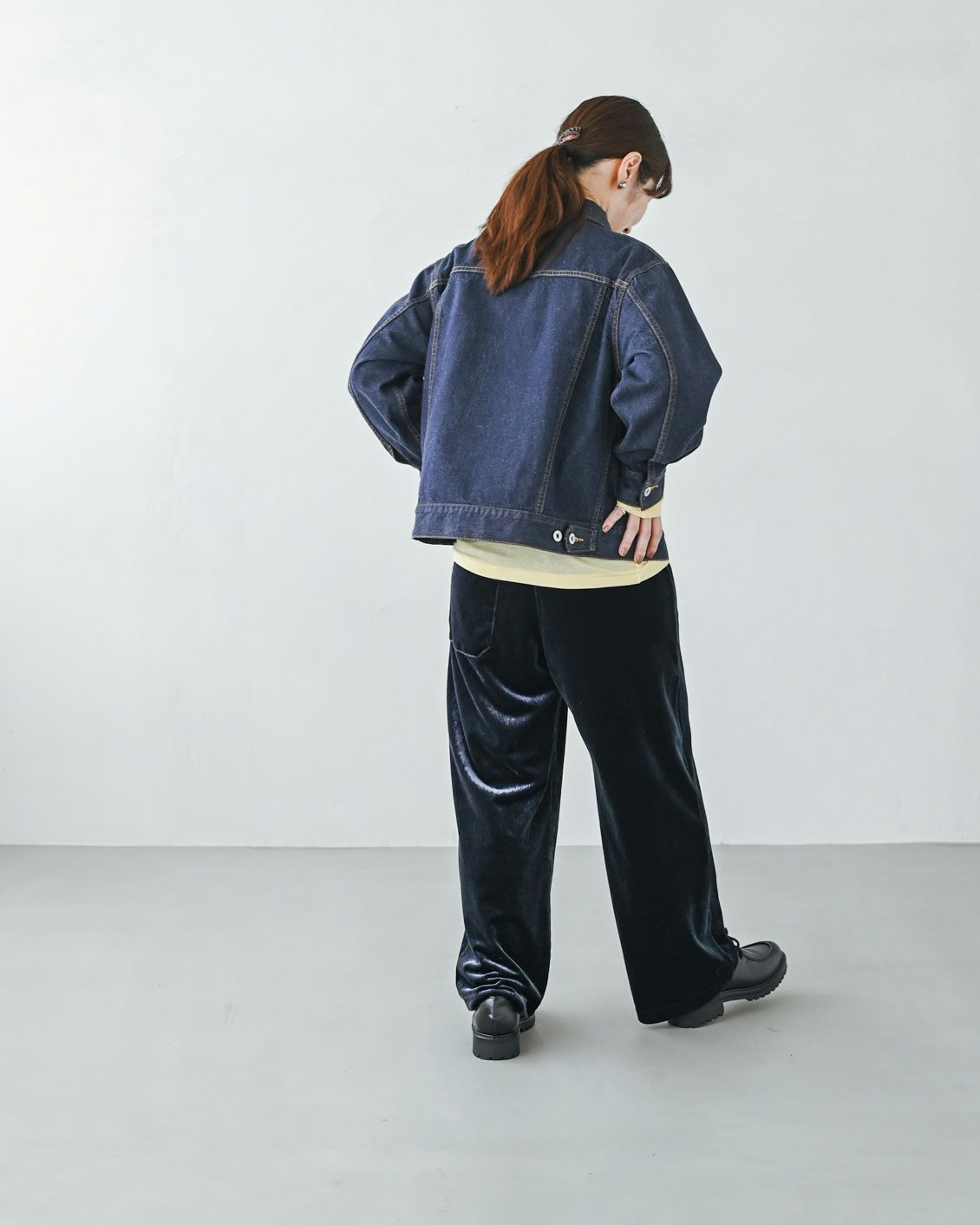 全身のコーディネートをガラッと変えずとも、パンツの素材感だけ変えるだけでコーデが新鮮になるので、ベロア素材っていいなと改めて思いました。