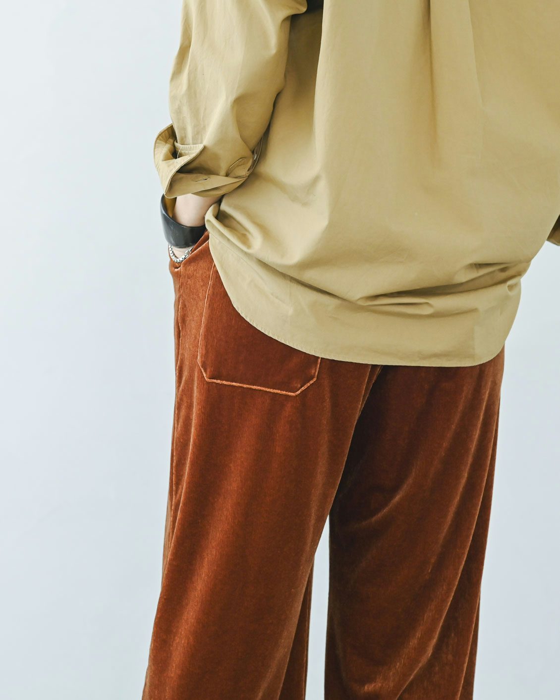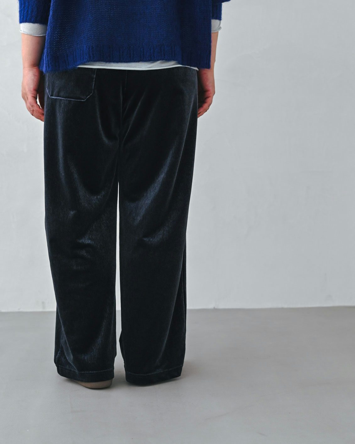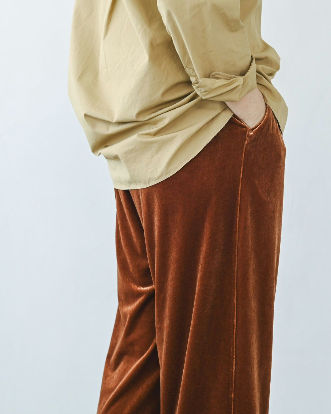 このパンツは、ベロア生地なのに縦に筋の入ったような表情がコーデュロイのようにも見えますね。ランダムに光を受けて見え方が変わるニュアンスが素敵です。