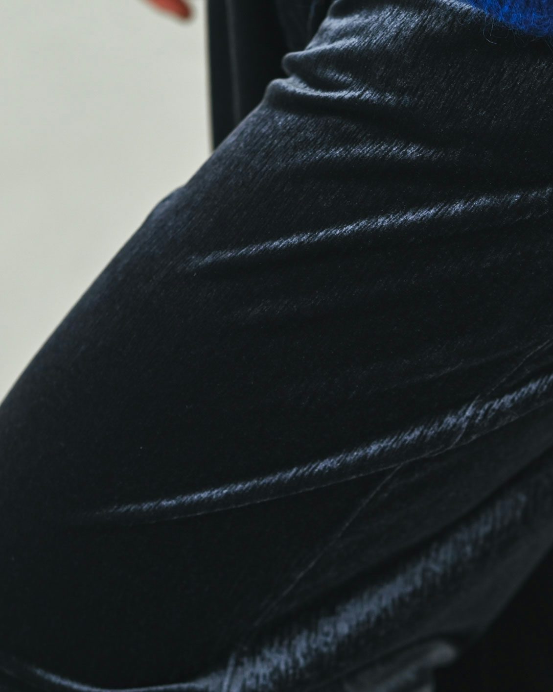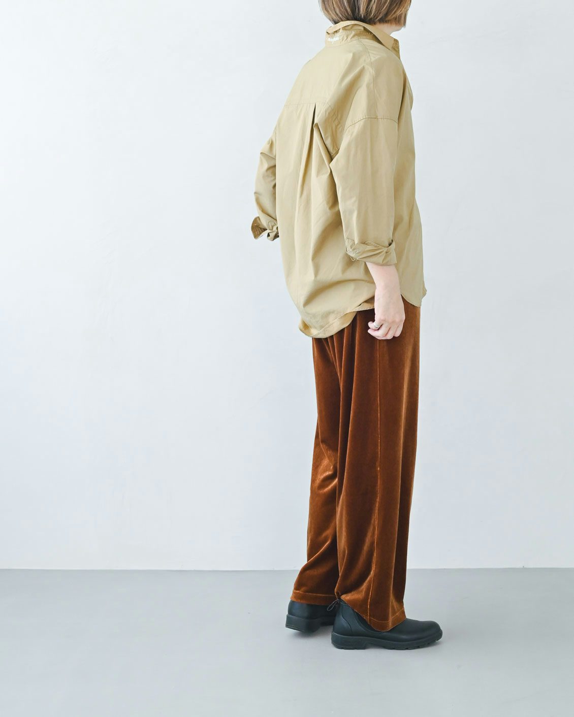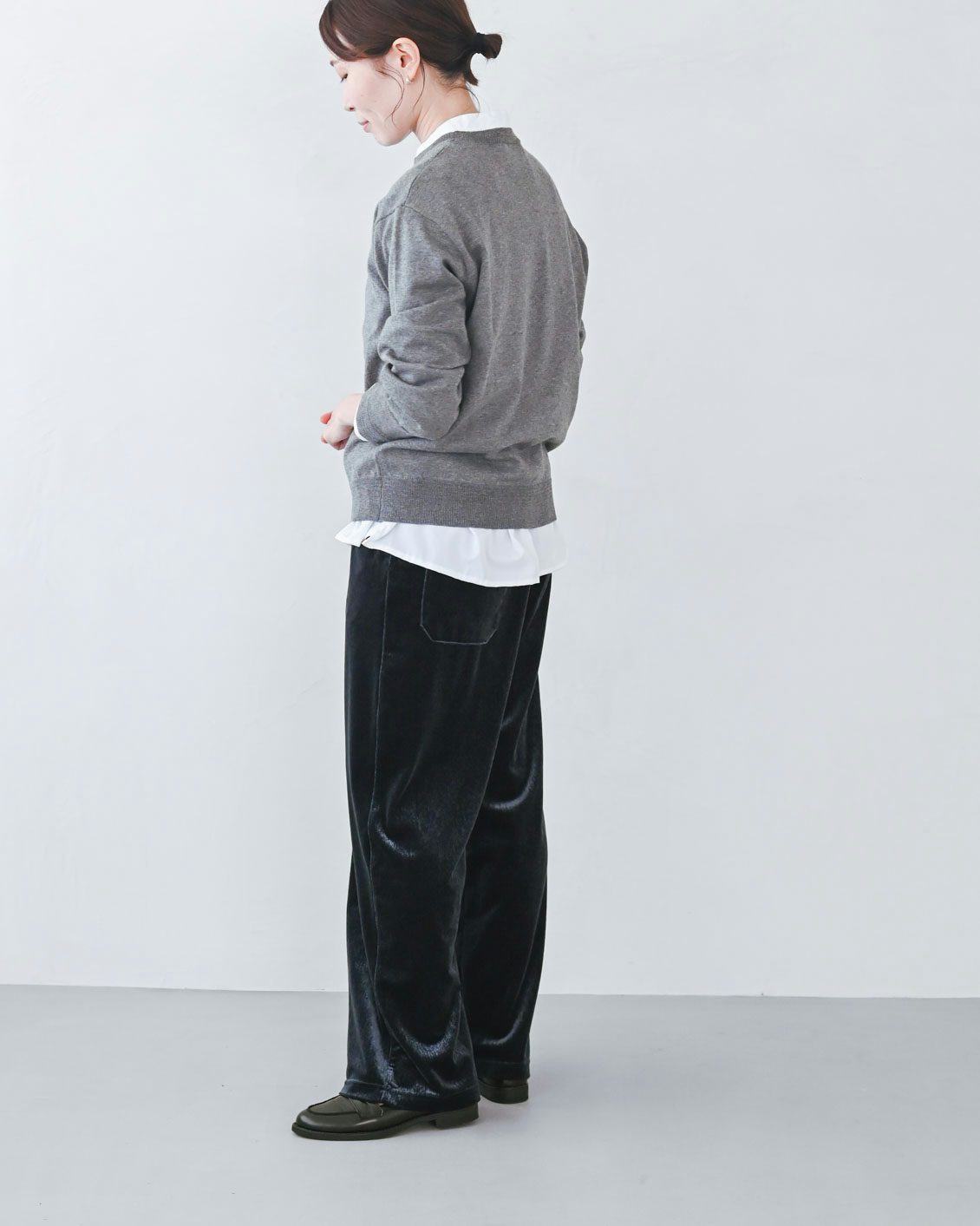 このパンツは、ベロア生地なのに縦に筋の入ったような表情がコーデュロイのようにも見えますね。ランダムに光を受けて見え方が変わるニュアンスが素敵です。