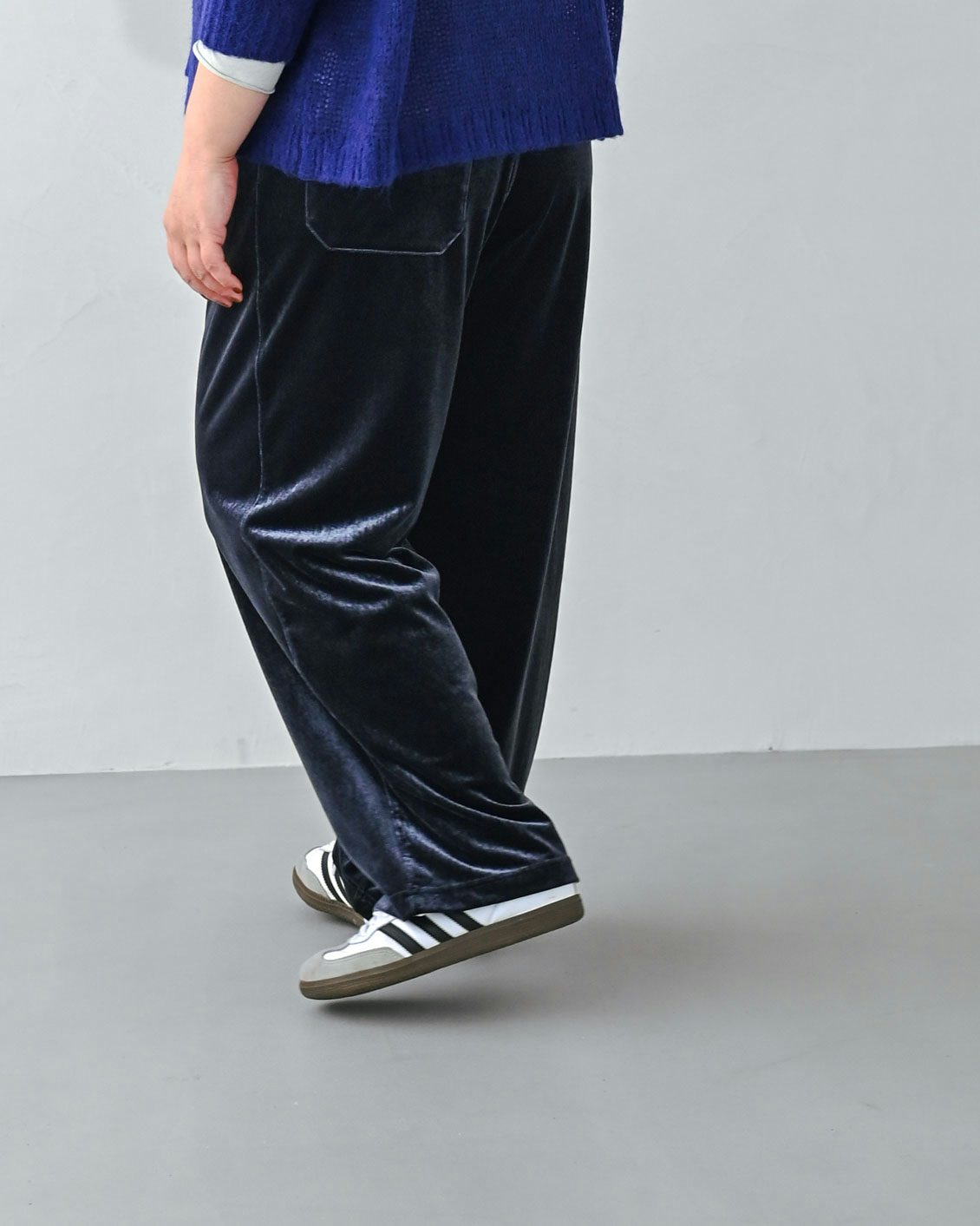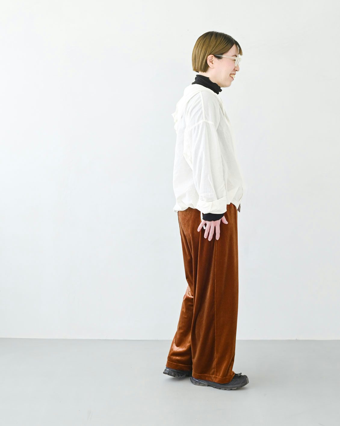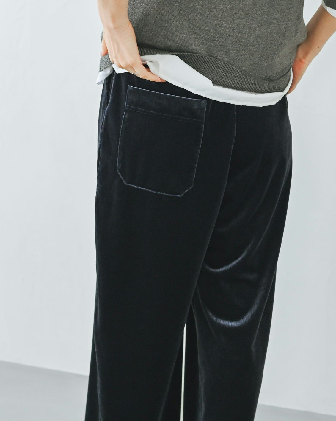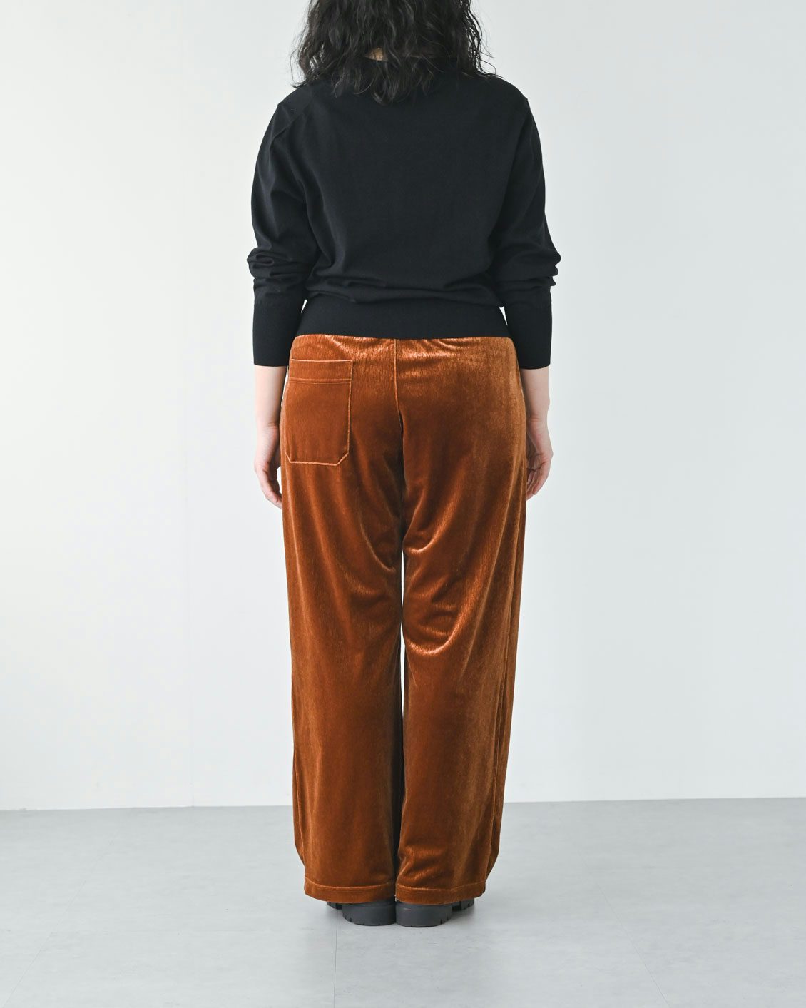 「ベロアパンツはチャレンジしてみたいアイテムでした。その上で気になっていたのが、ツヤのある生地が、腰やお尻まわりなどの体型を拾ってしまわないかという点。