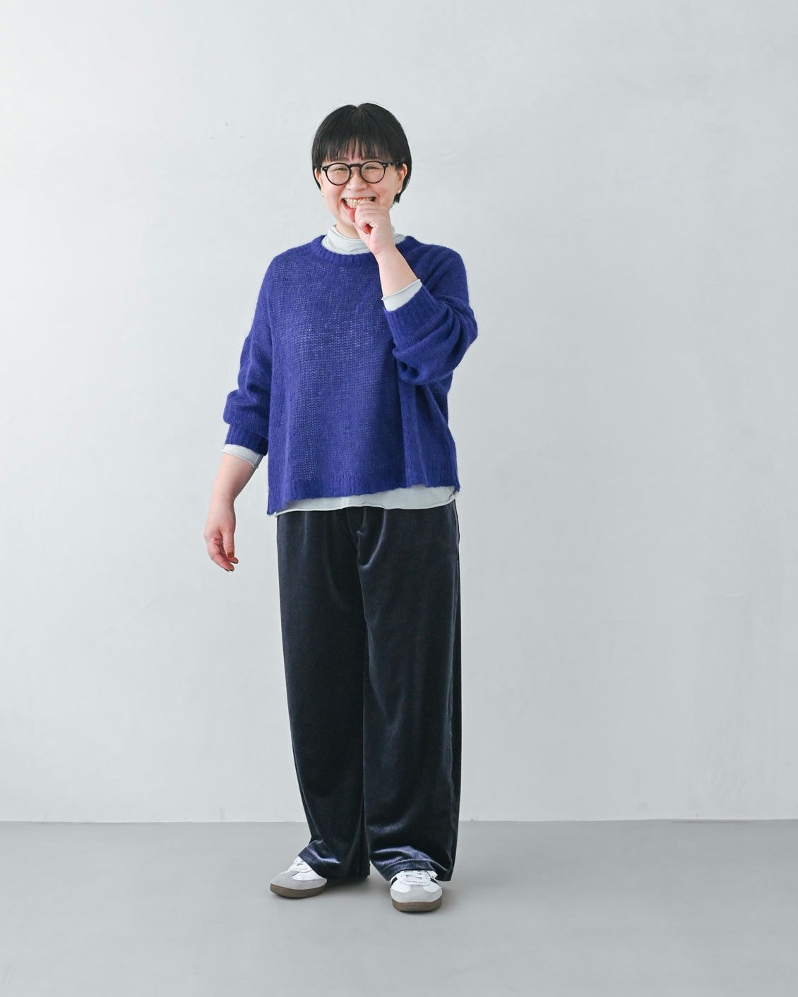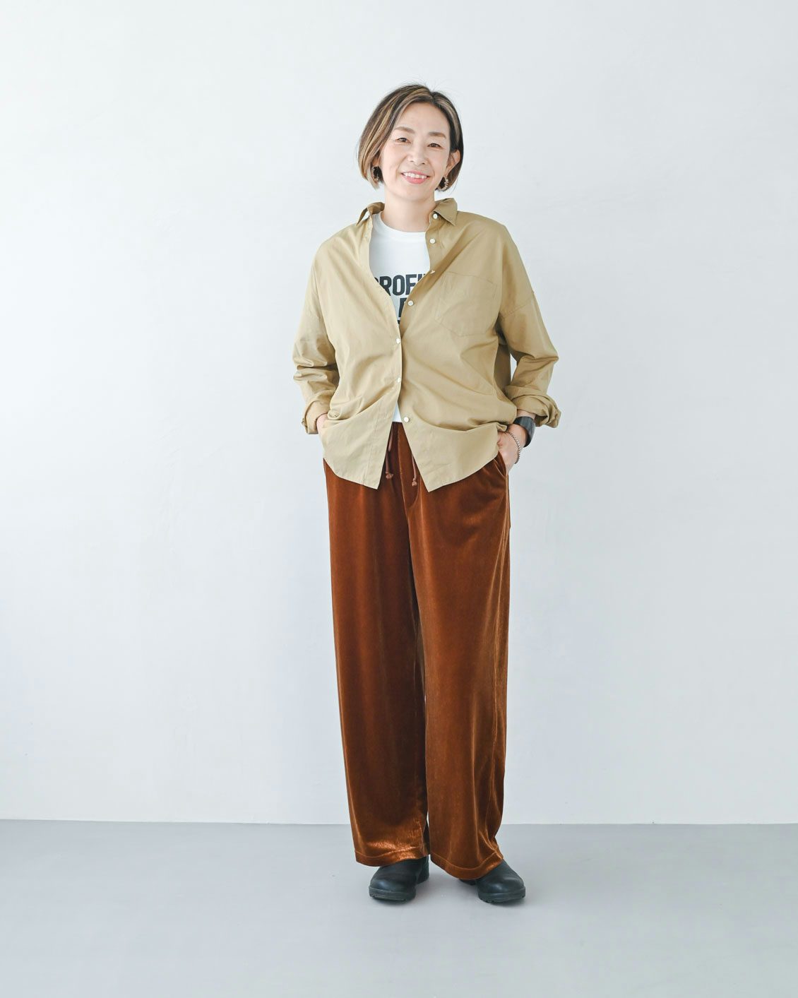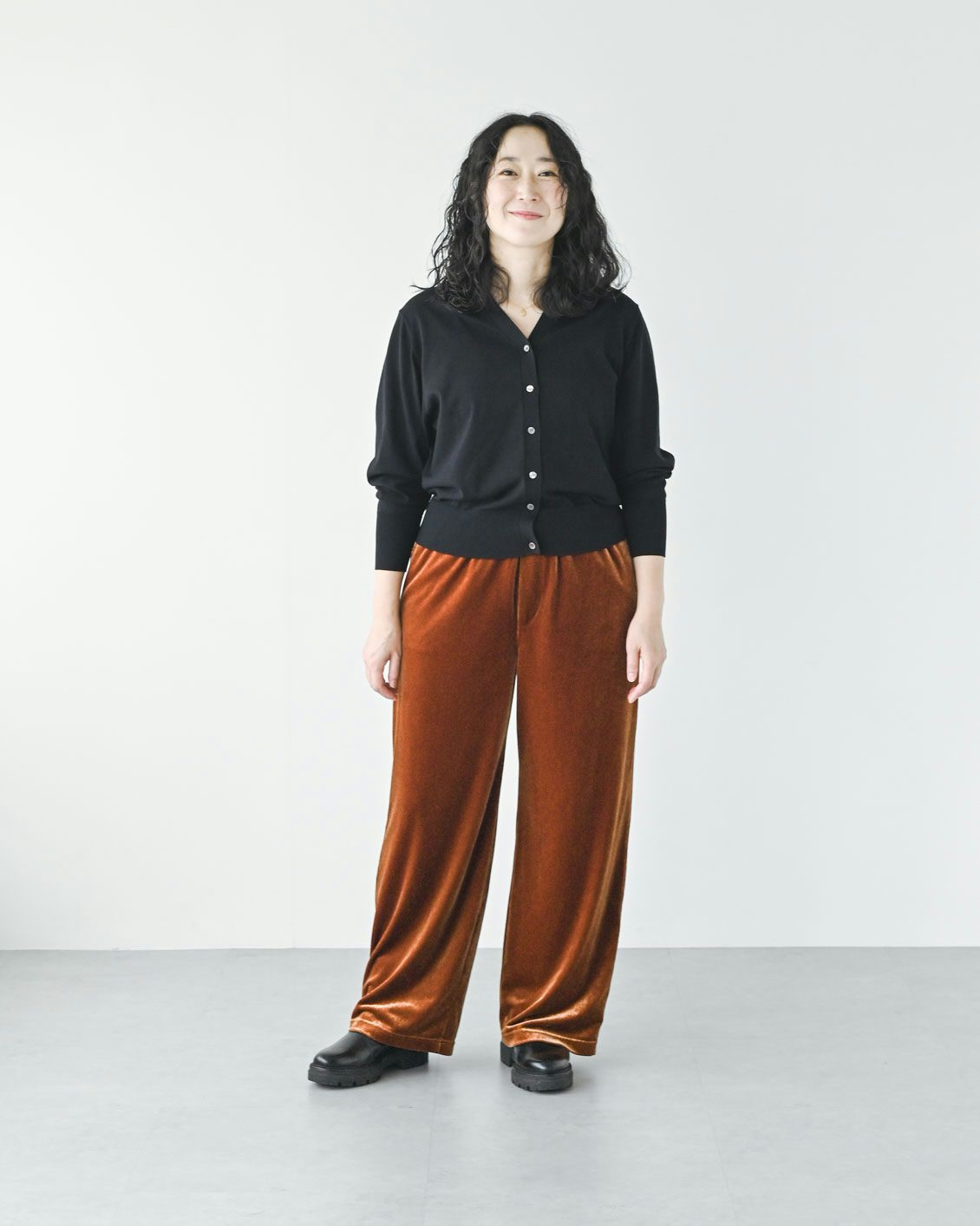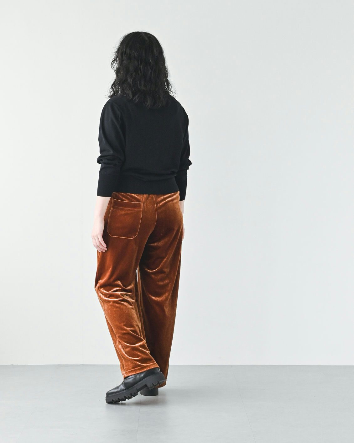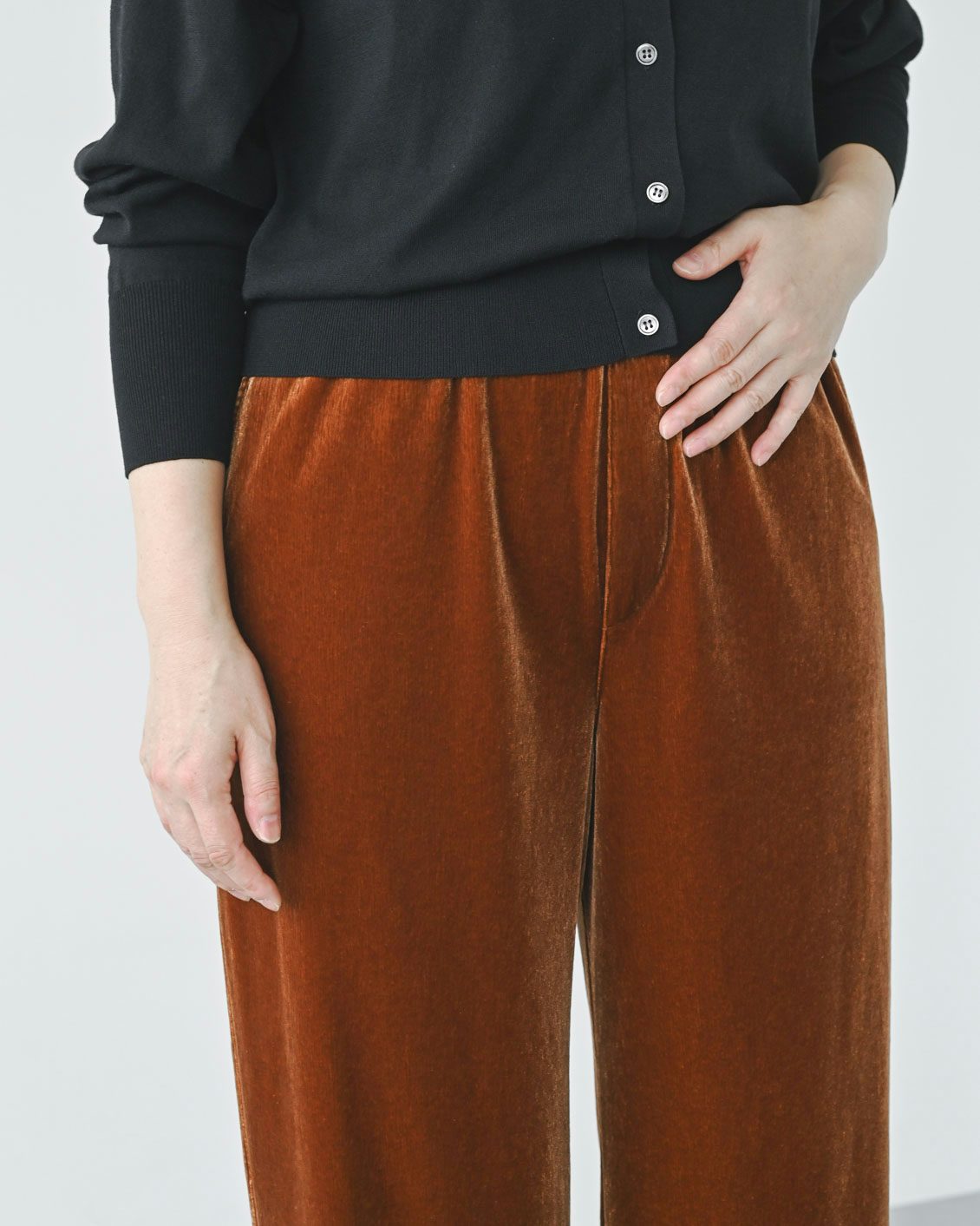 「ベロアパンツはチャレンジしてみたいアイテムでした。その上で気になっていたのが、ツヤのある生地が、腰やお尻まわりなどの体型を拾ってしまわないかという点。