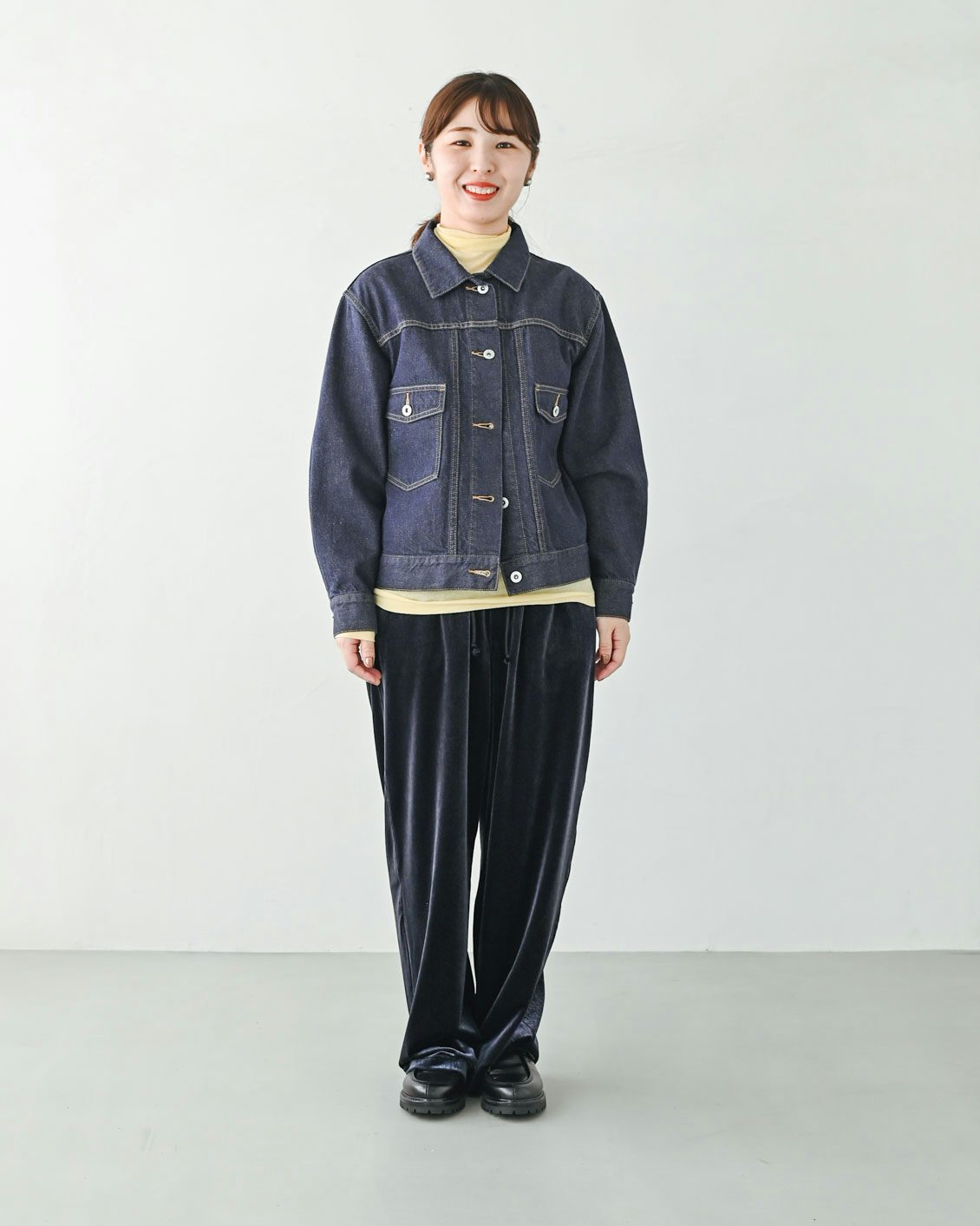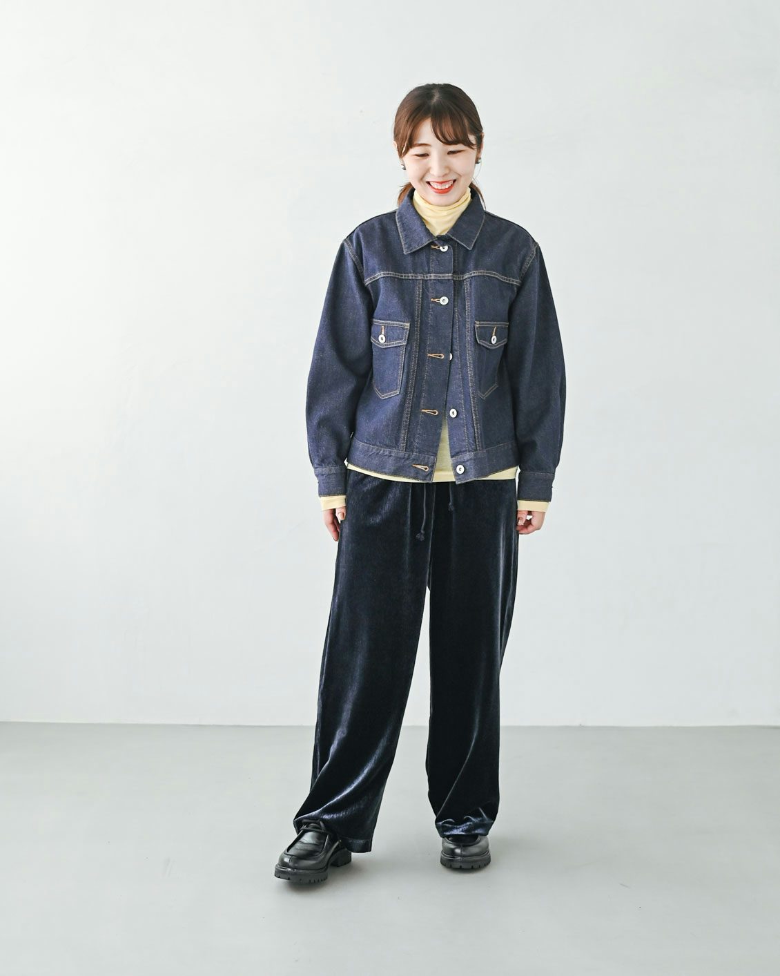 「秋らしい上品なネイビーですね。パンツと同系色のデニムジャケットに差し色でイエローのタートルネックを合わせてみました。色物とも相性がよく、着回しが効きそうです。