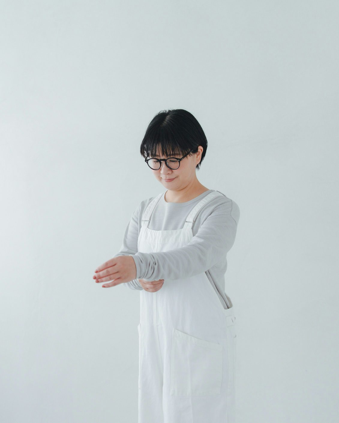 「このペールグレーは、白を合わせるよりもコントラストが弱まり、コーディネートに柔らかく馴染んでくれるのが良いですね。