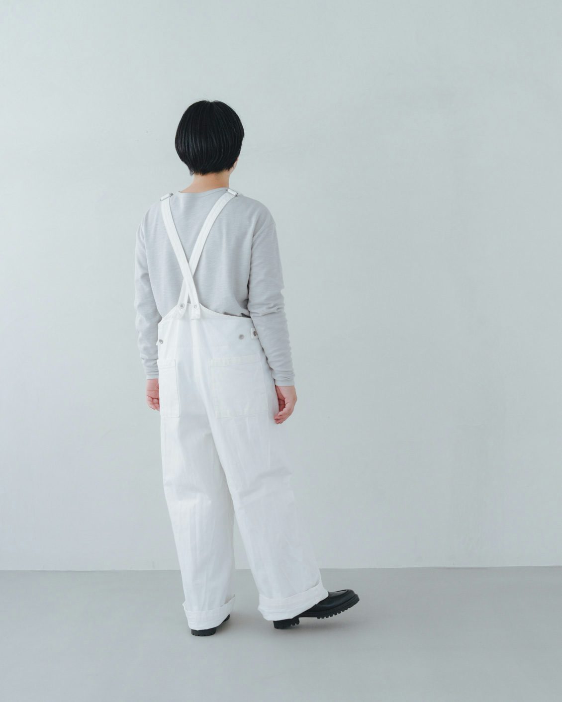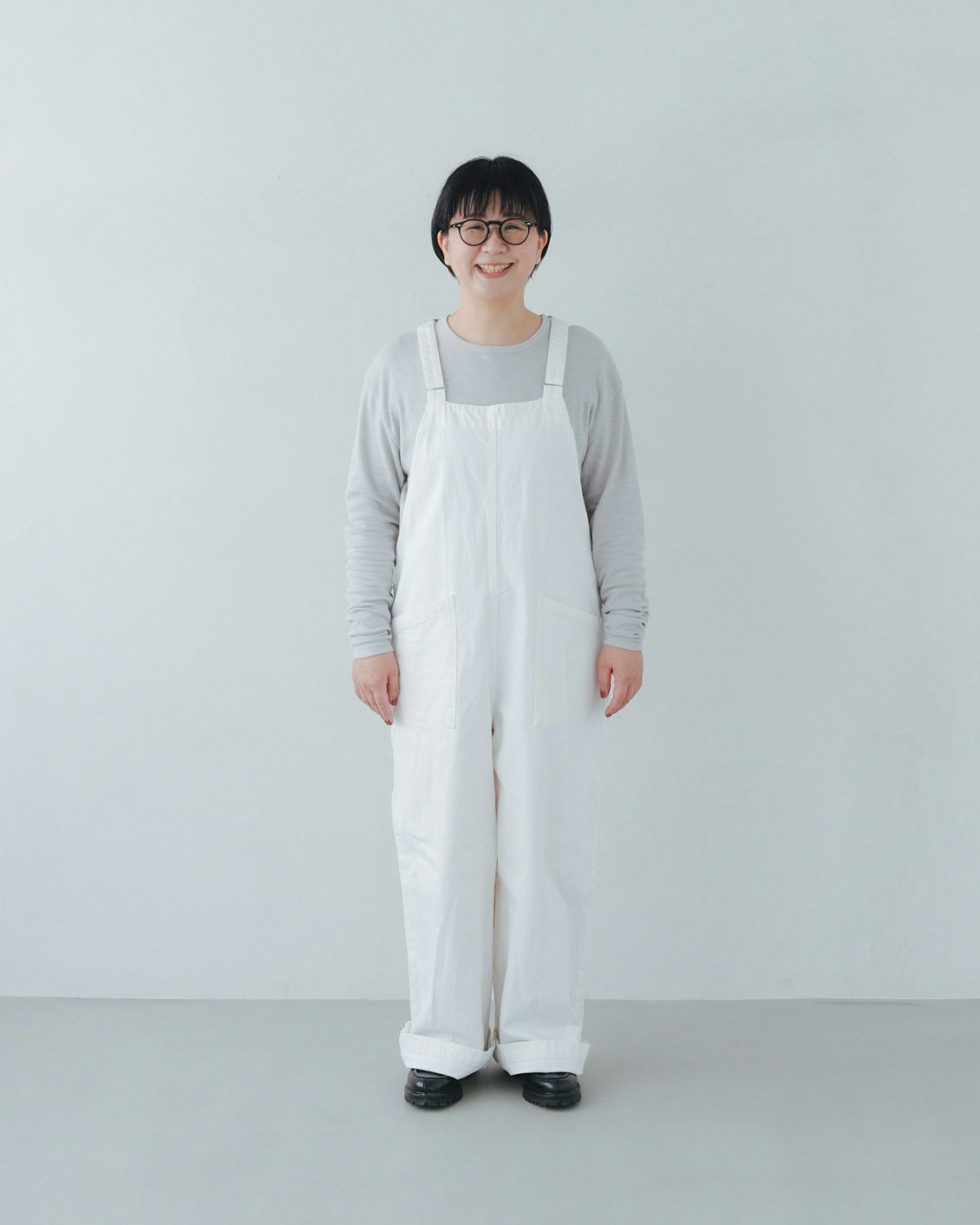 「スクエアヘムは、ペールグレーで、サロペットと合わせてみました。