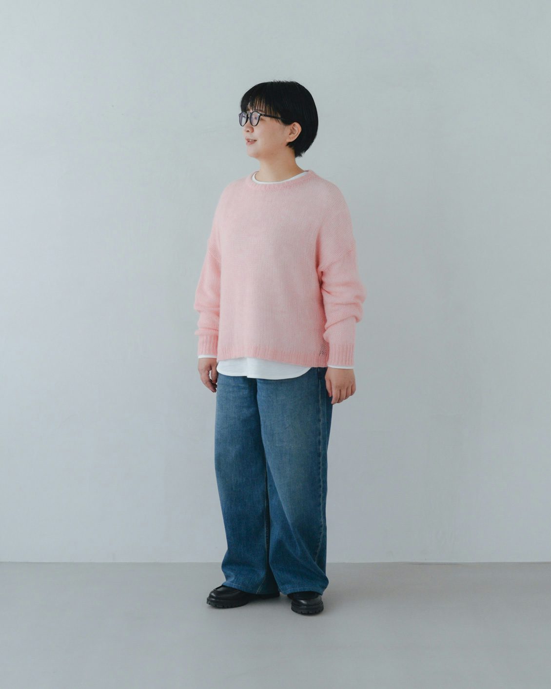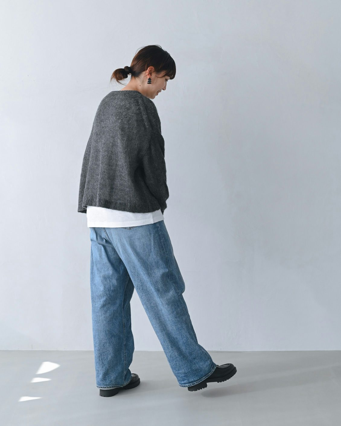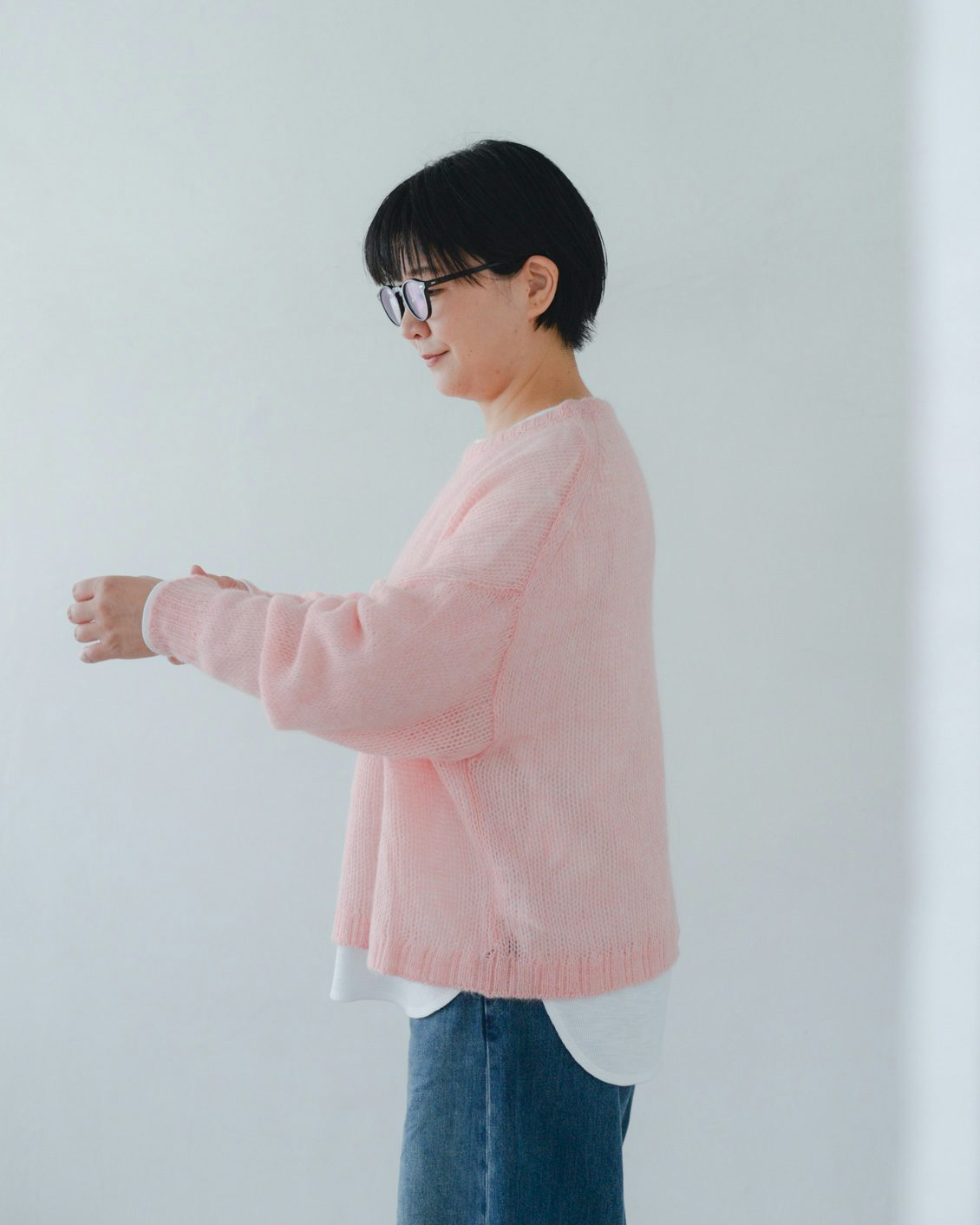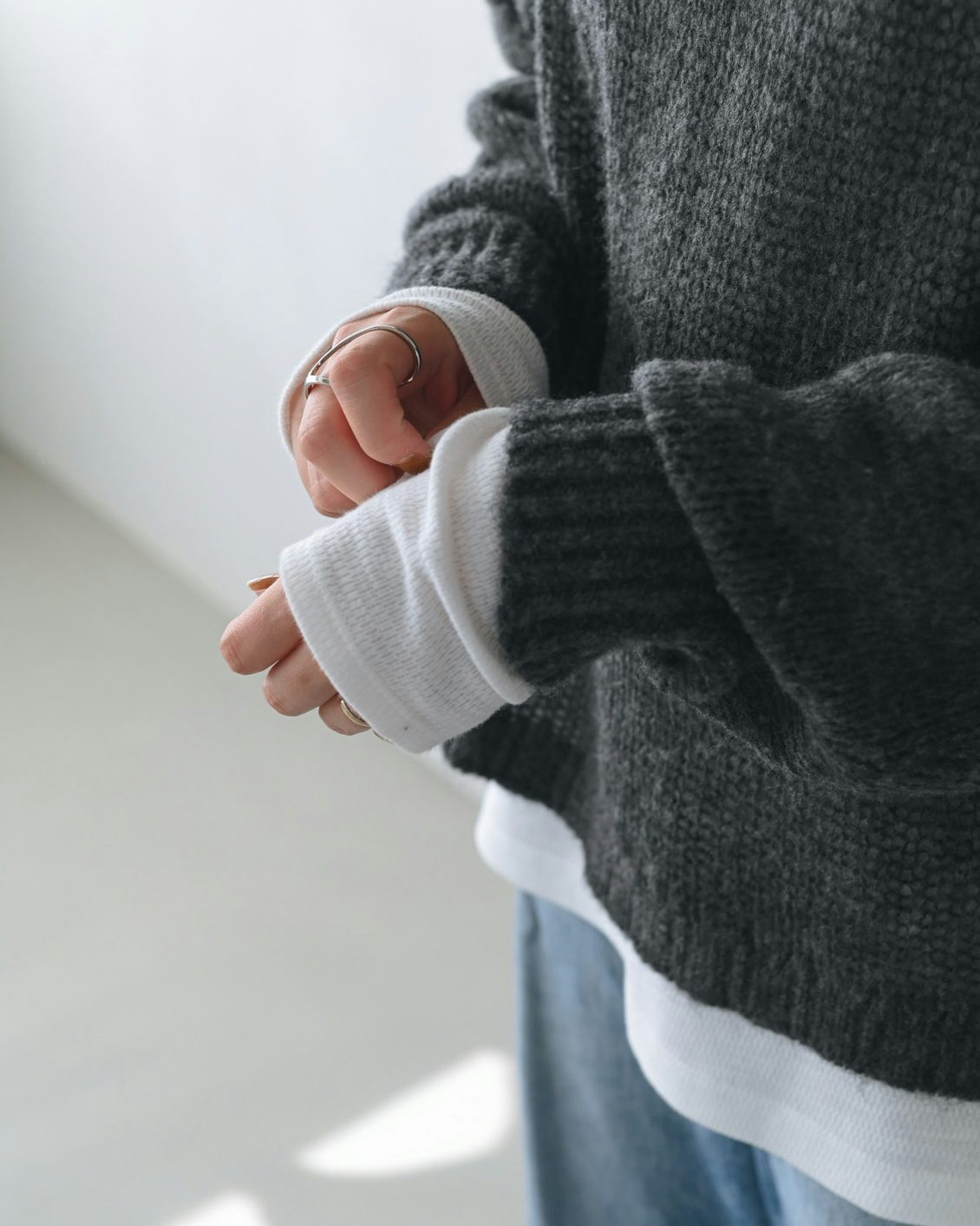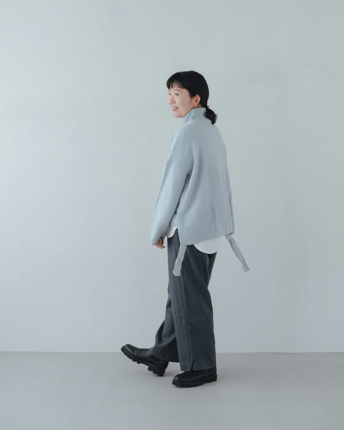 ネックラインもニットの開き具合にちょうど良く、袖口から見えるコットンスラブのニュアンスある素材感が、コーディネートの良いアクセントになってくれました」