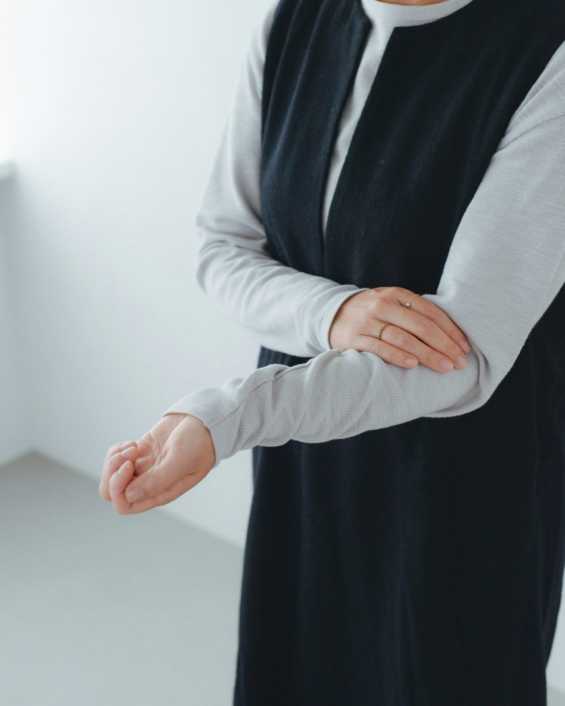 袖が長めなのも、重ね着した時にバランスが取りやすいなと感じました。 袖口が細くなっているので、ほんの少しフィット感はありますが、着ていて気になるほどではありません。