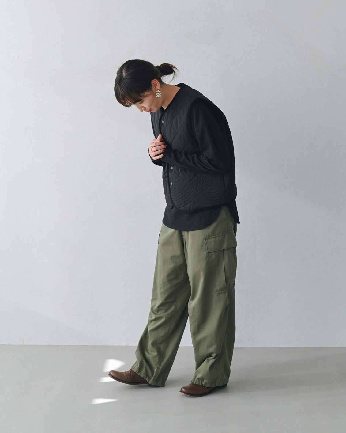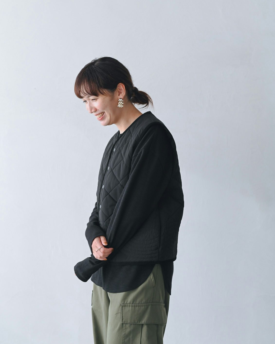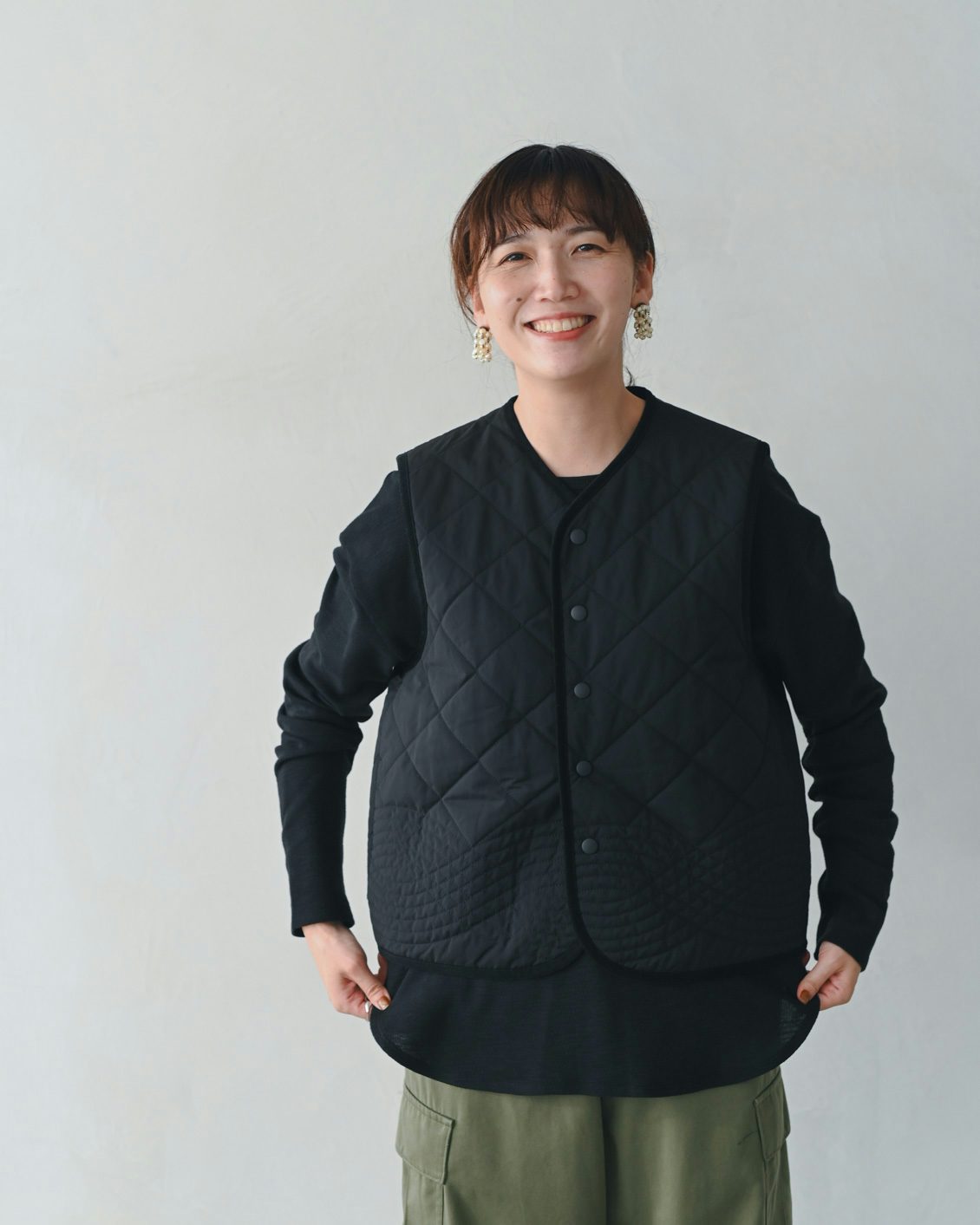 今回はキルティングベストを合わせてみましたが、黒のワントーンでまとめるのもいいですね。 これからの季節、ベストのインナーとしても活躍してくれそう」