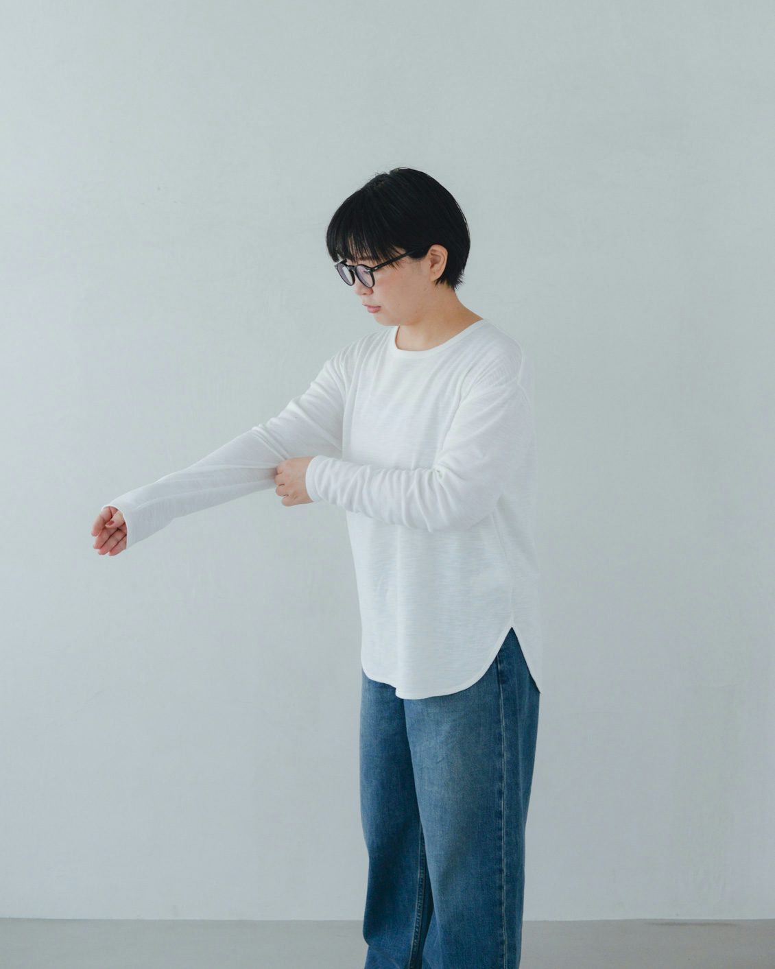 「これまでコットンスラブという素材を意識して選んだことはなかったのですが、実際に着てみるとストレッチ性があって着心地が良いですね。