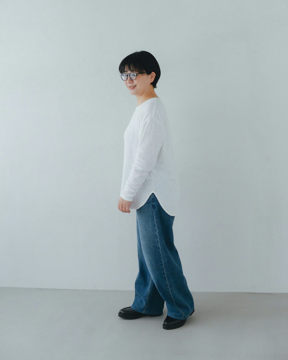 「シルエットがシャツのような雰囲気なので、 Tシャツながらラフになりすぎないところも良いなと思いました。実際にシャツを重ねると少しきちんとした印象になりますが、これならほどよい抜け感が出せそうです。