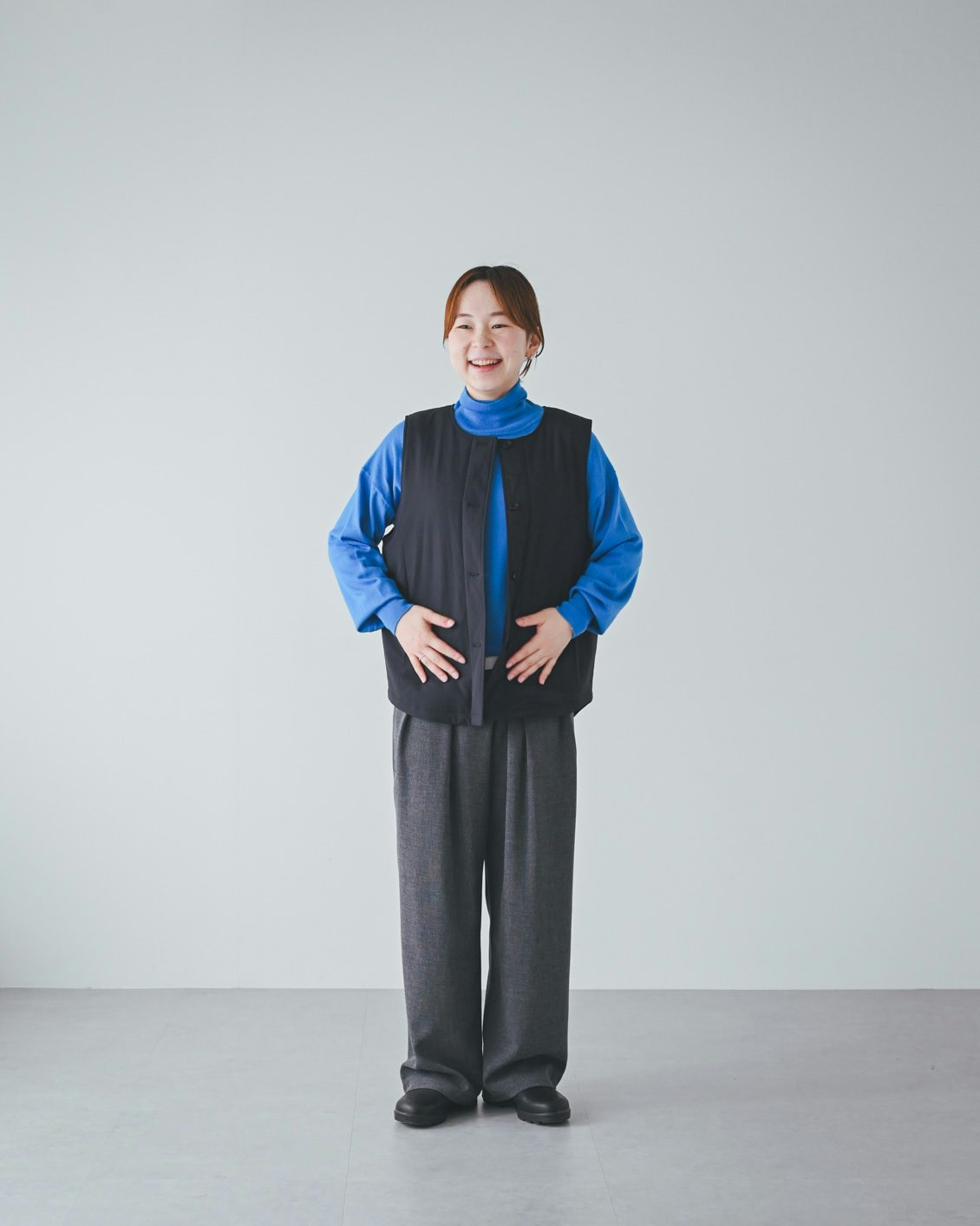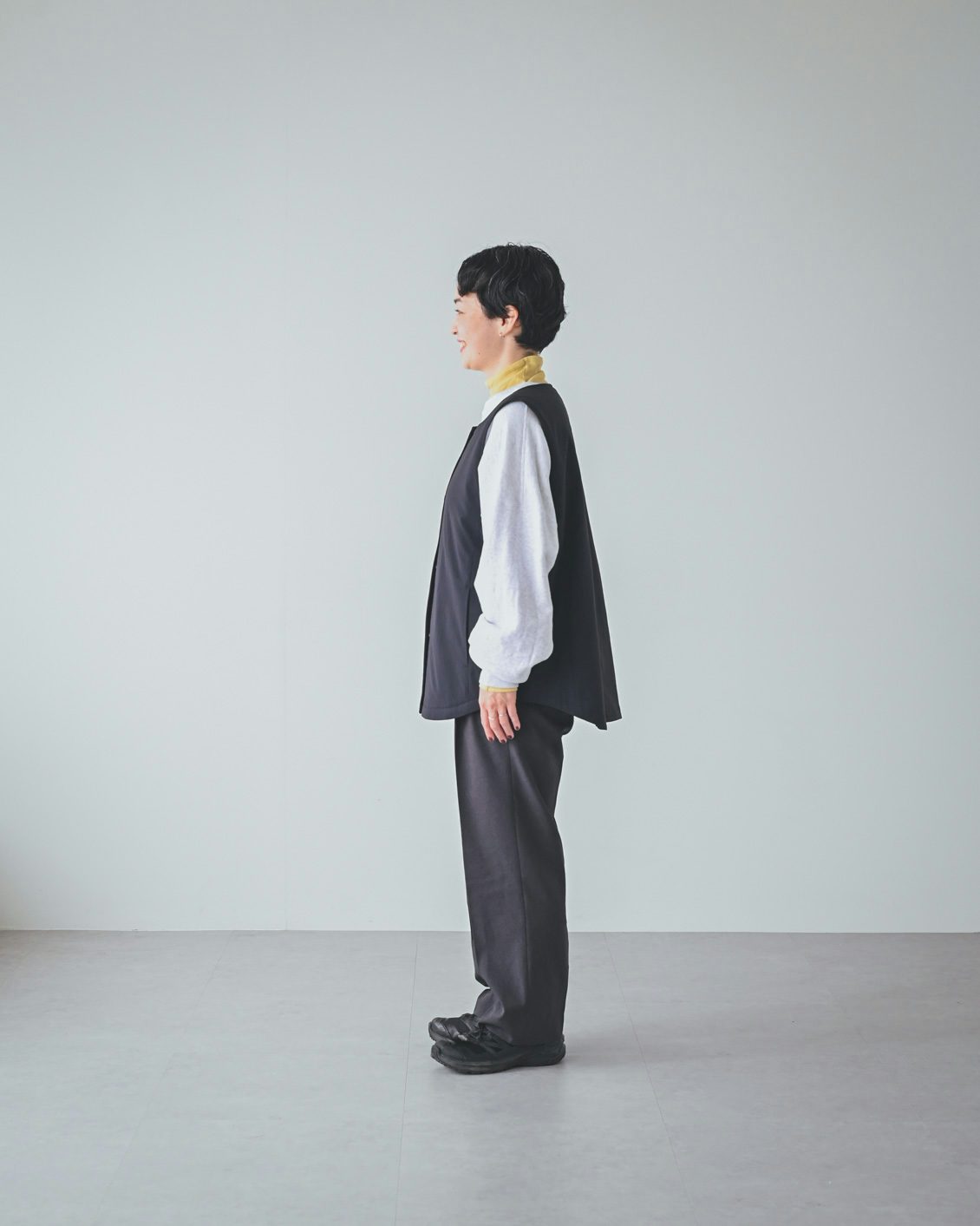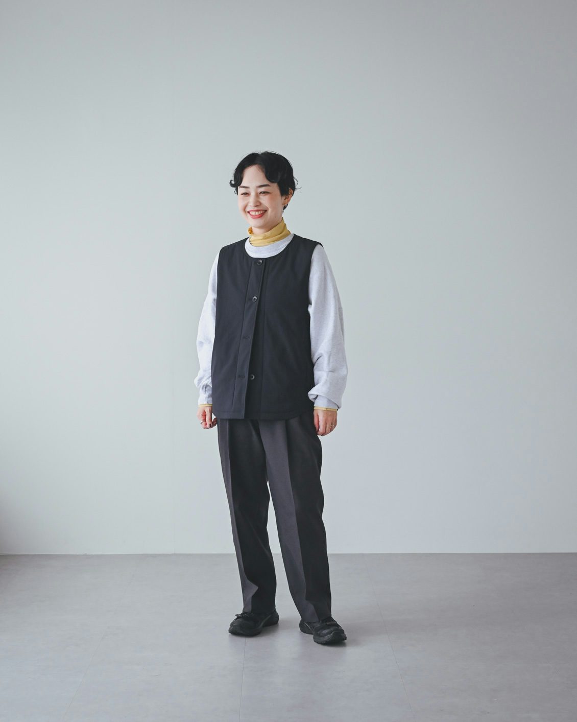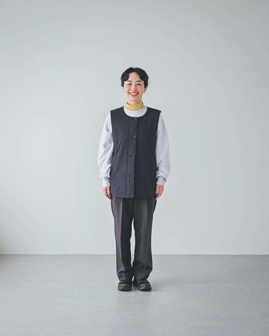 「ベストはライナー的な機能性がありつつ、普通に洋服として使えるデザインなのが嬉しいです。手持ちのコートに忍ばせてもいいですし、こうしてベスト単体でのコーディネートもできますね。