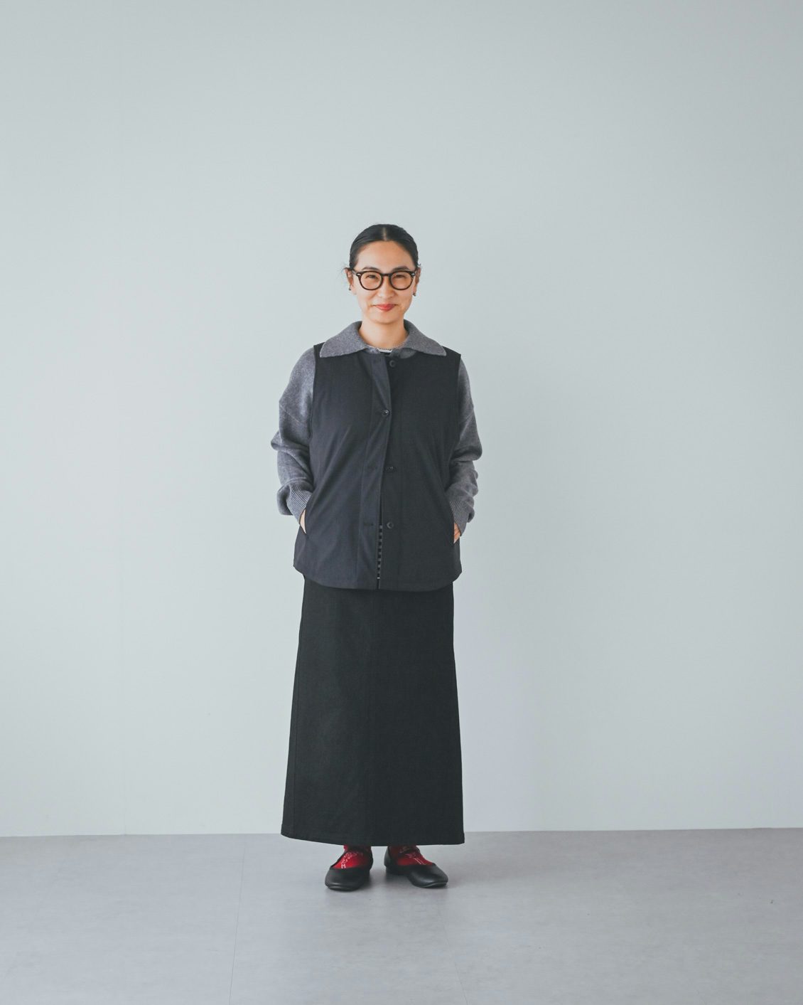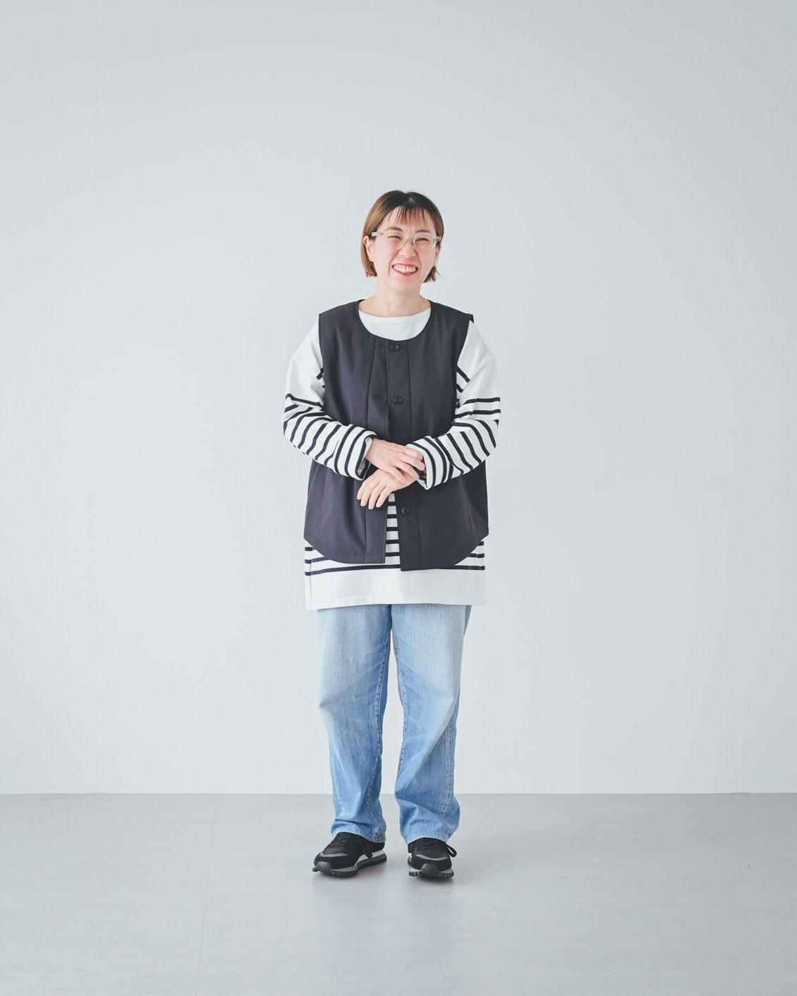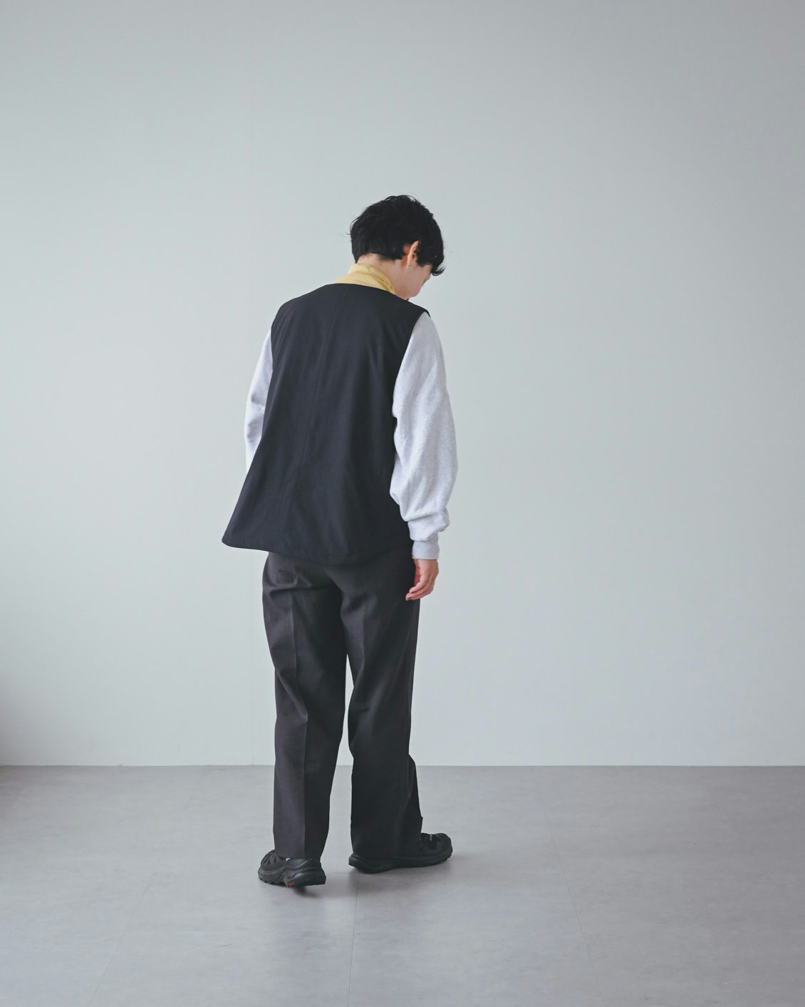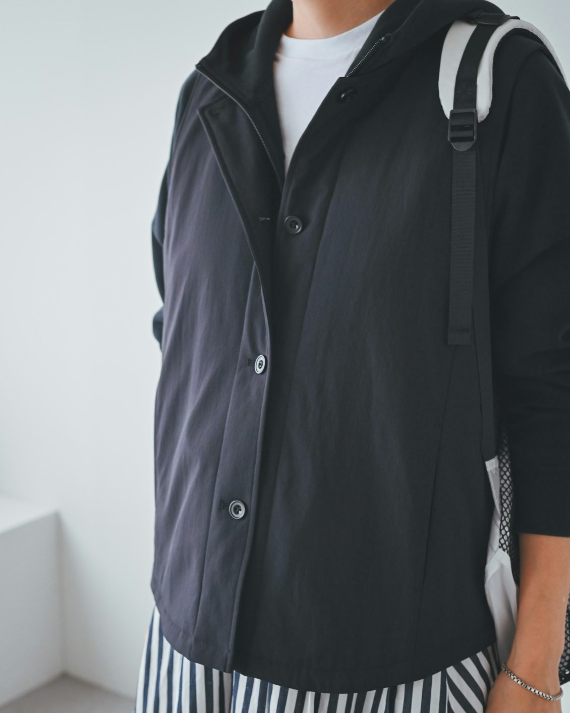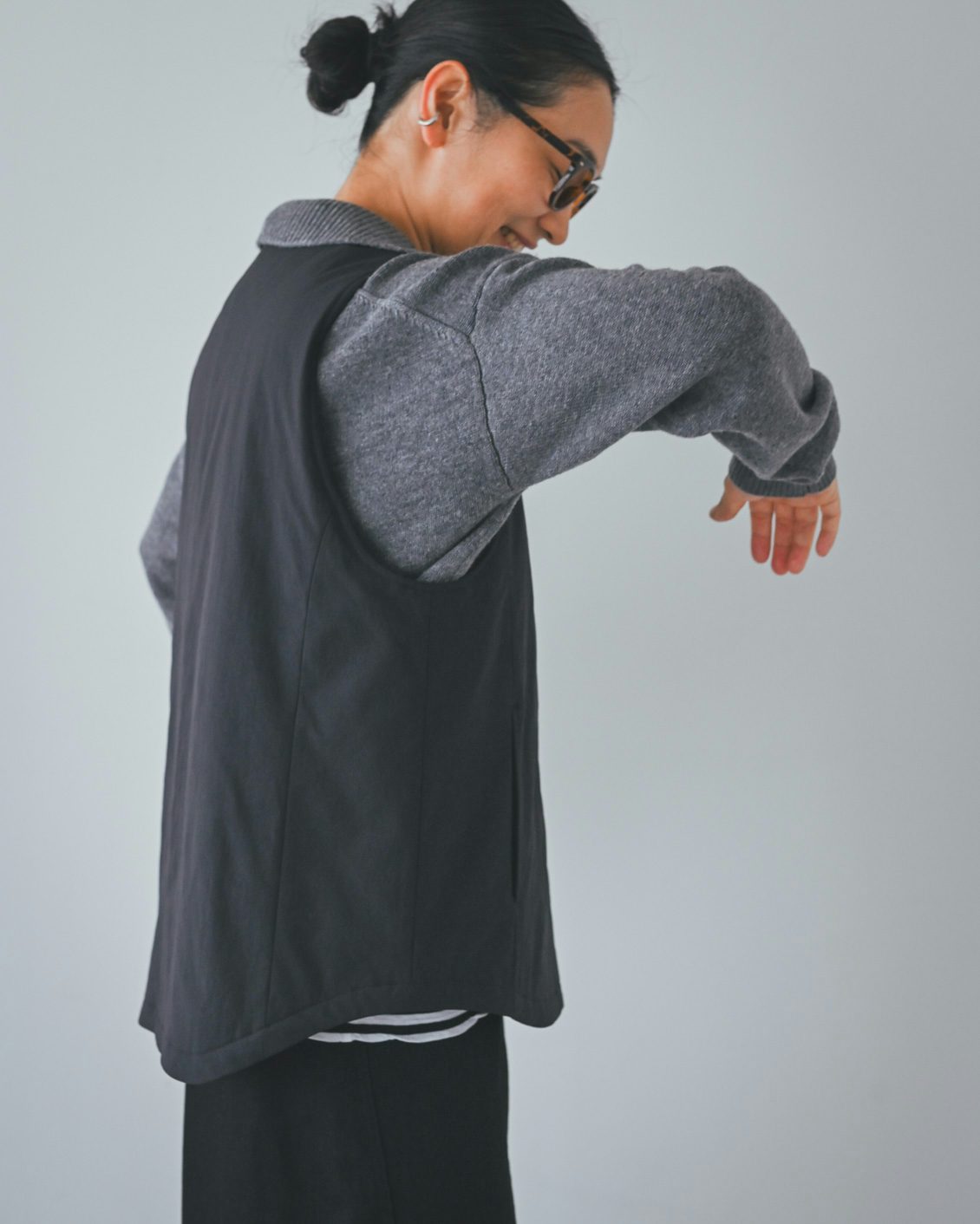 「ベストはライナー的な機能性がありつつ、普通に洋服として使えるデザインなのが嬉しいです。手持ちのコートに忍ばせてもいいですし、こうしてベスト単体でのコーディネートもできますね。