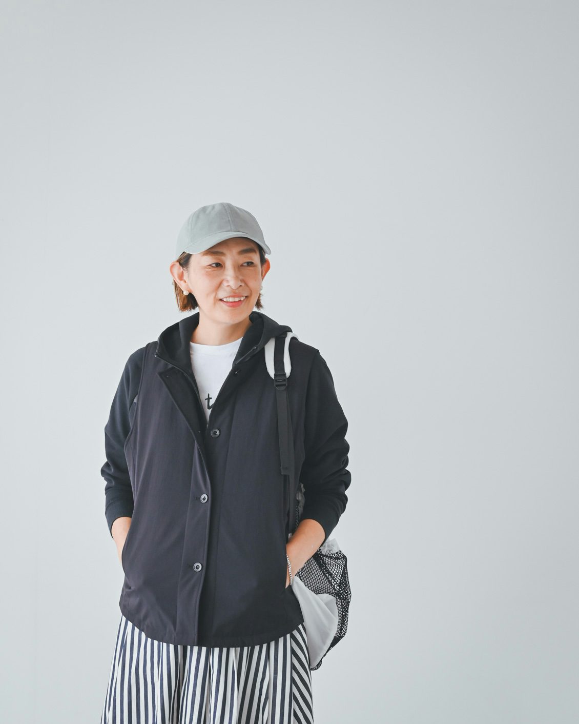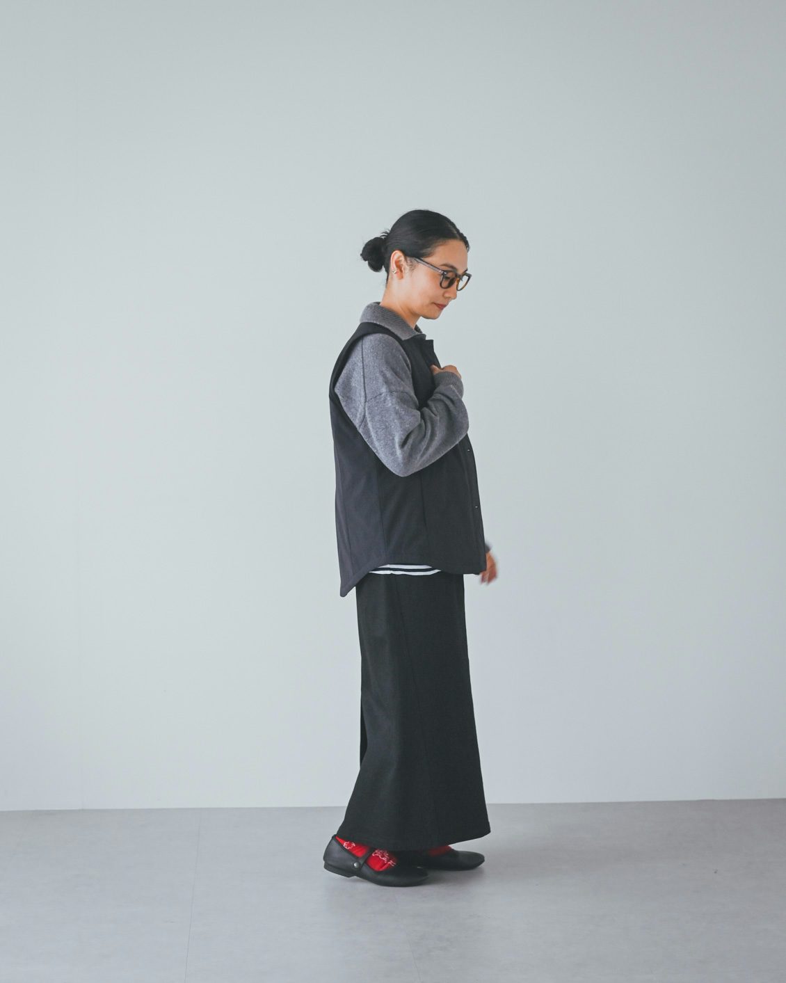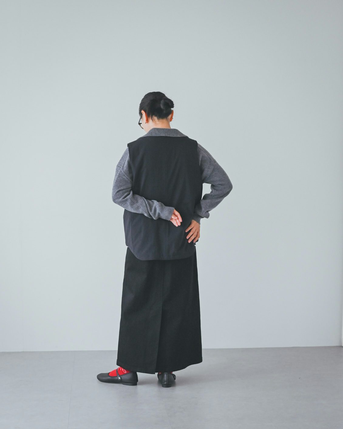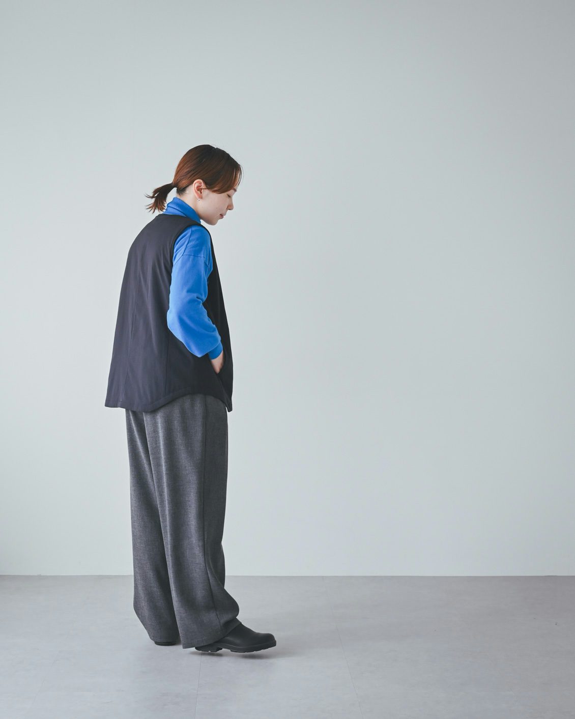 「ベストはライナー的な機能性がありつつ、普通に洋服として使えるデザインなのが嬉しいです。手持ちのコートに忍ばせてもいいですし、こうしてベスト単体でのコーディネートもできますね。