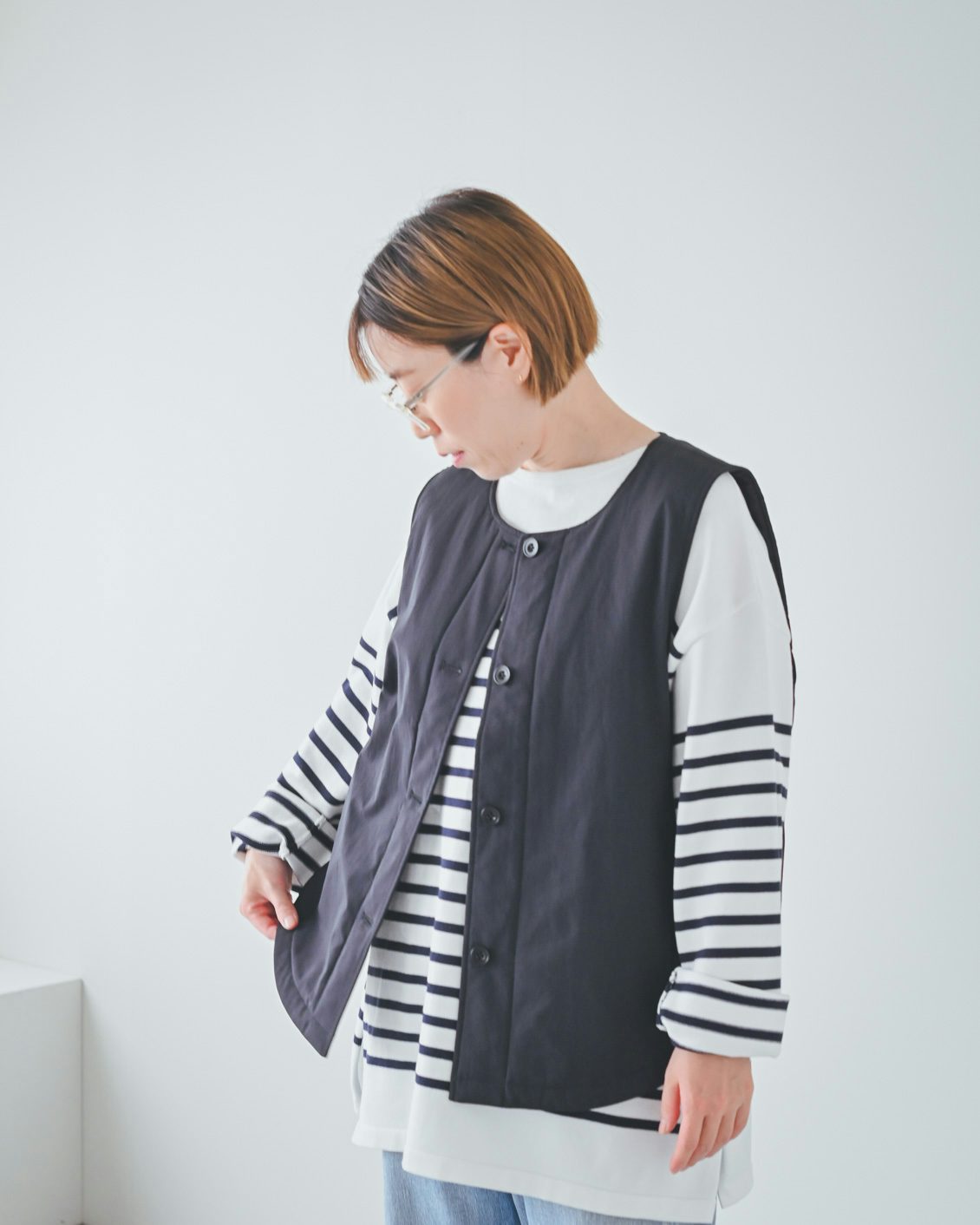 また寒い日のデパートなど、出かけ先の室内で暖房が効きすぎて具合が悪くなる時があるのですが、これはベストの有無で細やかに調整できて嬉しい。季節もほとんど選ばないですし、安心して毎日着られるなと思いました」