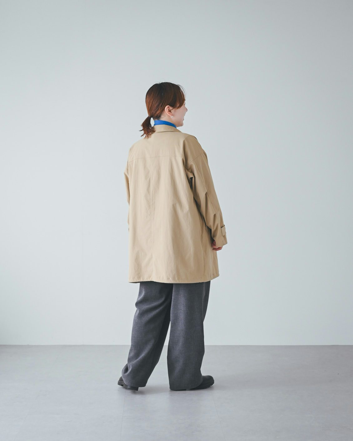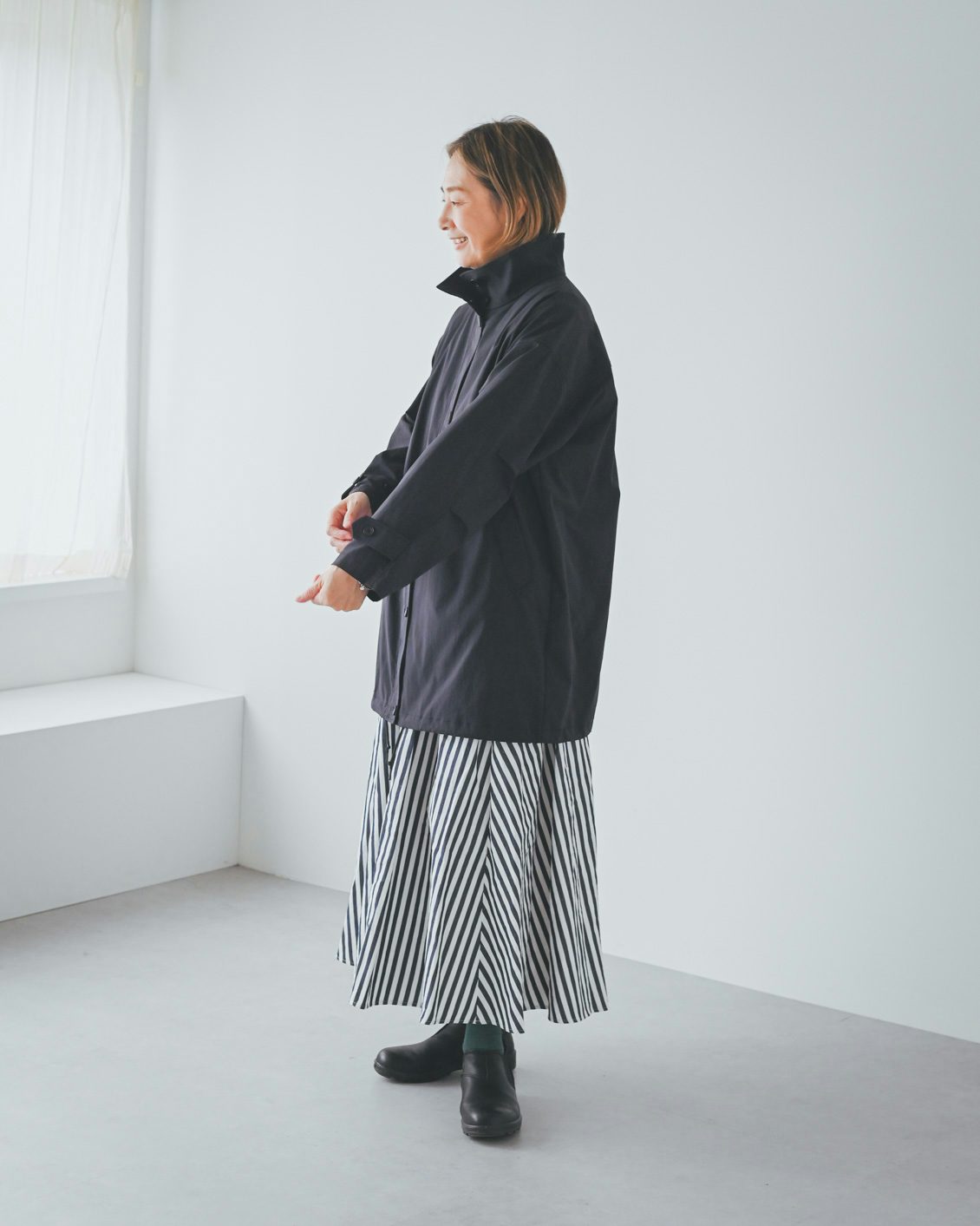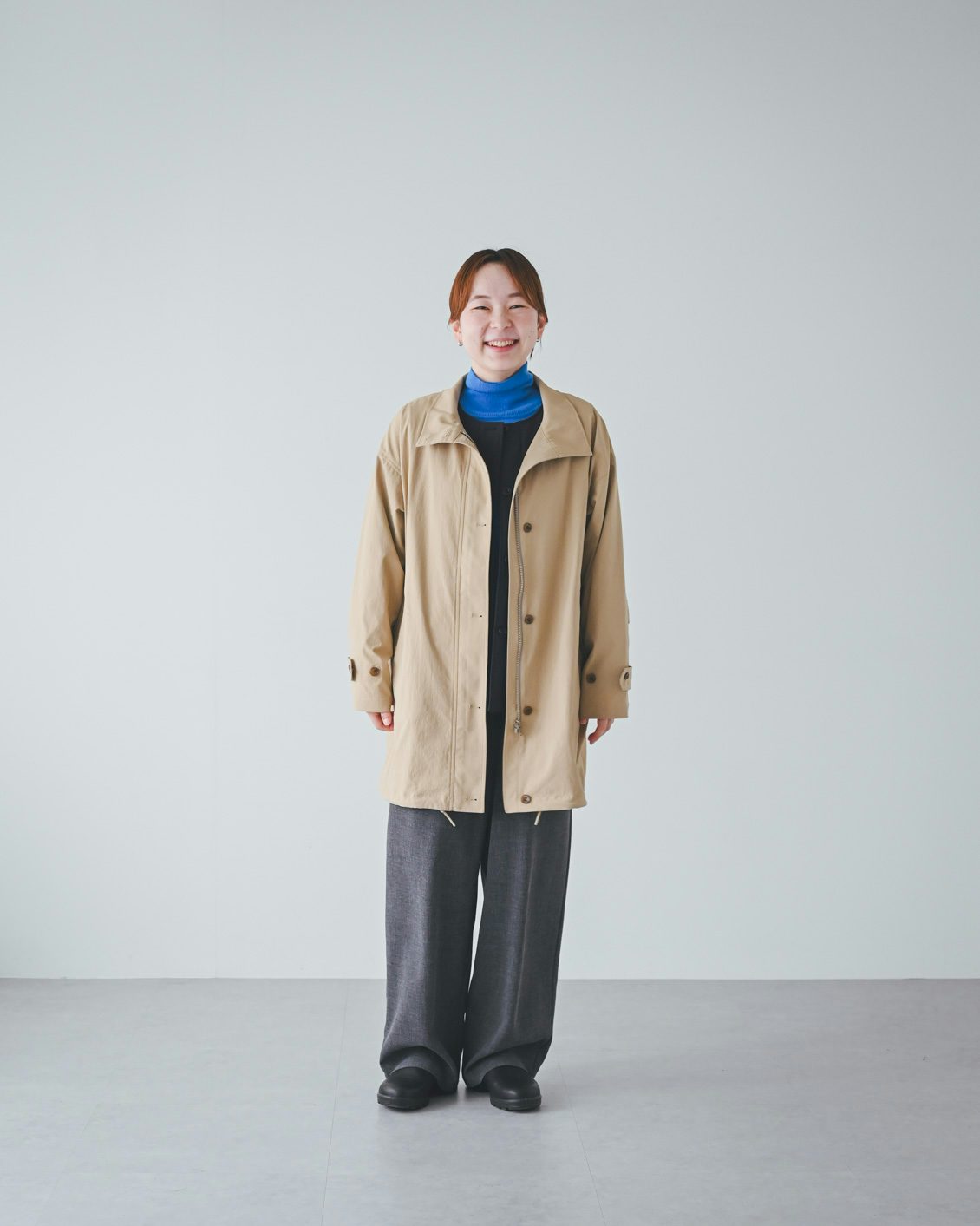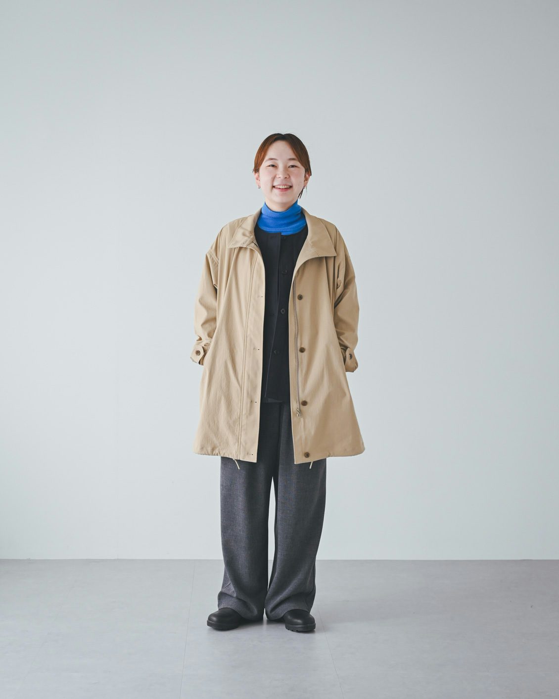 体型的にミドル丈だとバランスよく着こなすのが難しいかな?と最初は心配していたのですが、いざ着てみると、意外と何も工夫をしなくてもバランスがとれました。ボトムスやインナー、足元の合わせに悩まなくていいので、朝の支度も楽になりそうです」