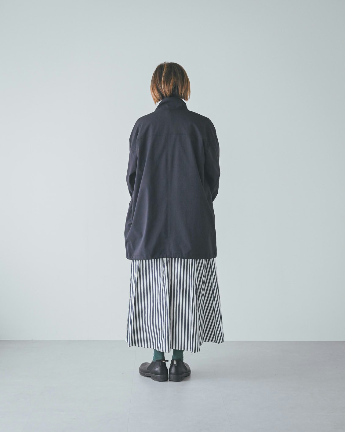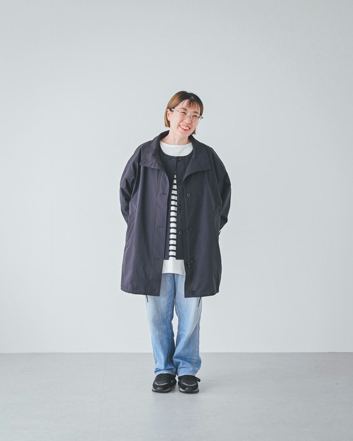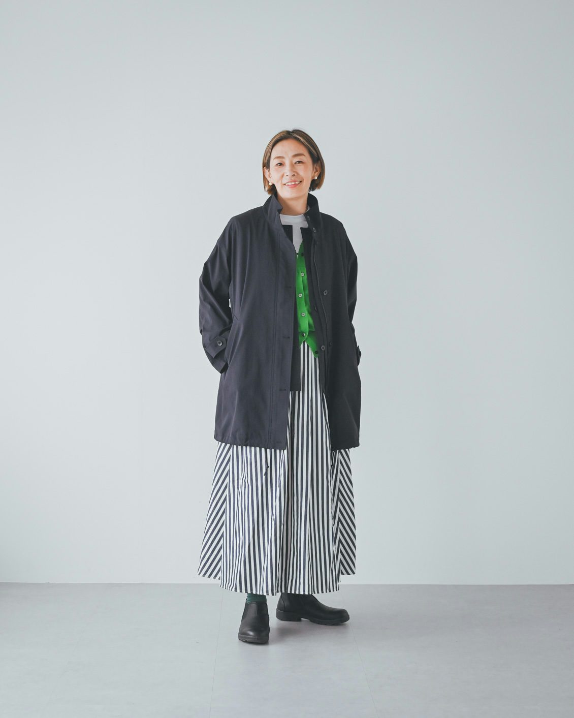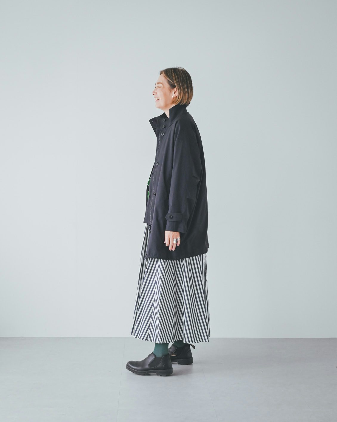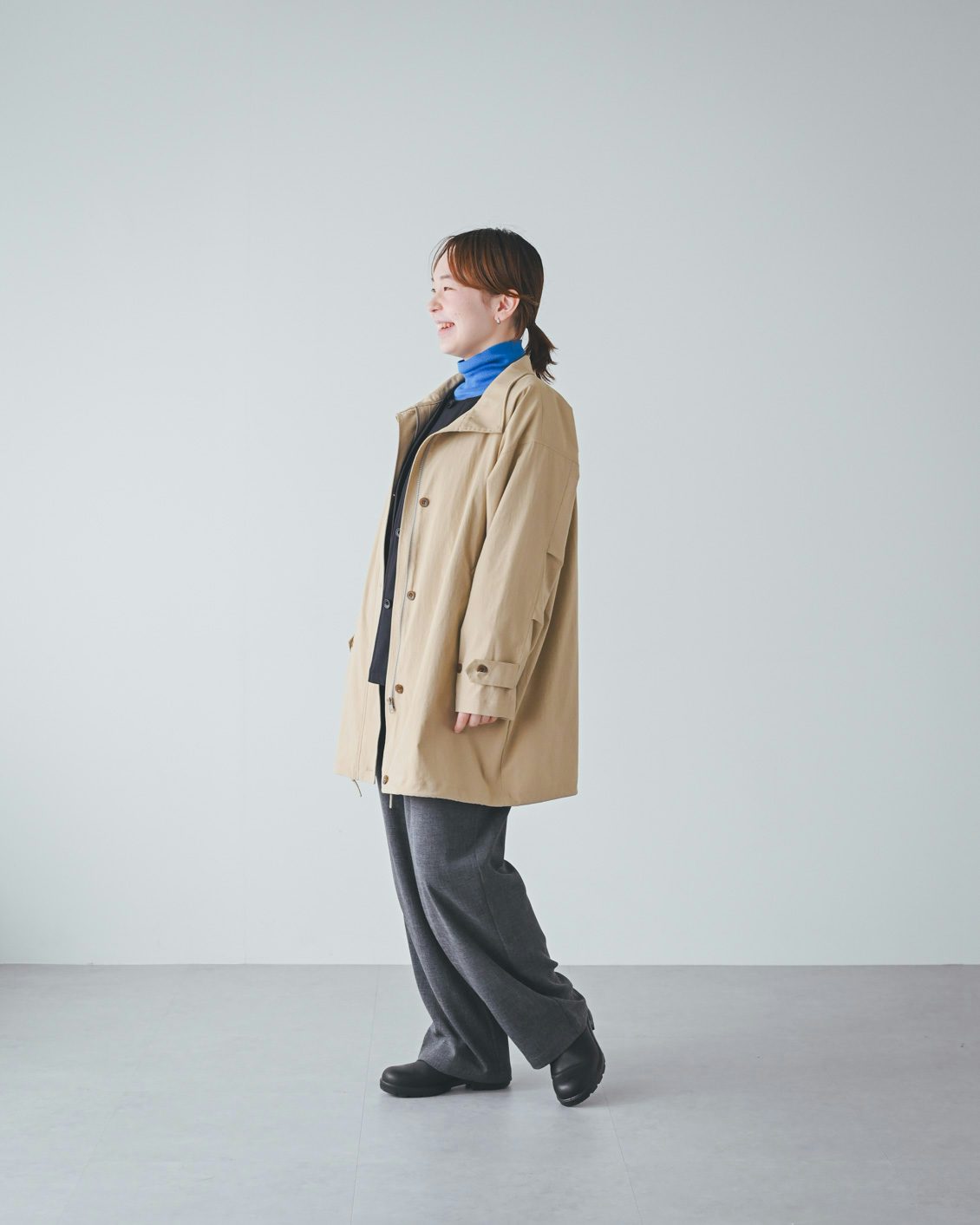 体型的にミドル丈だとバランスよく着こなすのが難しいかな?と最初は心配していたのですが、いざ着てみると、意外と何も工夫をしなくてもバランスがとれました。ボトムスやインナー、足元の合わせに悩まなくていいので、朝の支度も楽になりそうです」