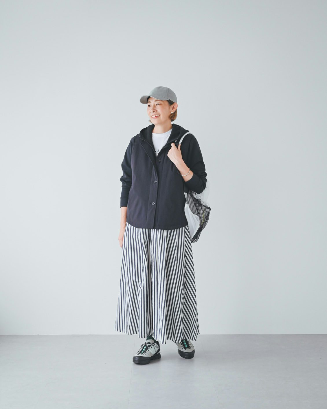 私の身長だと、ベストの着丈はお尻が隠れるくらい。袖周りが大きい設計なので、ゆったりとしたトップスを着ても、もたつくことはありませんでした」