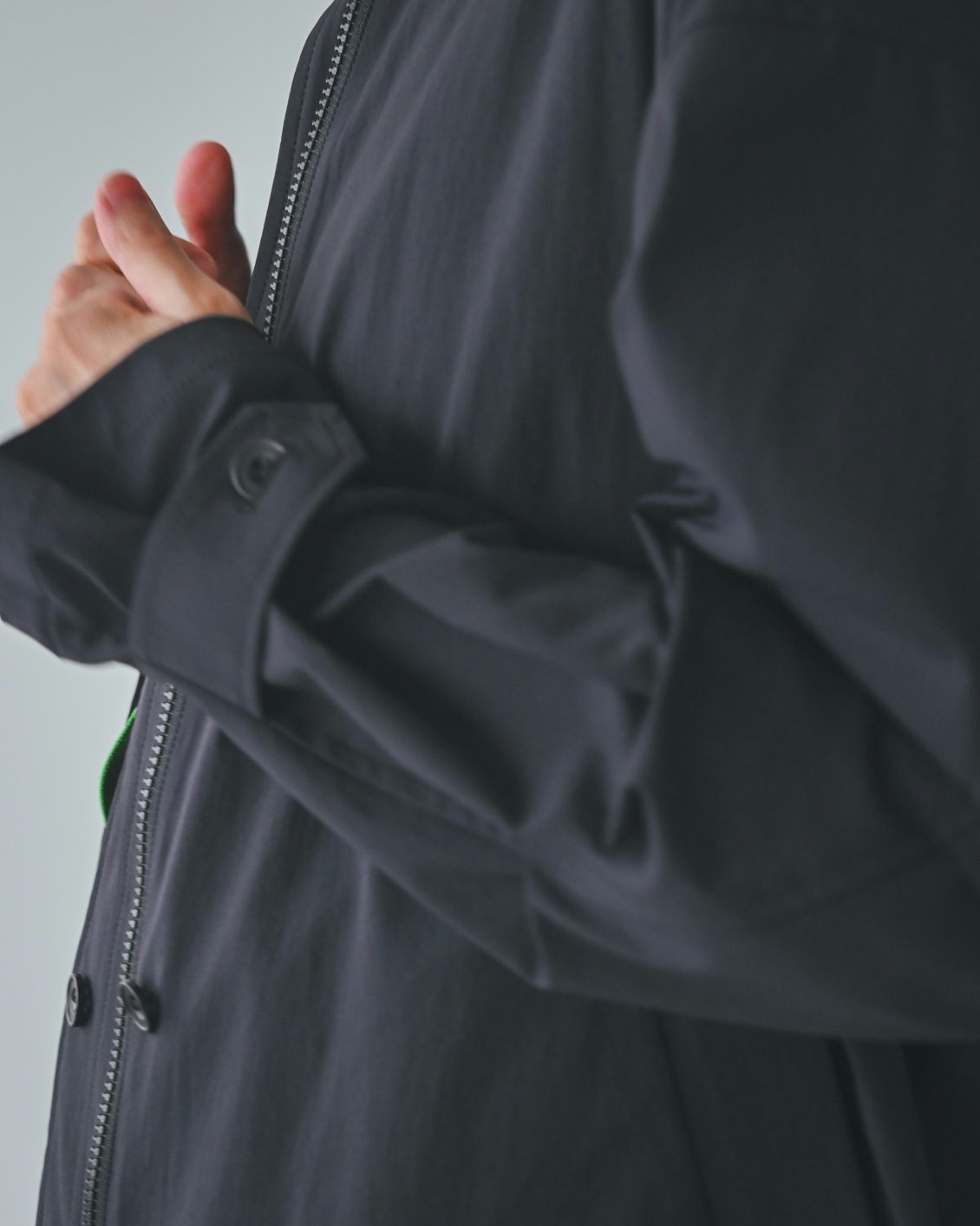 「このコートは、パッと見た印象だと綿のような、ちょっとハリがある生地に見えますが、実際に触ると非常に薄手で、柔らか。サラッと着られる軽さで、ストレッチ性のある生地ですが、見た目がスポーティーすぎないところがいいですね。シワがつきづらく、形を綺麗にキープしてくれそうだなと思いました。